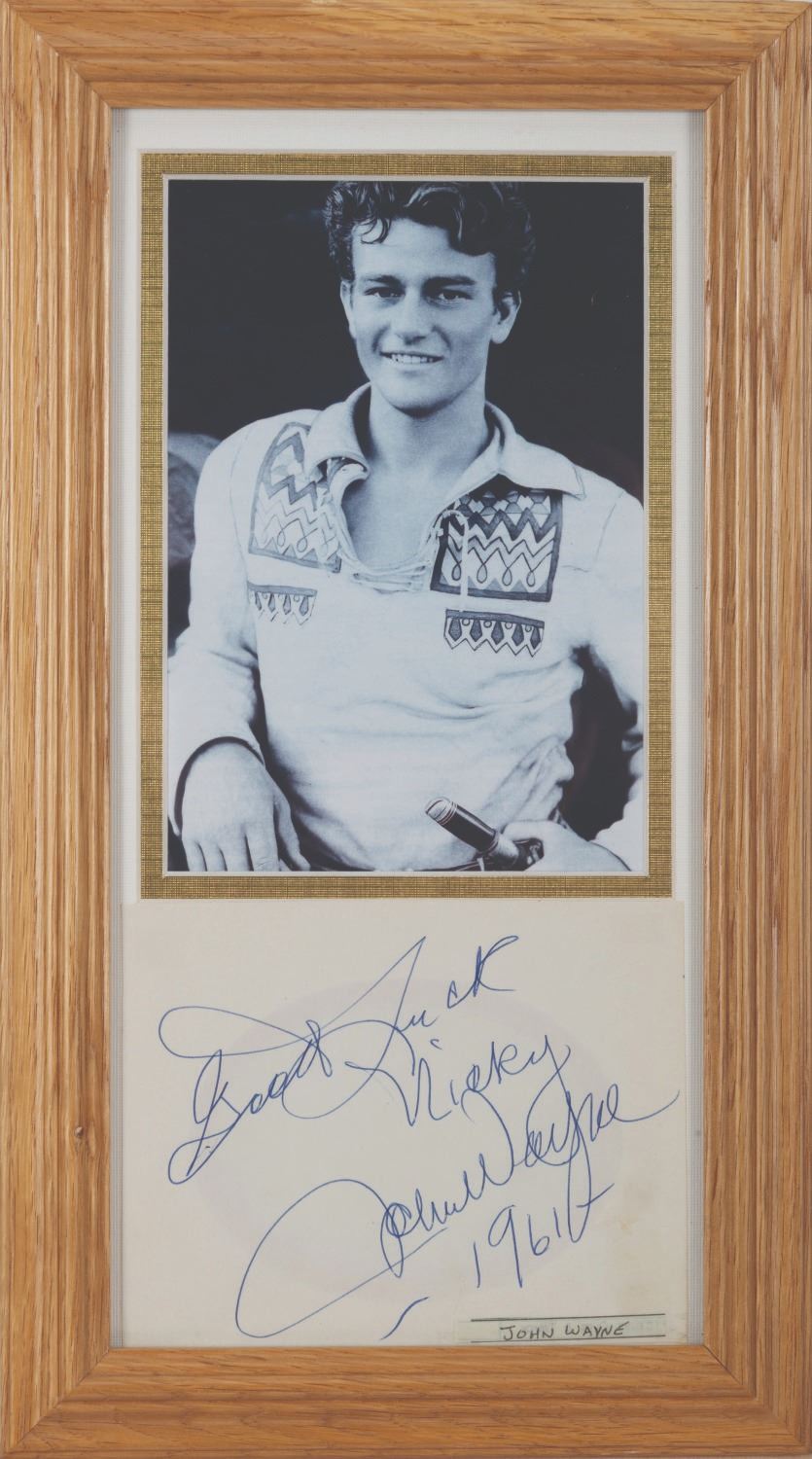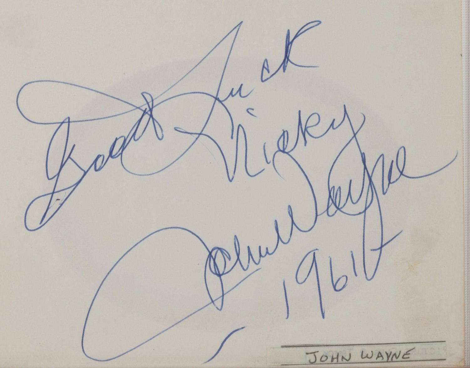 (John Wayne, 1961) A John Wayne signature, with a photo of the actor as a young man. Wayne signed an autograph book page boldly with dedication to Nicky. The 4.25"x5.25" page and 4.5"x6.5" visible photo are presented in a 7.5"x13.75" frame, all in fine condition.