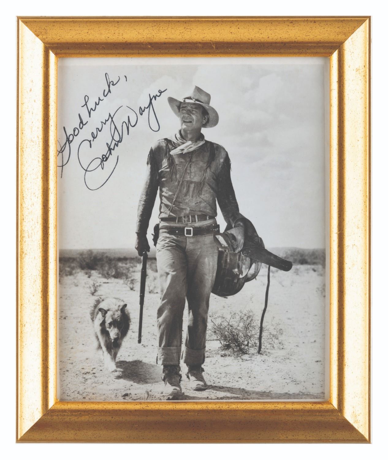 (John Wayne, 1970s) A signed publicity photo of Western and War movie icon, John Wayne, best known for his roles in "Stagecoach," "True Grit," and "Red River.” Wayne signed the top left of the corner in black ink with a dedication. Measuring 8” x 10” and presented in a frame measuring 12” x 10”, the photo is in fine condition.