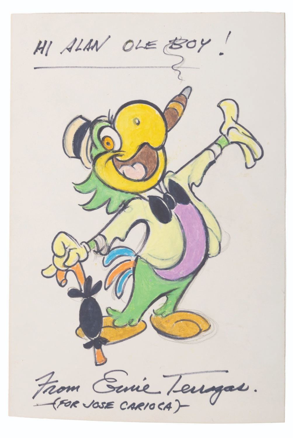 (Terrazas, 1970s-1980s) A Jose Carioca drawing by Ernie Terrazas, accomplished in marker and pastels. Terrazas signed and dedicated the art to super-collector Alan Hylton. Measuring 6" x 9", the art is in very good condition with light wear.
