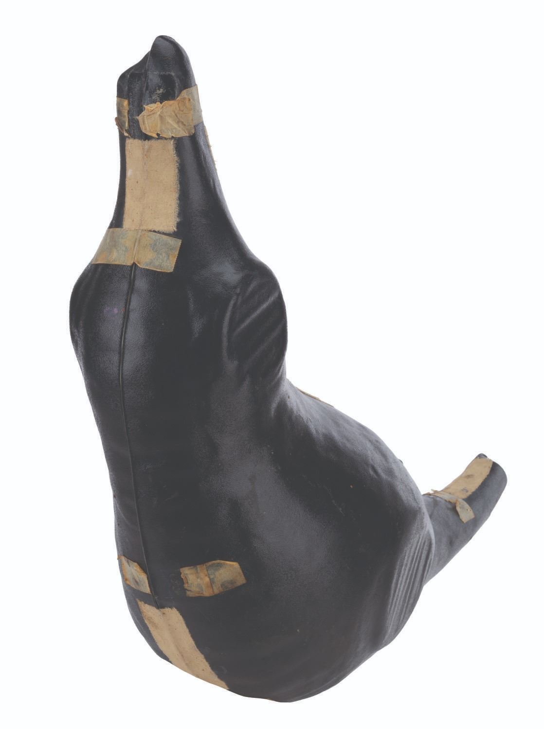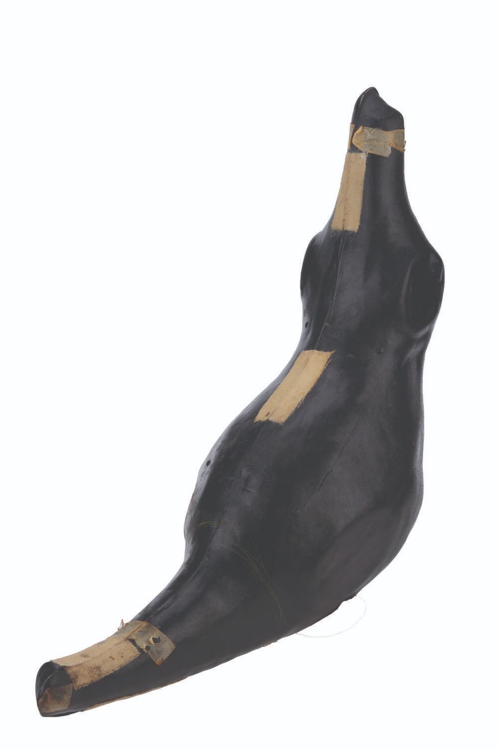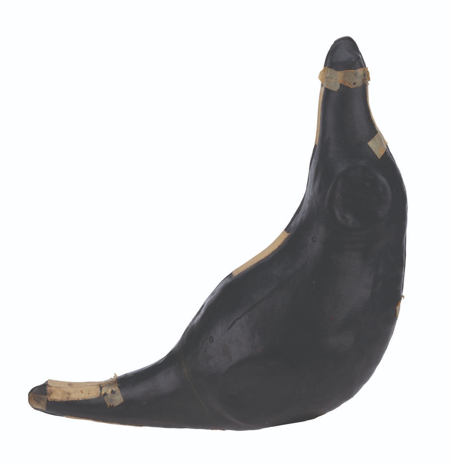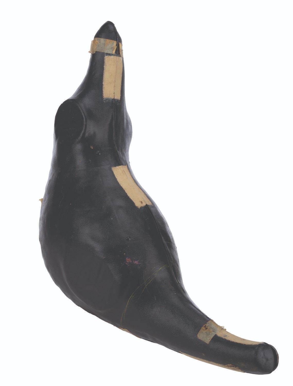 (EPCOT Center, 1983) A body form for a Figment animatronic from the Journey Into Imagination attraction at EPCOT Center. This form consists of two halves taped together, acting as a layer between the animatronic’s inner workings and the outer silicone-rubber skin. Measuring 15" x 7.5" x 28" tall, the form displays in good condition with heavy scratches, paint stains, and wear.