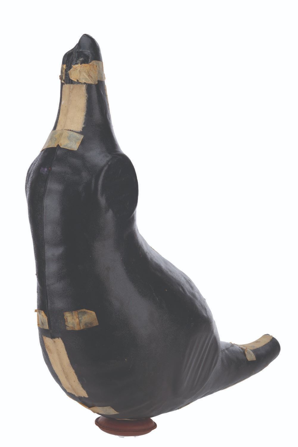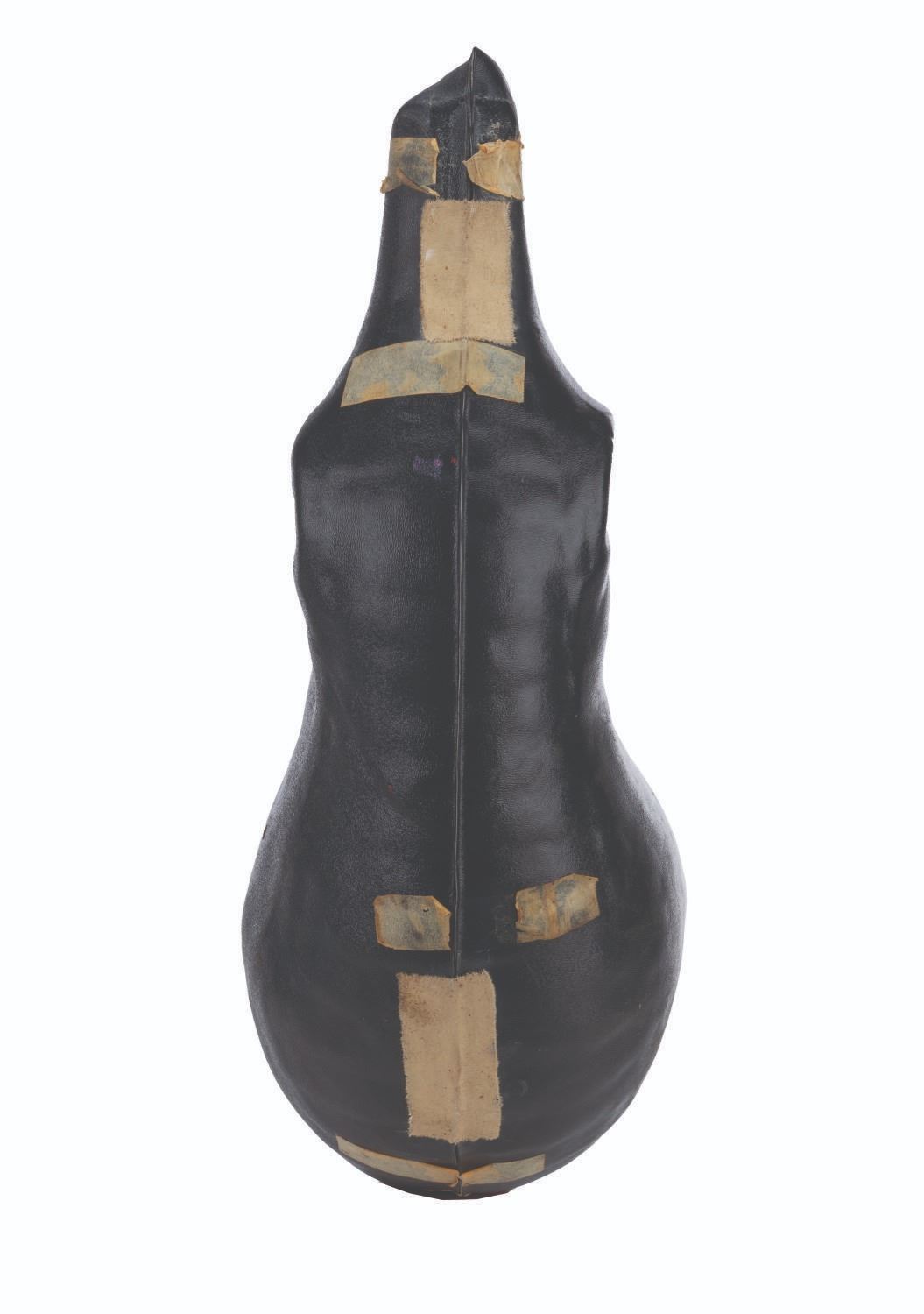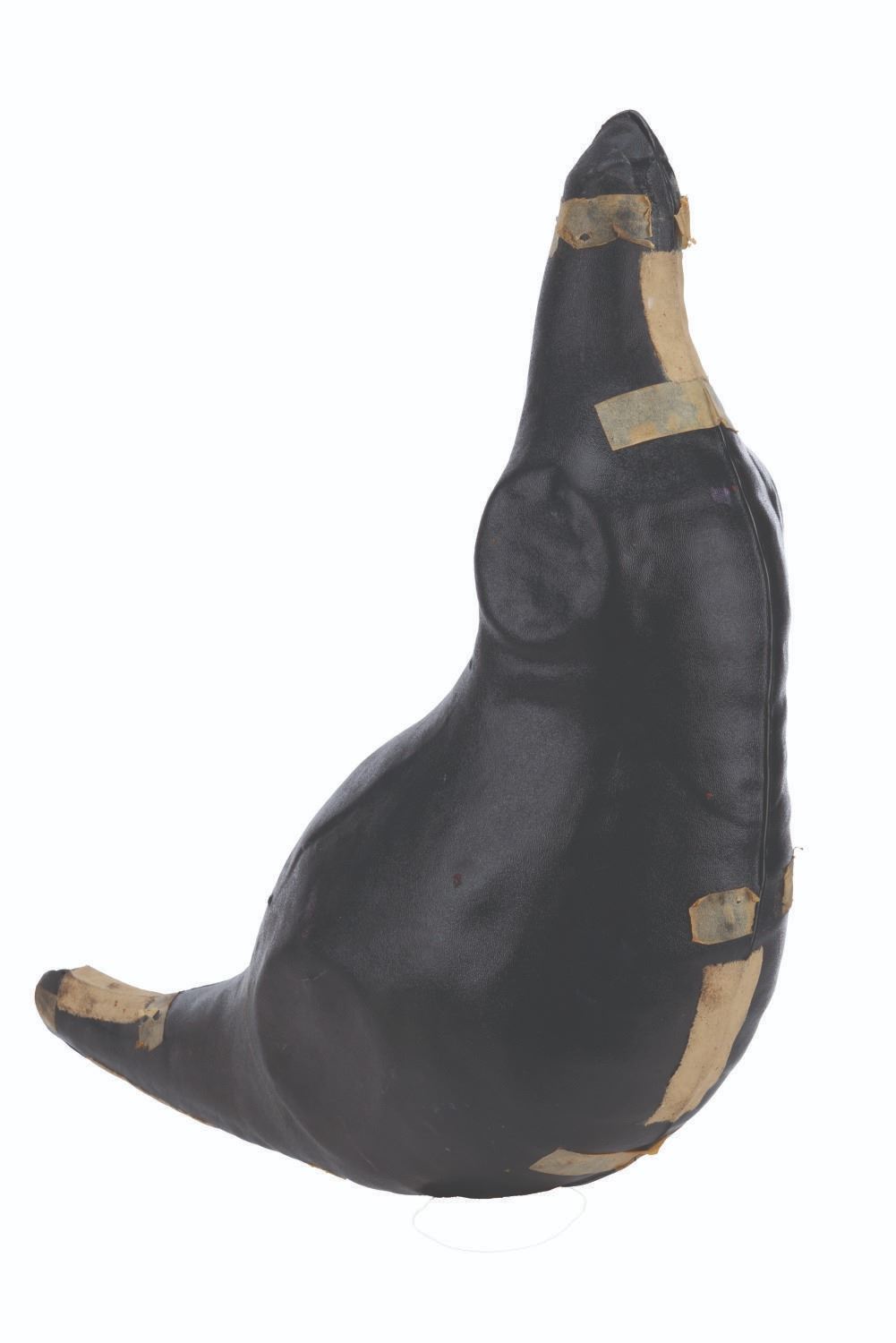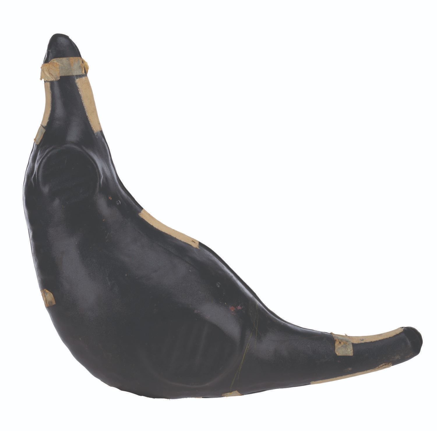 (EPCOT Center, 1983) A body form for a Figment animatronic from the Journey Into Imagination attraction at EPCOT Center. This form consists of two halves taped together, acting as a layer between the animatronic’s inner workings and the outer silicone-rubber skin. Measuring 15" x 7.5" x 28" tall, the form displays in good condition with heavy scratches, paint stains, and wear.