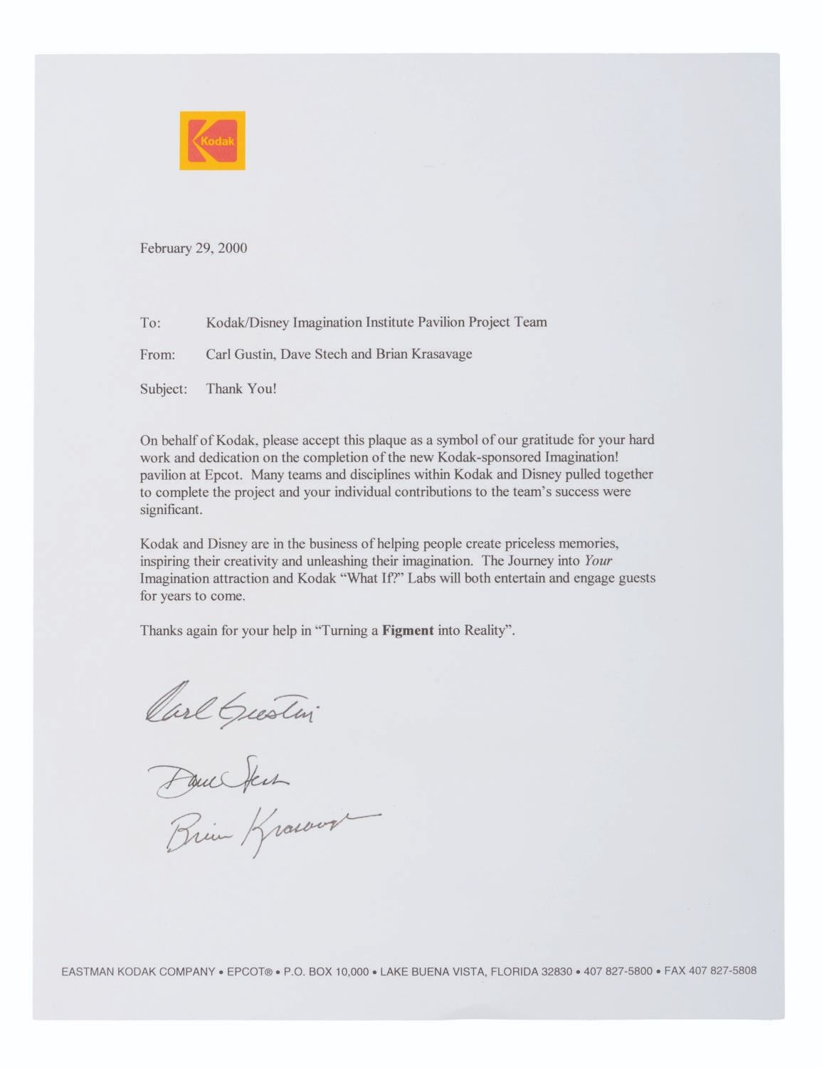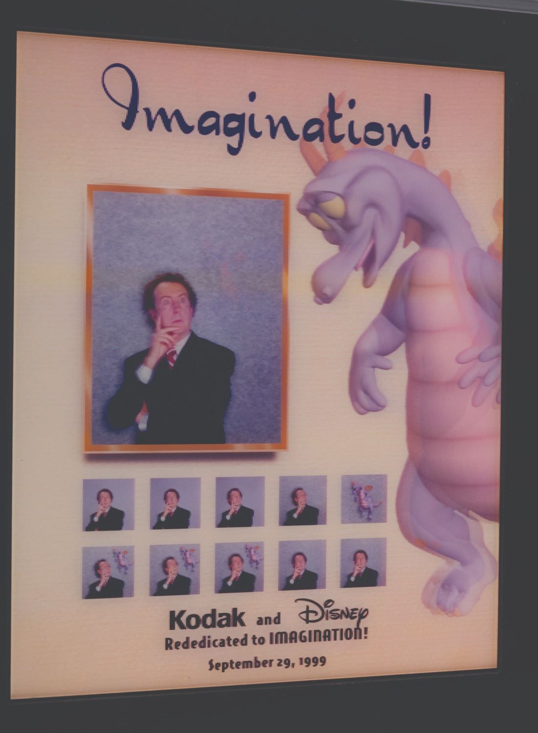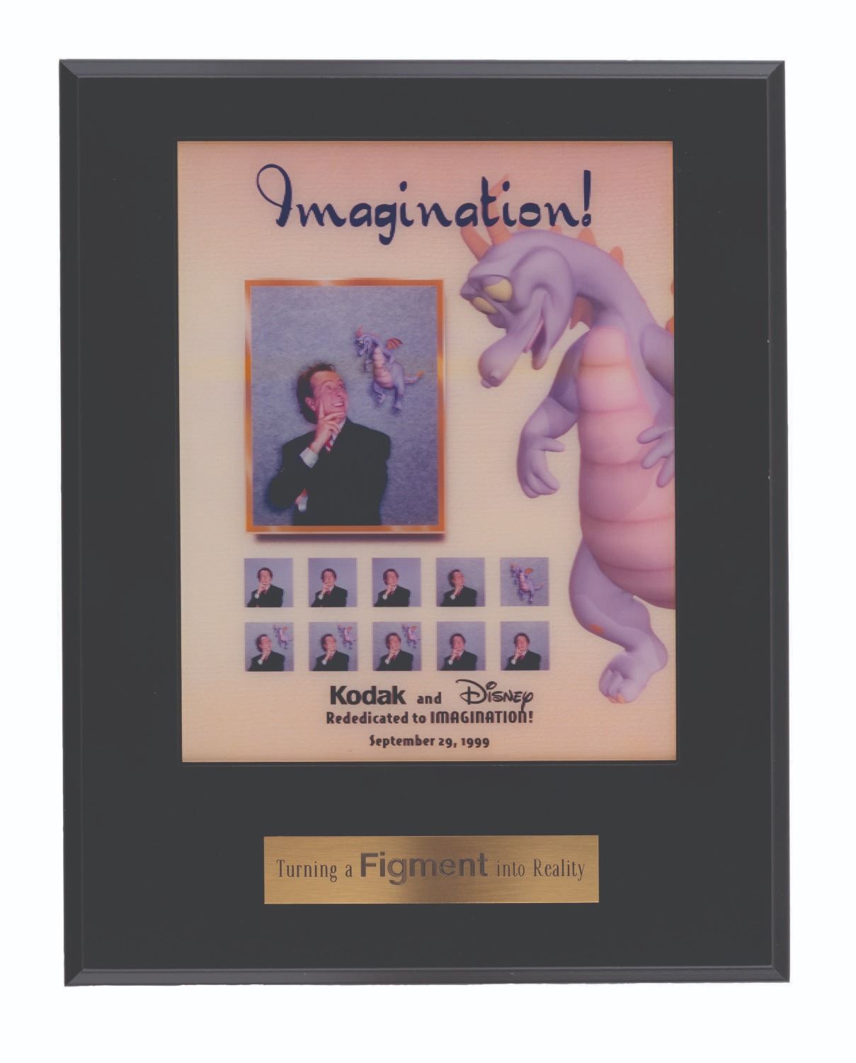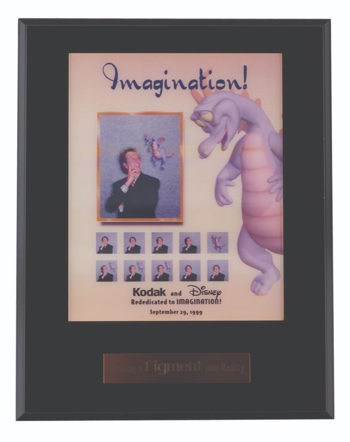 (Epcot, 1999) A lenticular Journey into YOUR Imagination plaque given to the attraction’s project team to commemorate its Grand Opening. This updated version of the attraction features Figment and Eric Idle as the new host. It is based on the 3D show "Honey, I Shrunk the Audience," with Idle reprising his role as Dr. Nigel Channing. Measuring 11" x 14", Measuring 11" x 14", the wooden plaque is in very good condition with light wear.