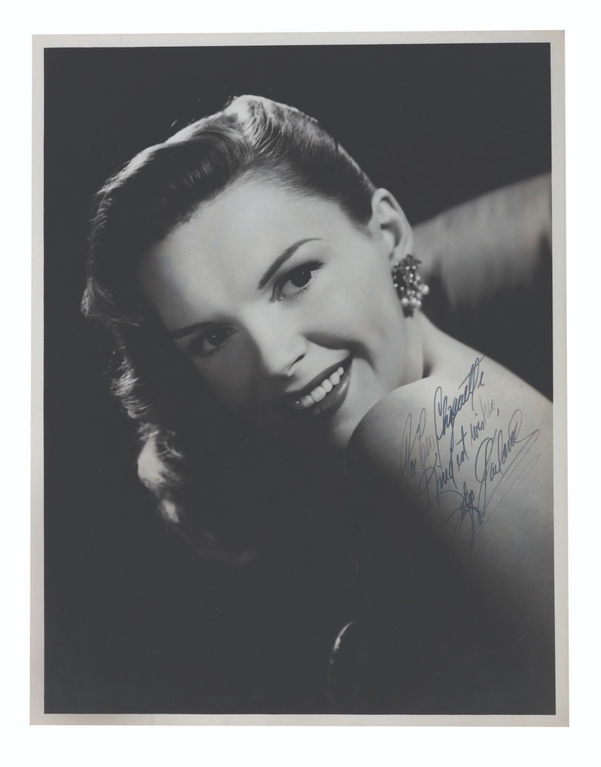 (Judy Garland, 1940s-1950s) An oversized portrait of Judy Garland, signed with dedication and Kindest Wishes by the actress. The striking portrait retains an MGM Studio stamp on the reverse. Measuring 10"x13", the photo with autograph is in very good condition, with slight toning.