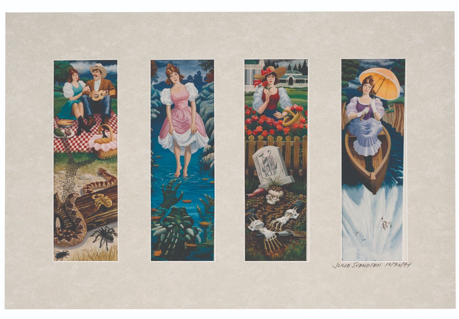 (Disneyland Paris, 1994) A photolithographic print of Phantom Manor Stretching Room Portraits, signed by artist Julie Svensen. Julie's original artwork was inspired by Marc Davis' original Haunted Mansion Stretching Room Portraits for Disneyland in 1965. Twenty-four years later, Walt Disney Imagineer Julie Svendsen created these macabre vignettes featuring Melanie Ravenswood for Phantom Manor at Disneyland Paris. Each image measures 13.5"x4.5" within a 30"x20" mat and has been both dated "10/30/94" and signed on the mat by the artist. The entire piece is in fine condition with its Disney Gallery Certificate of Authority.