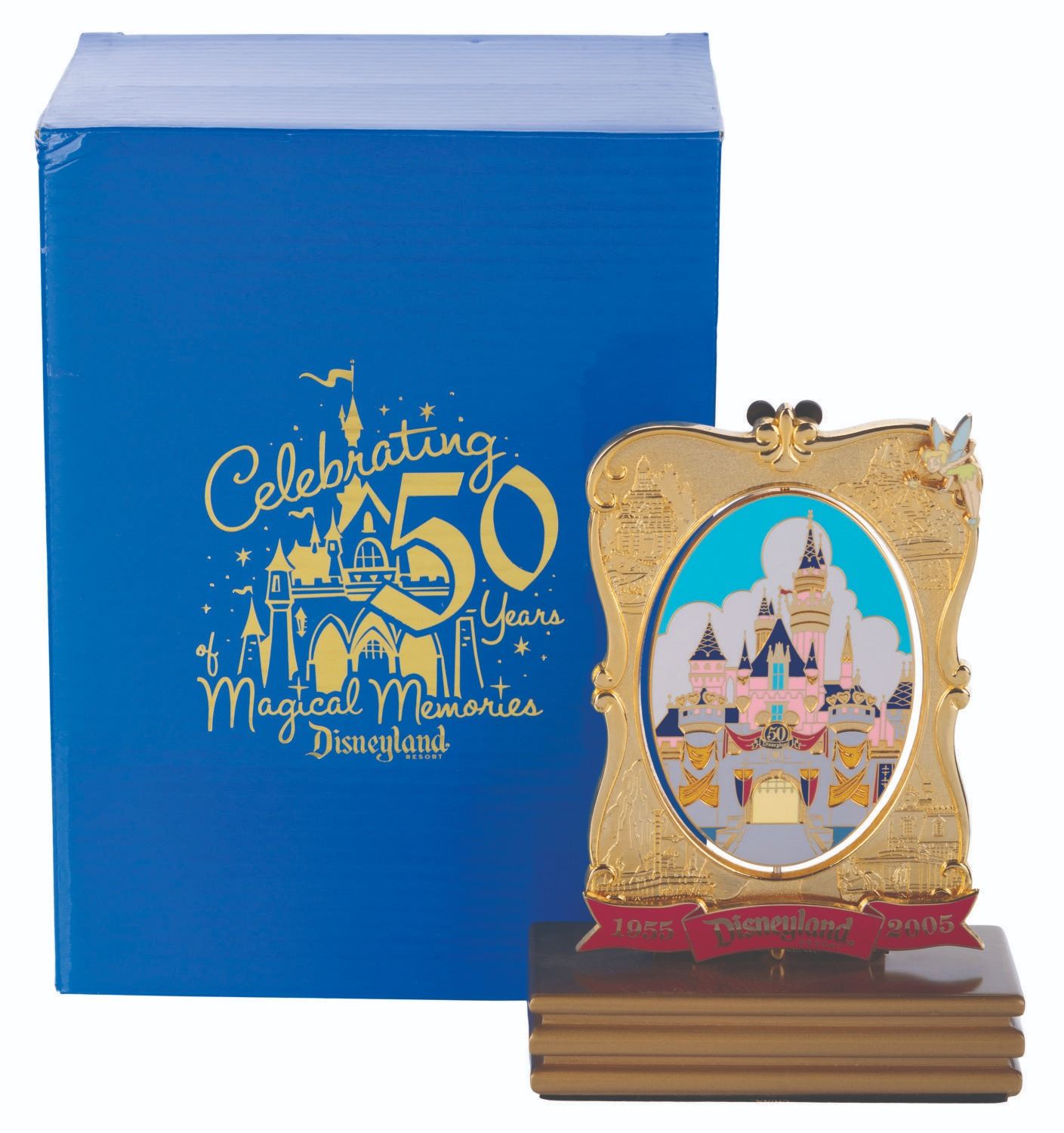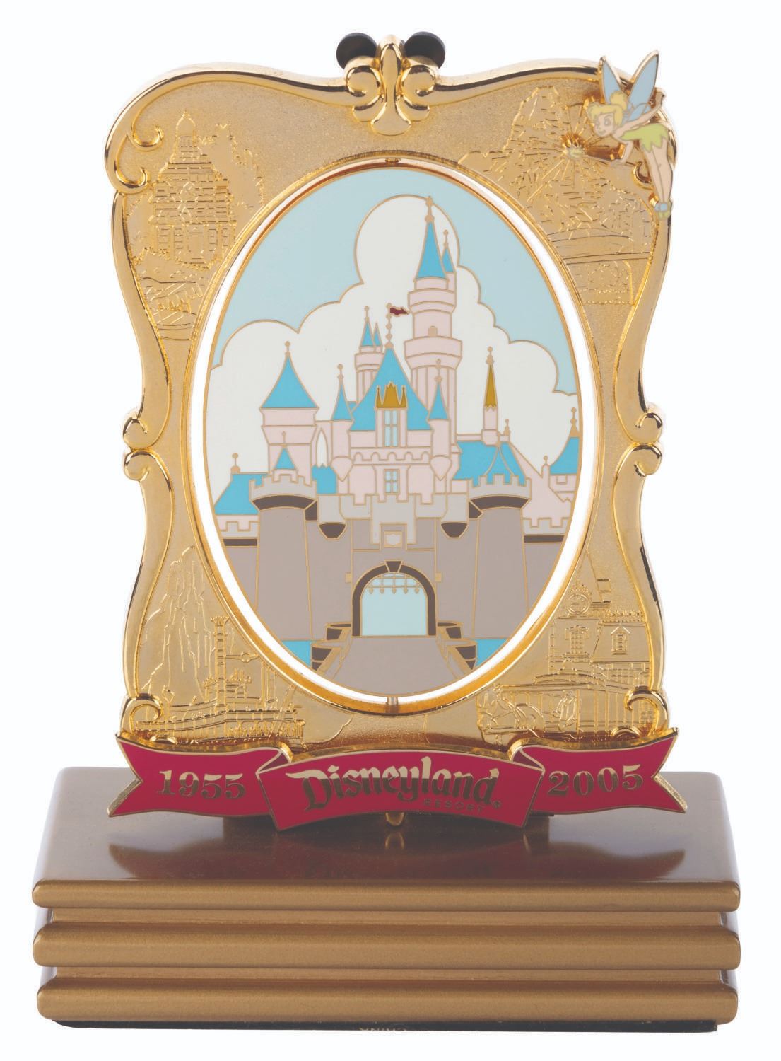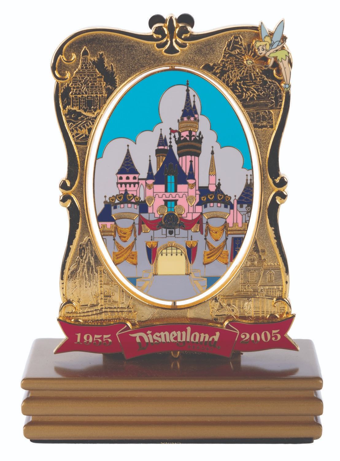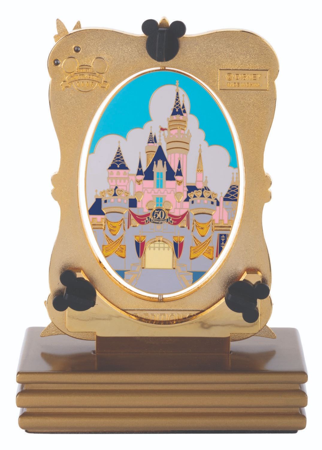 (Disneyland, 2005) A jumbo spinner pin released for Disneylands 50th anniversary. One side of the spinner shows Sleeping Beauty Castle in its typical glory, while the other shows the iconic landmark decorated for the anniversary. Each corner of the spinner frame features an attraction from the Park, while Tinker Bell sprinkles pixie dust overhead. Released in a limited edition of 500, the pin measures 3.75” x 4.75” and is in fine condition, with the original box and 2” x 4” x 2.25” custom display stand.