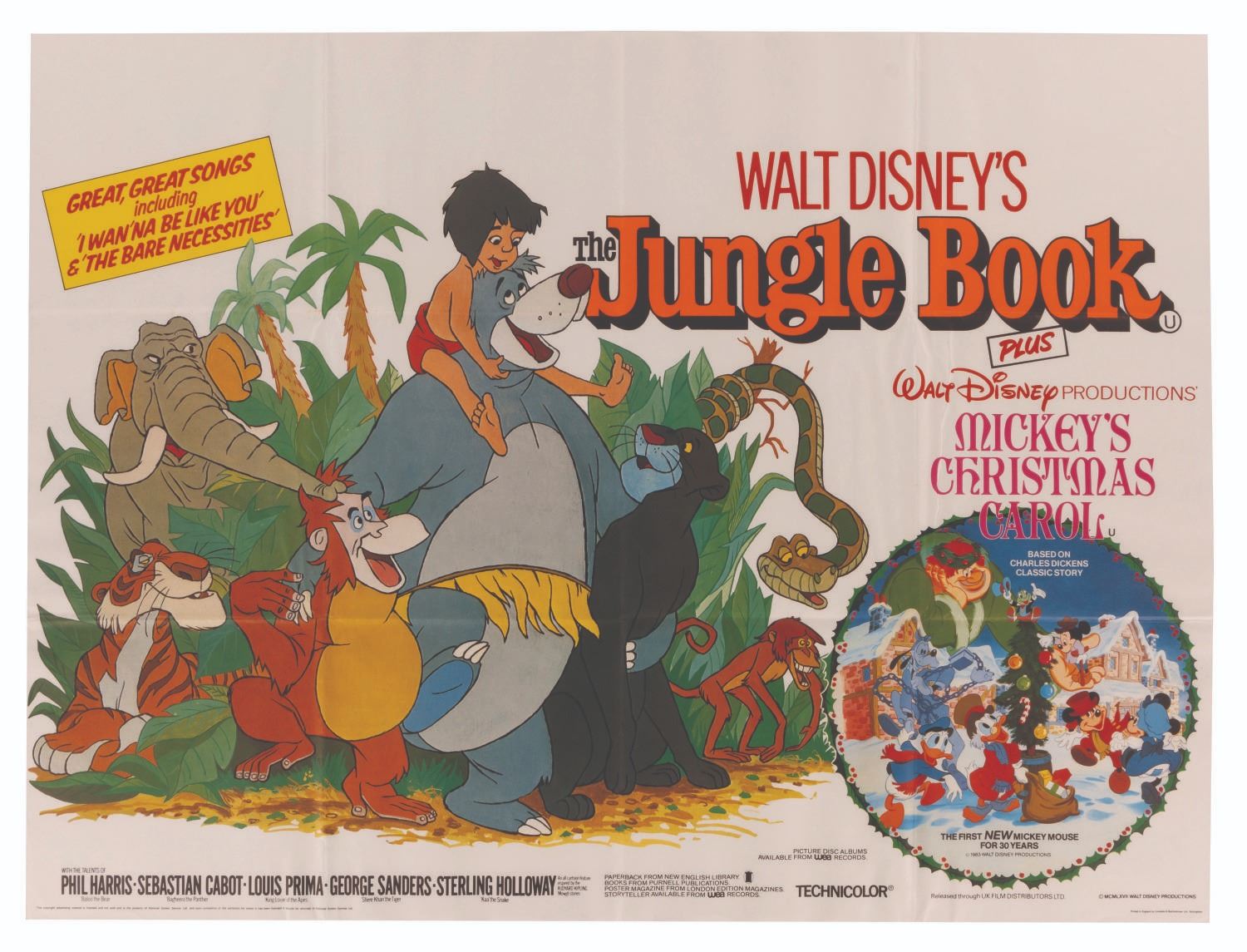(Disney, 1983) A colorful British Quad theatrical poster promoting the United Kingdom re-release of “The Jungle Book” and the debut of “Mickey’s Christmas Carol,” the first new Mickey Mouse theatrical short in 30 years. Measuring 30" x 39.75”, the poster displays in very good condition with original folds and heavy creases.