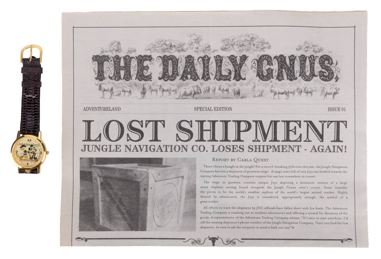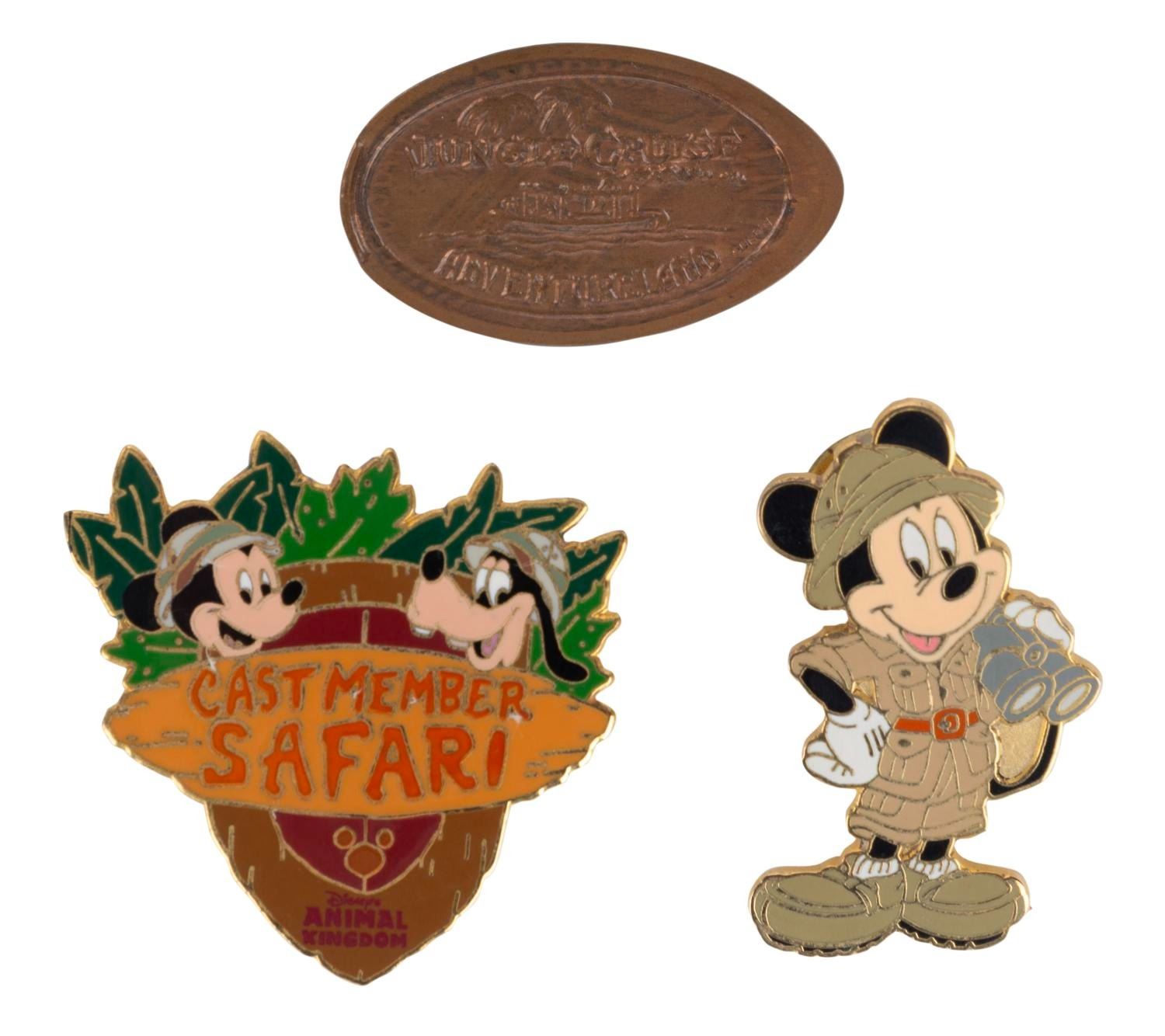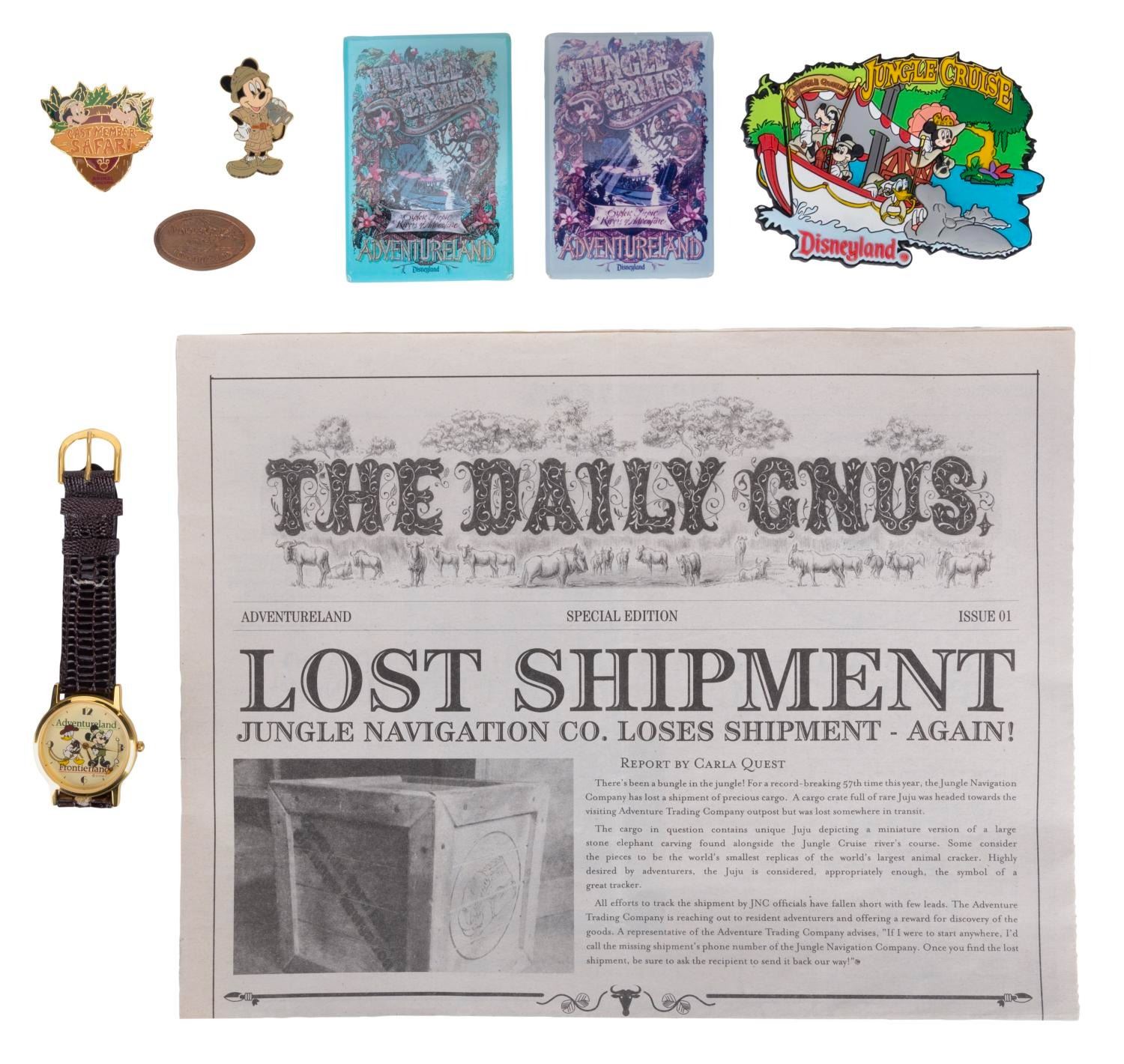 (Disneyland, 1997-2014) A collection of eight Jungle Cruise souvenirs and Cast-exclusive items. Included are magnets, a pressed penny, a pin, a "Daily Gnus" paper, and two Cast Member exclusive items - a Walt Disney World Safari pin and a Disneyland Adventureland-Frontierland wristwatch. Measuring various sizes, the collection is in very good condition, with fading to one magnet and split in the leather watch band. The watch requires a battery (not included) to function.
