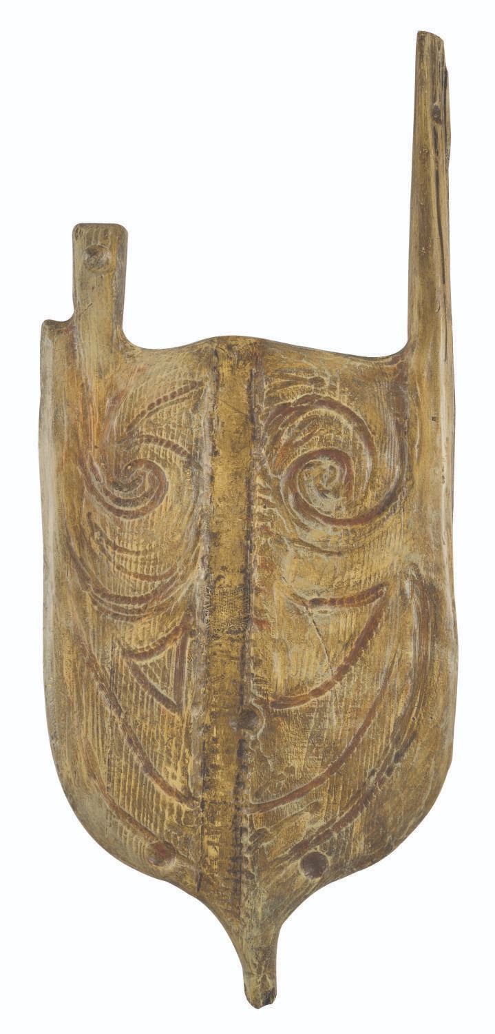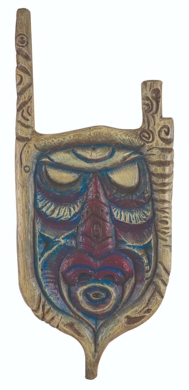 (Walt Disney World, 1990s) A Tiki shield prop from the Jungle Cruise in Adventureland. The hand-painted resin prop was displayed in the attraction's queue and features a baboon face on a white shield. Measuring 17.5” x 41” x 2” thick, the prop is in very good condition with a pink paint spot on the nose and light wear from Park use.