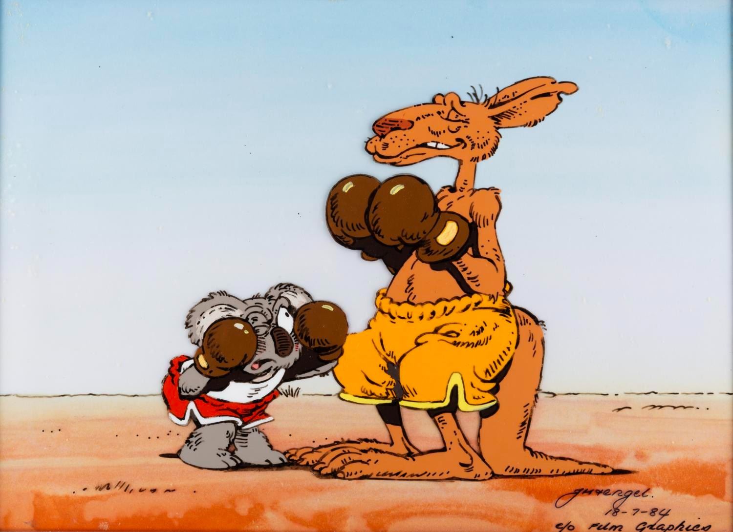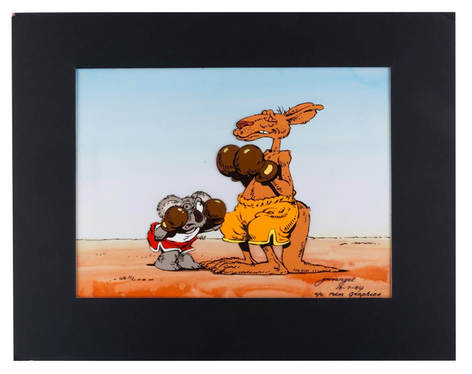 (Engel, 1984) An original hand-painted cel by Jules Engel of a kangaroo and koala boxing. The piece is signed by Engel in black marker and dated “18-7-84.” With a character image size measuring 6.5” x 7.75” on a 8.75” x 11.75” visible cel of a 13.25” x 16.75” matte, the piece is in fair condition with scratches, scuffs, stains, and wear.