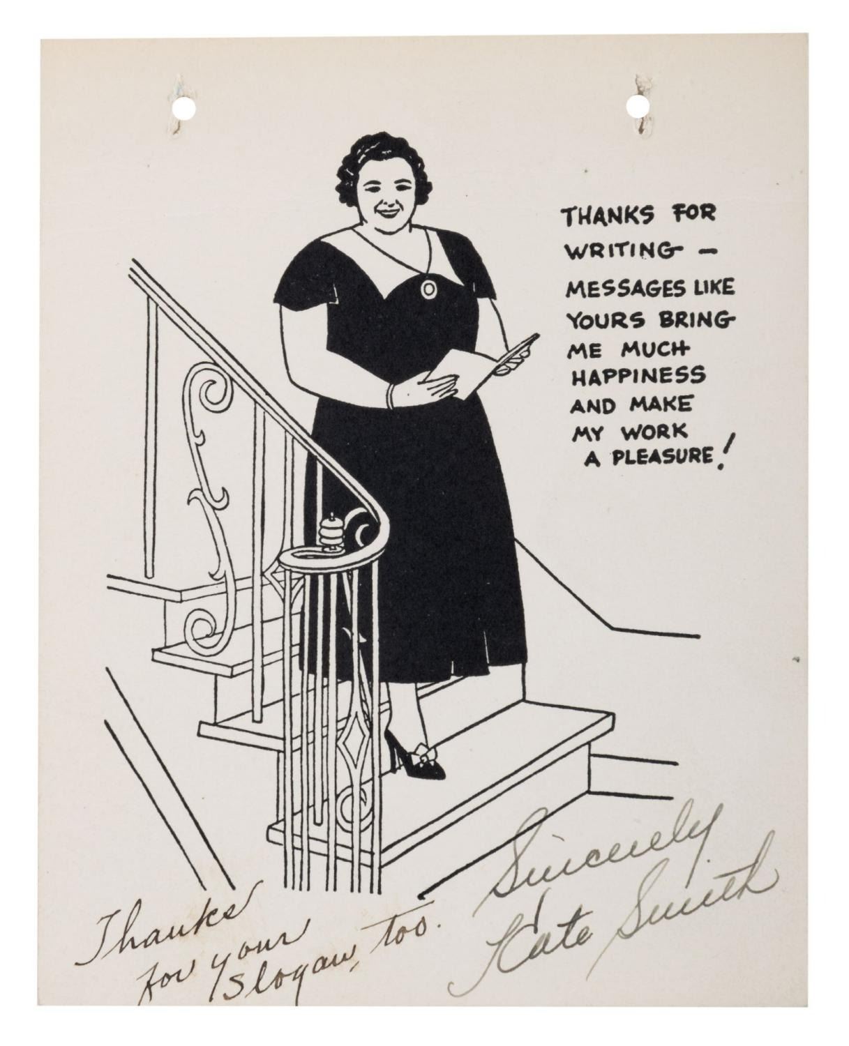 (Kate Smith, 1940s-80s) A card signed by "The First Lady of Radio," contralto singer Kate Smith. Measuring 4.5" x 5.5", the card is in good condition with holes from mounting and a crease that runs across the top quarter of the card.