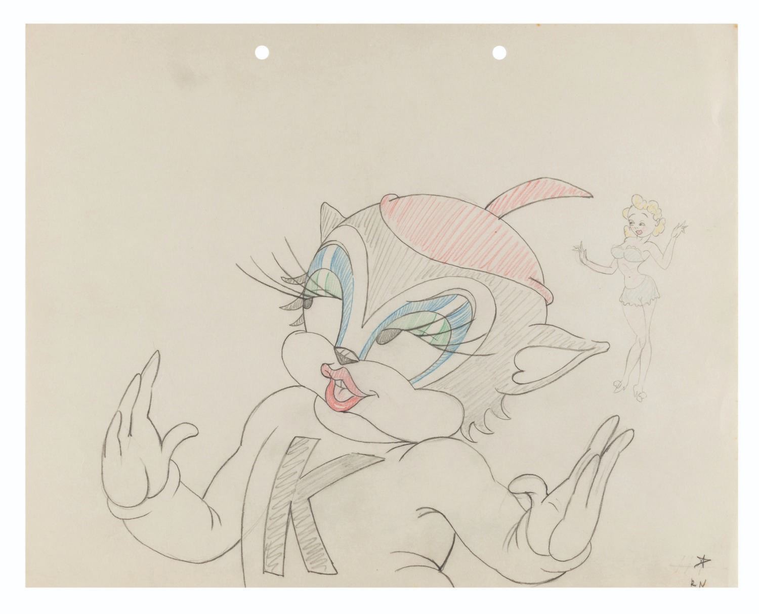 (Schlesinger, 1938) An original model drawing of Kitty Bright from the Merrie Melodies short "Katnip Kollege." The drawing contains an additional illustration of a woman on the right. With an image size of 7" x 9.5" on 9.5" x 12" animation paper, the graphite and colored pencil drawing is in very good condition with light handling wear and a spot of discoloration at the top, which does not affect the image.