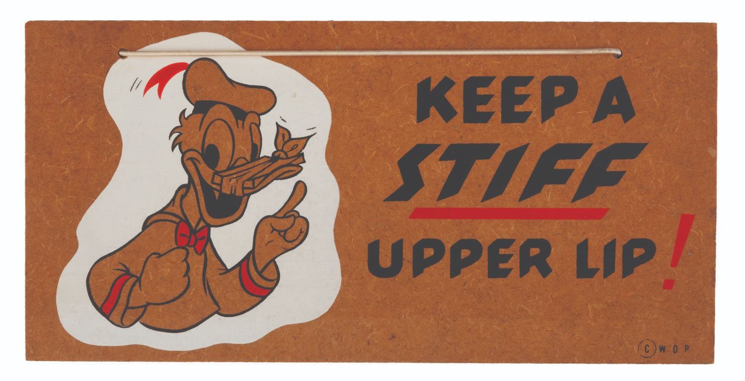 (Disneyland, 1950s-60s) A souvenir sign featuring Donald Duck from Disneyland's Art Corner in Tomorrowland. These novelty signs were popular Art Corner souvenirs, and featured humorous sayings such as this "Keep a Stiff Upper Lip!" sign. Measuring 6" x 12", the sign is in very good condition with light edge wear.