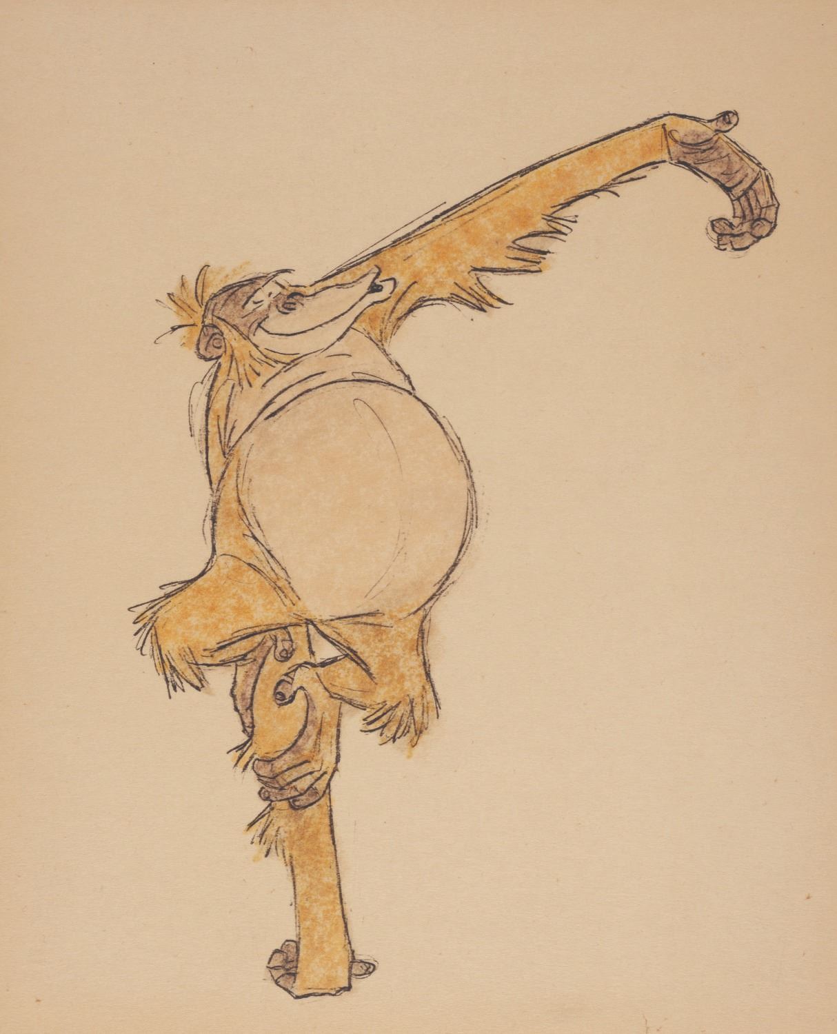 (Disney, 1967) An original character development drawing of King Louie by Disney Legend Ken Anderson for Walt Disney’s 1967 feature film "The Jungle Book.” Accomplished in ink and watercolor with an image size of 5.75” x 7.75” on 7.5” x 9” heavy paper adhered to 8.5” x 10” artist board, the piece is in very good condition with light scrapes and edge wear.
