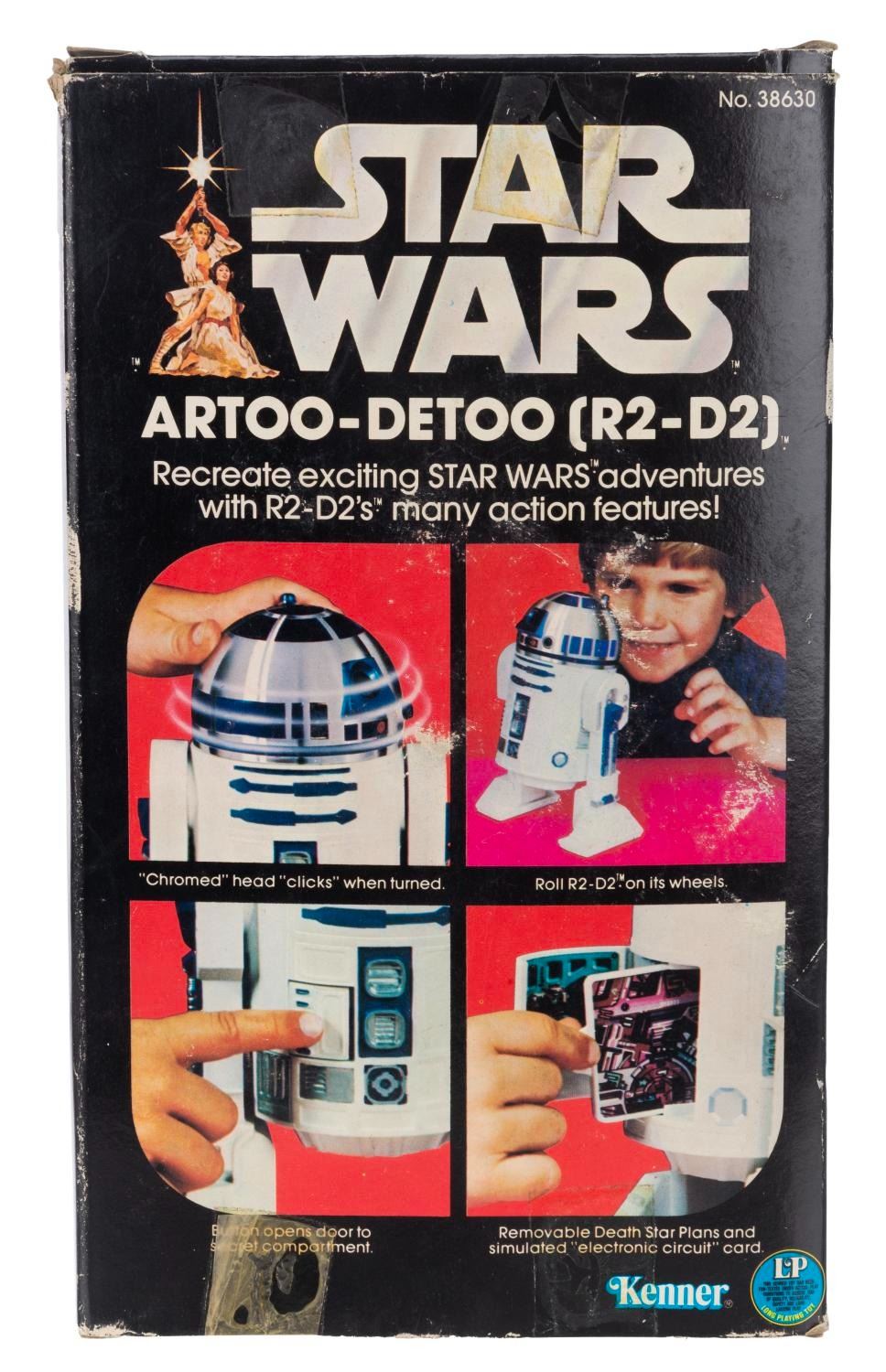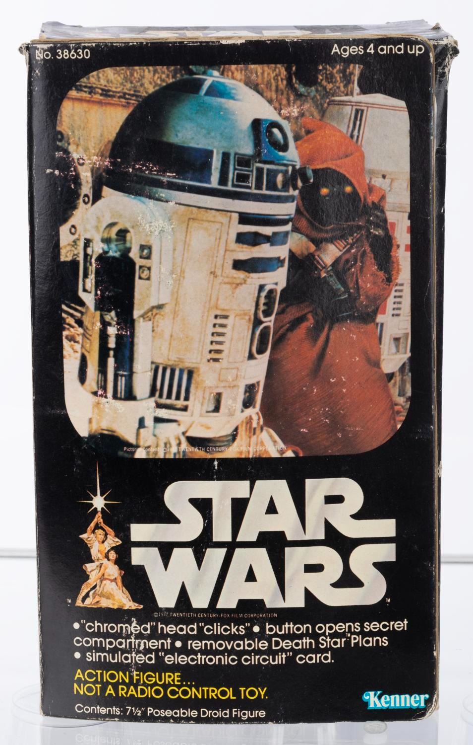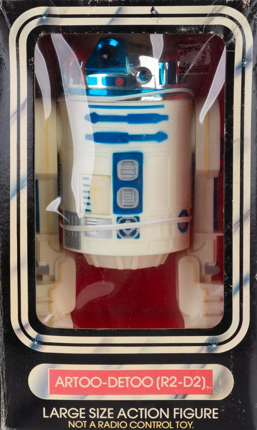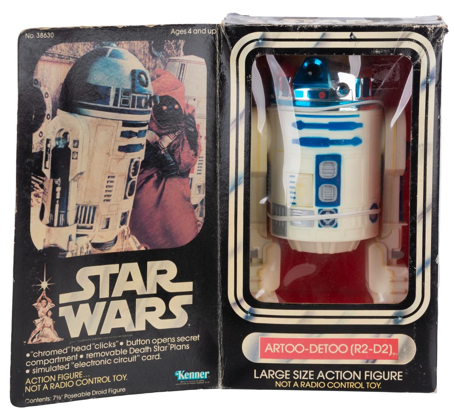 (Kenner, 1978) A large-sized Artoo-Detoo action figure. Right after the huge success of the 3.75” Star Wars action figures, Kenner started a 12” line, with R2-D2 coming in at 7.5” tall. The figure is still tied to the insert card in the original box, with the original catalog, instruction sheet, and Kenner “We Really Do Care” inserts enclosed. The figure is in fine unused condition, with slight discoloration from age only. The inserts are in good condition with original folds and small spots of discoloration from age. The box displays in fair condition with overall wear, scuffs, scratches, and slight warping from age.