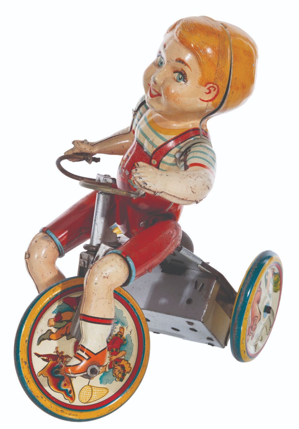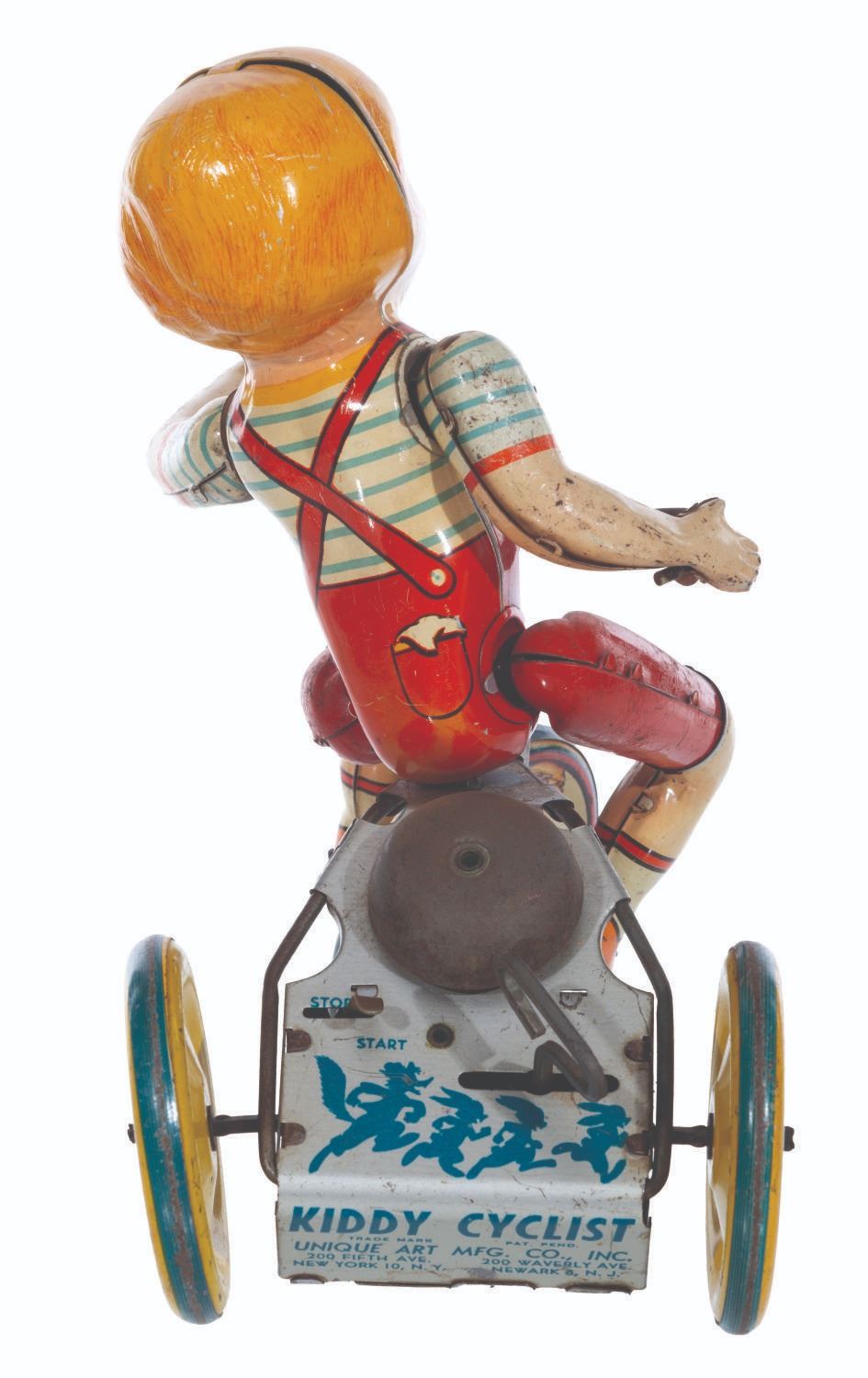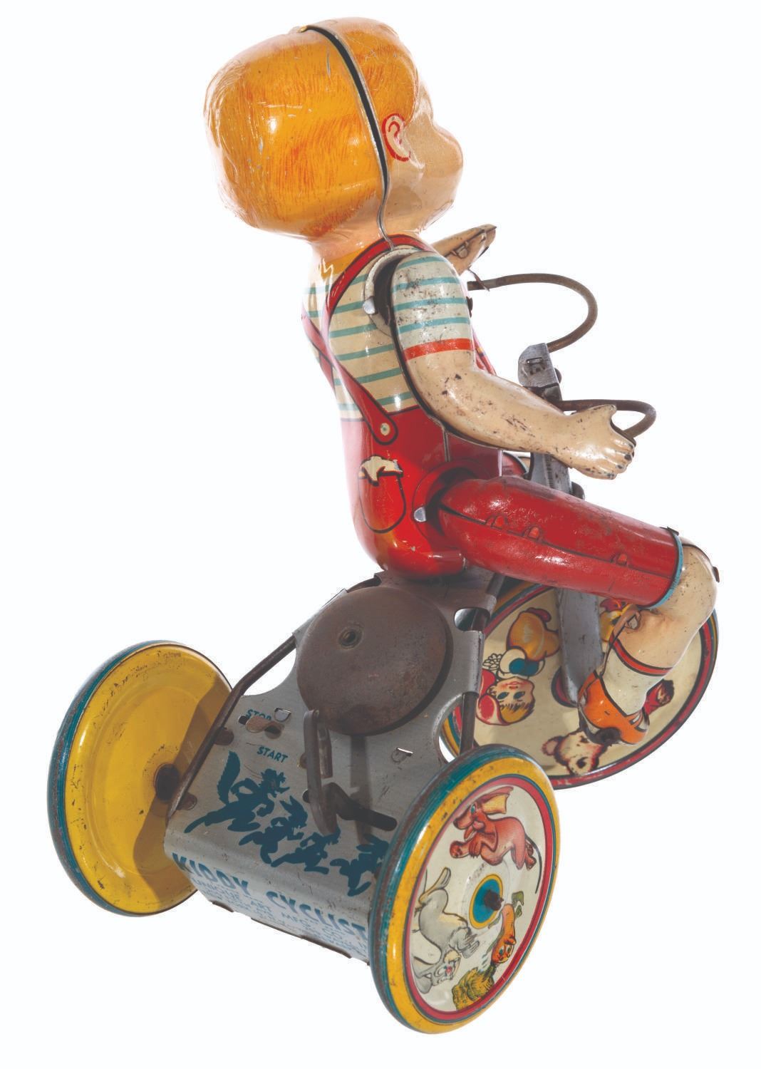 (Marx, 1930s) A Kiddy Cyclist tin litho wind-up toy. When wound, the child’s legs move up and down as it pedals and the bike moves, sporadically ringing a bell. The toy has been tested and is in working condition. Measuring 4” x 8.75” x 7.25” deep, the toy is in good condition with heavy scratches, paint chips, stains, wear, a gap in the head and right arm, and light oxidation.