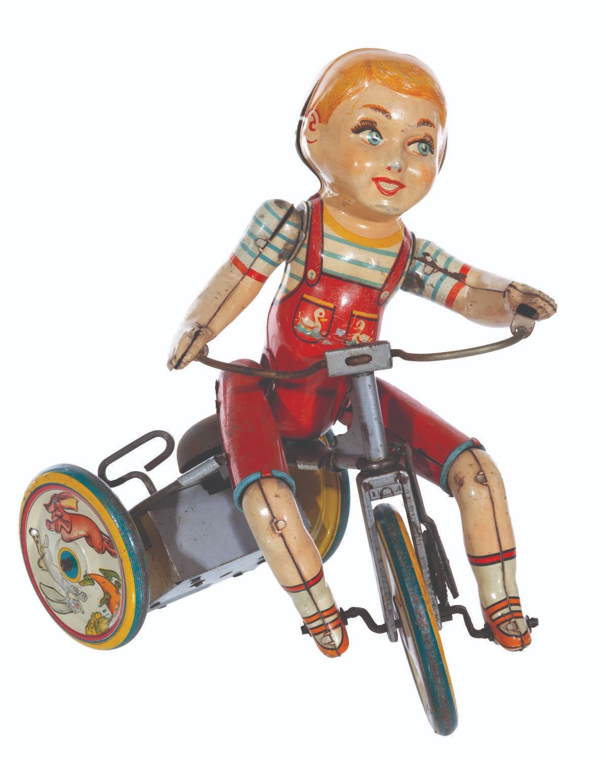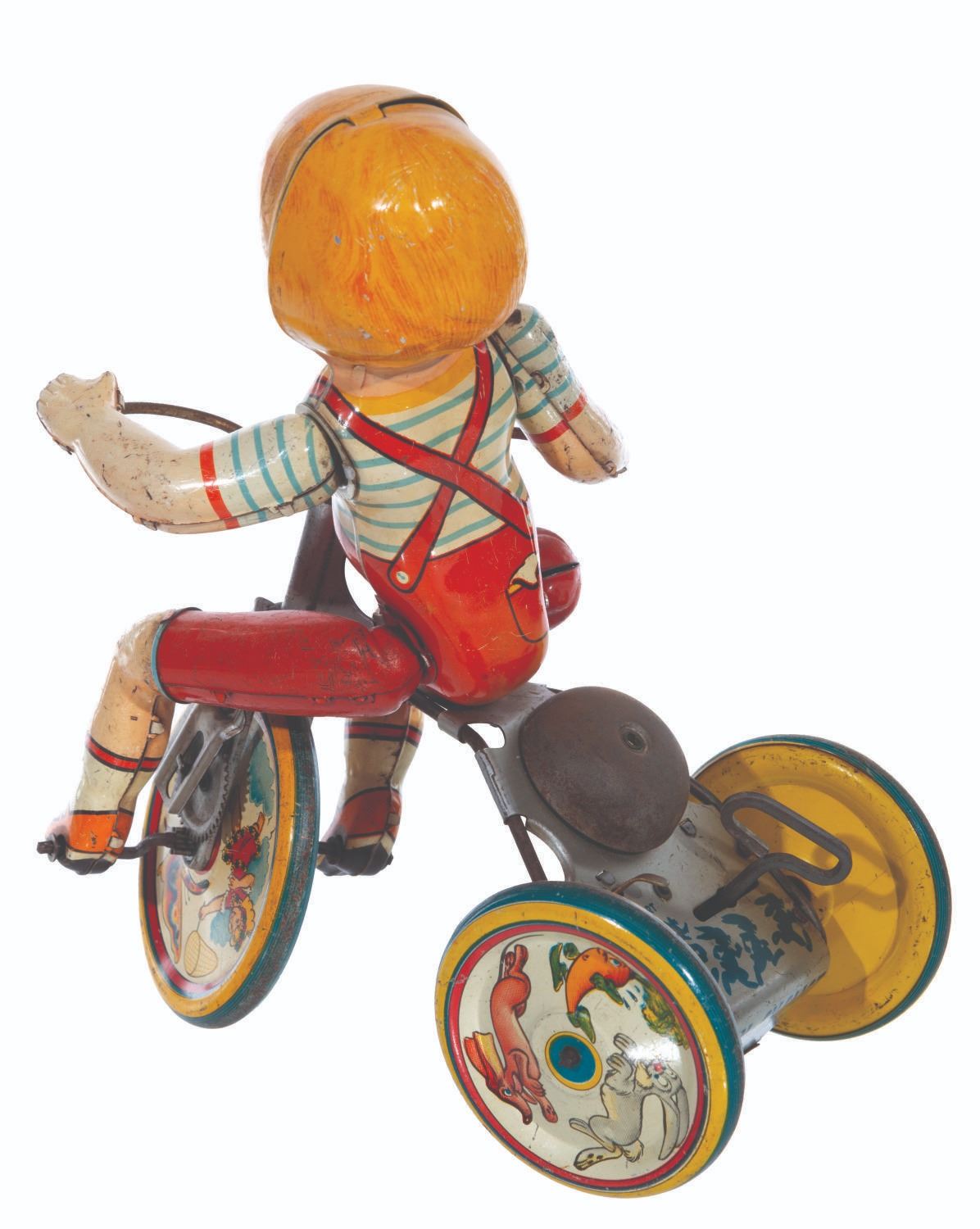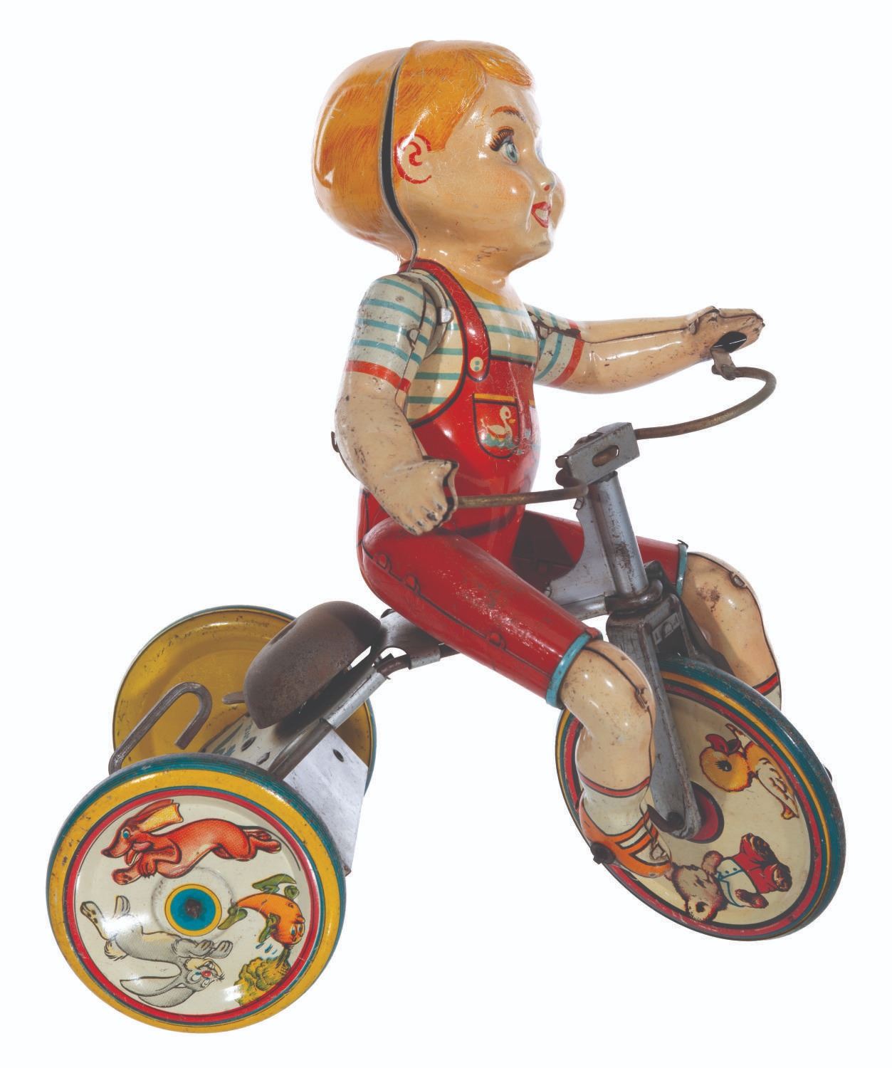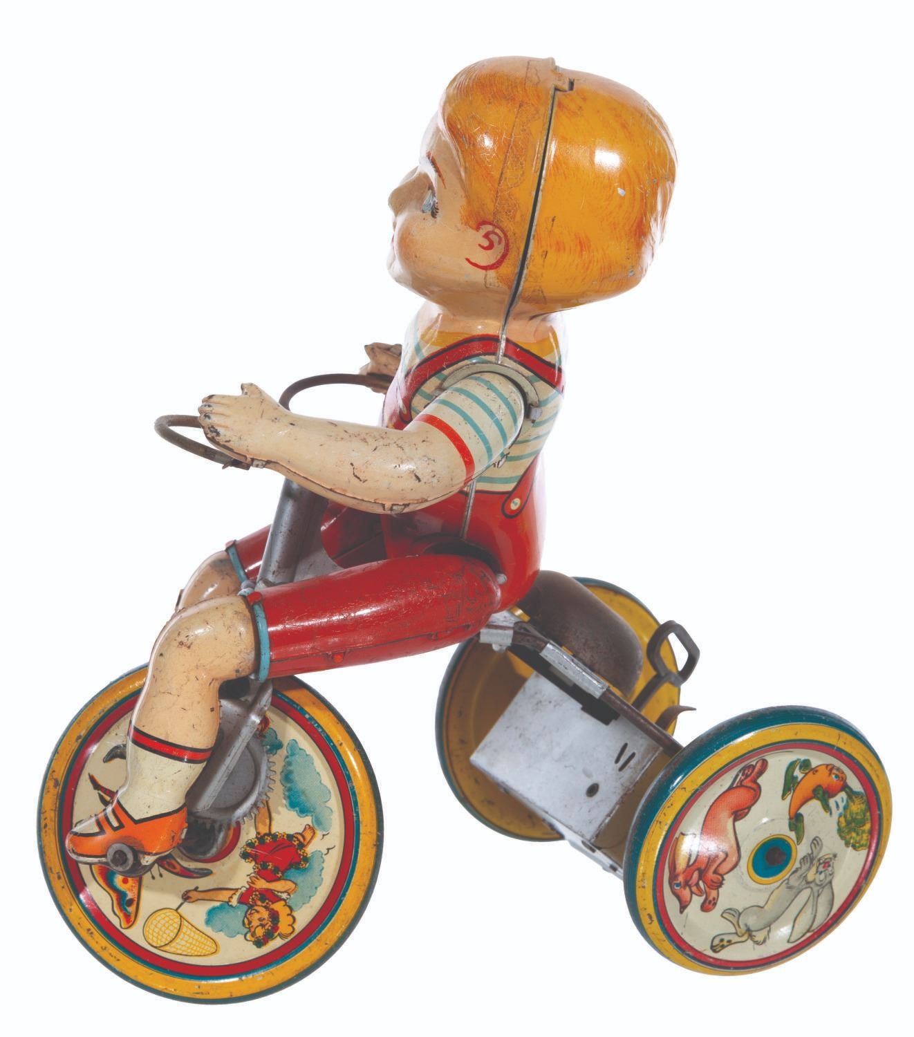 (Marx, 1930s) A Kiddy Cyclist tin litho wind-up toy. When wound, the child’s legs move up and down as it pedals and the bike moves, sporadically ringing a bell. The toy has been tested and is in working condition. Measuring 4” x 8.75” x 7.25” deep, the toy is in good condition with heavy scratches, paint chips, stains, wear, a gap in the head and right arm, and light oxidation.