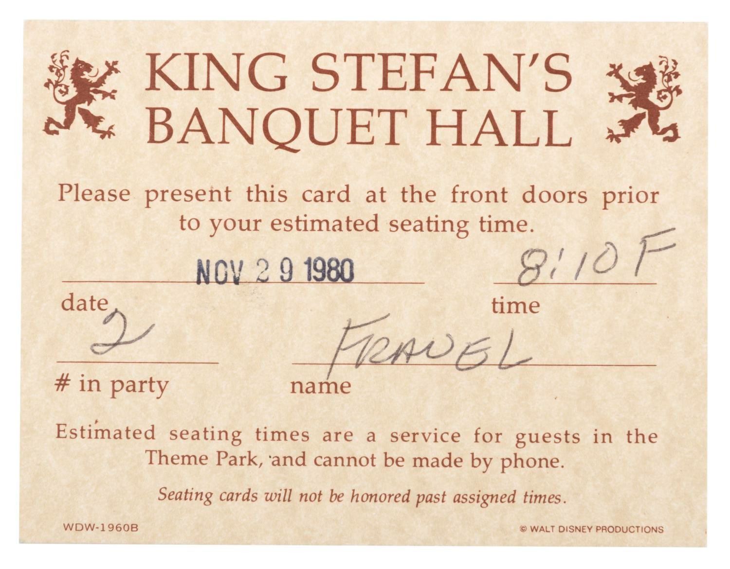 (Walt Disney World, 1980) A seating card from King Stefan's Banquet Hall in Cinderella’s Castle, stamped November 29, 1980. Measuring 3.25” x 4.25”, the card is in very good used condition, with light handling wear.