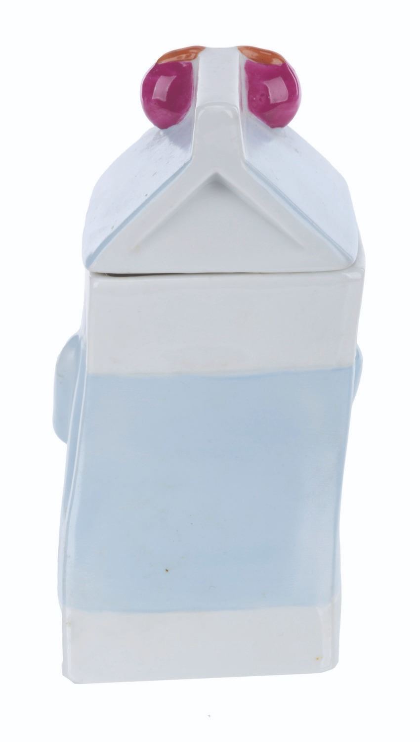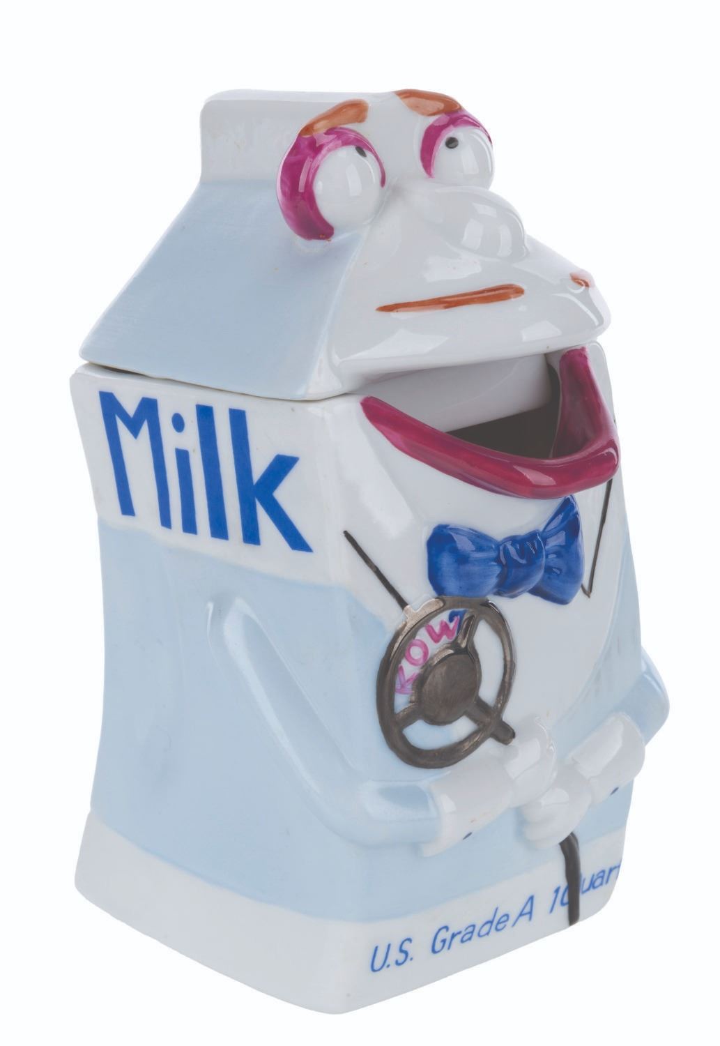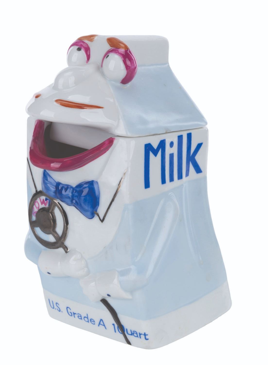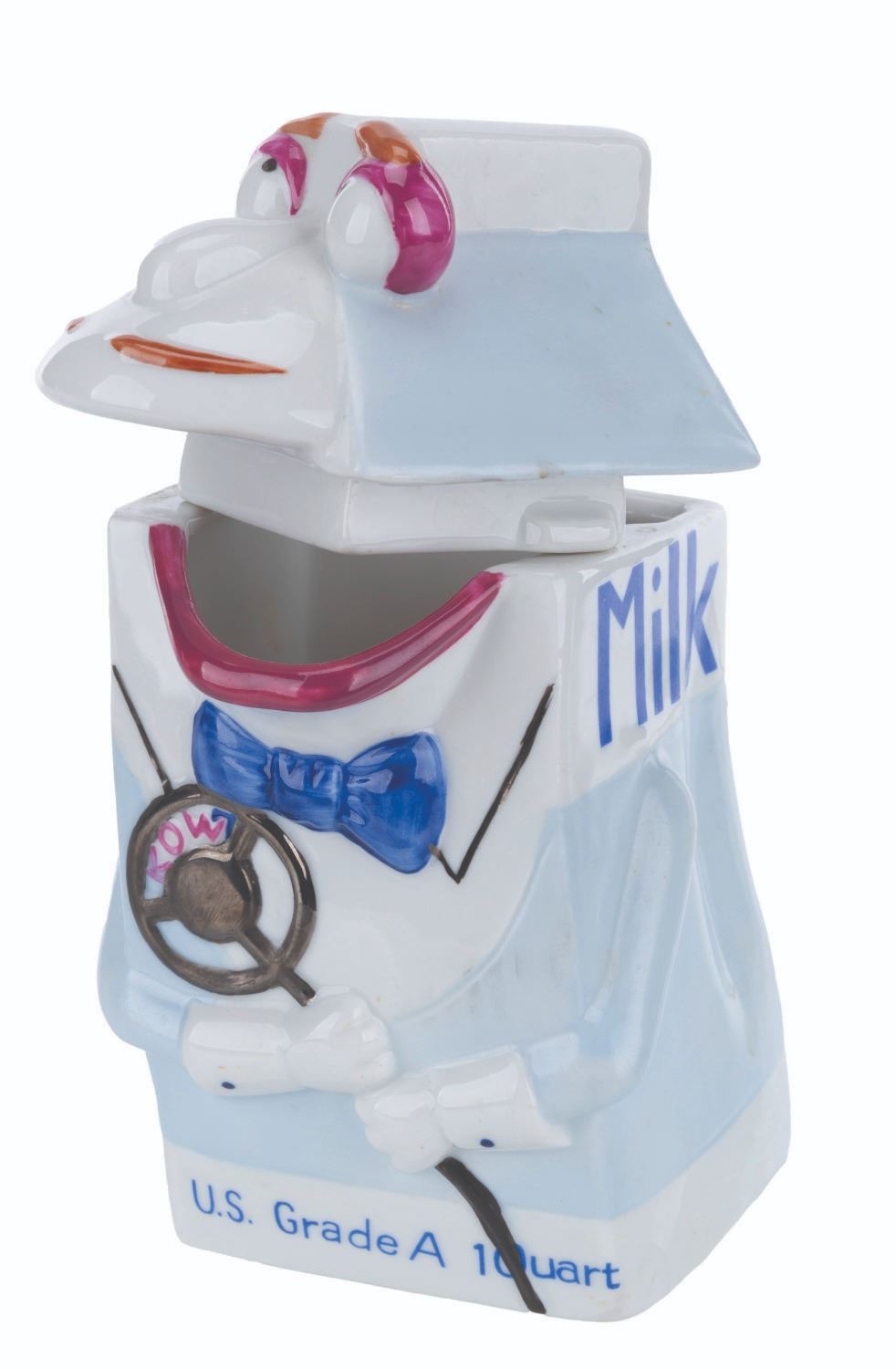 (EPCOT, 1982) A ceramic creamer bowl of Mr. Dairy Goods from EPCOT’s Audio-Animatronic show Kitchen Kabaret. The lid can be removed but is designed so that it locks in place while pouring. Measuring 3” x 4” x 6” tall, the creamer is in good condition with stains, scuffs, a sticker on the bottom, and smudges from use.