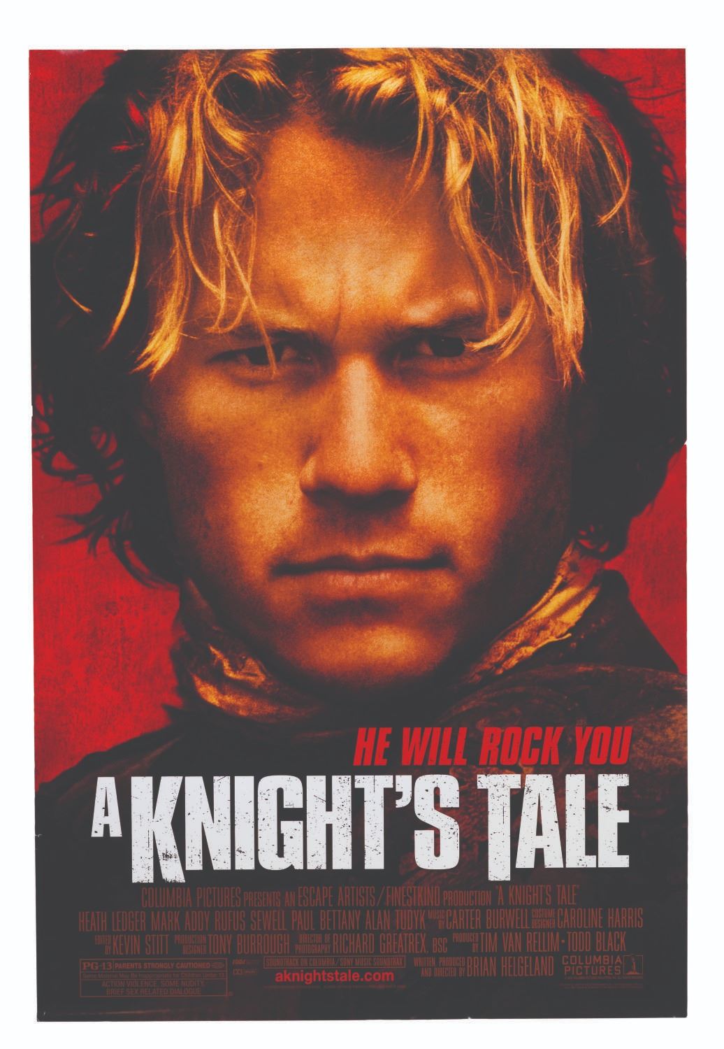 (Columbia Pictures, 2001) A one-sheet for "A Knight’s Tale " starring Heath Ledger. Measuring 27 " x 40 ", the poster is in very good condition with light handling wear, including a 0.25 " tear in the lower left edge.