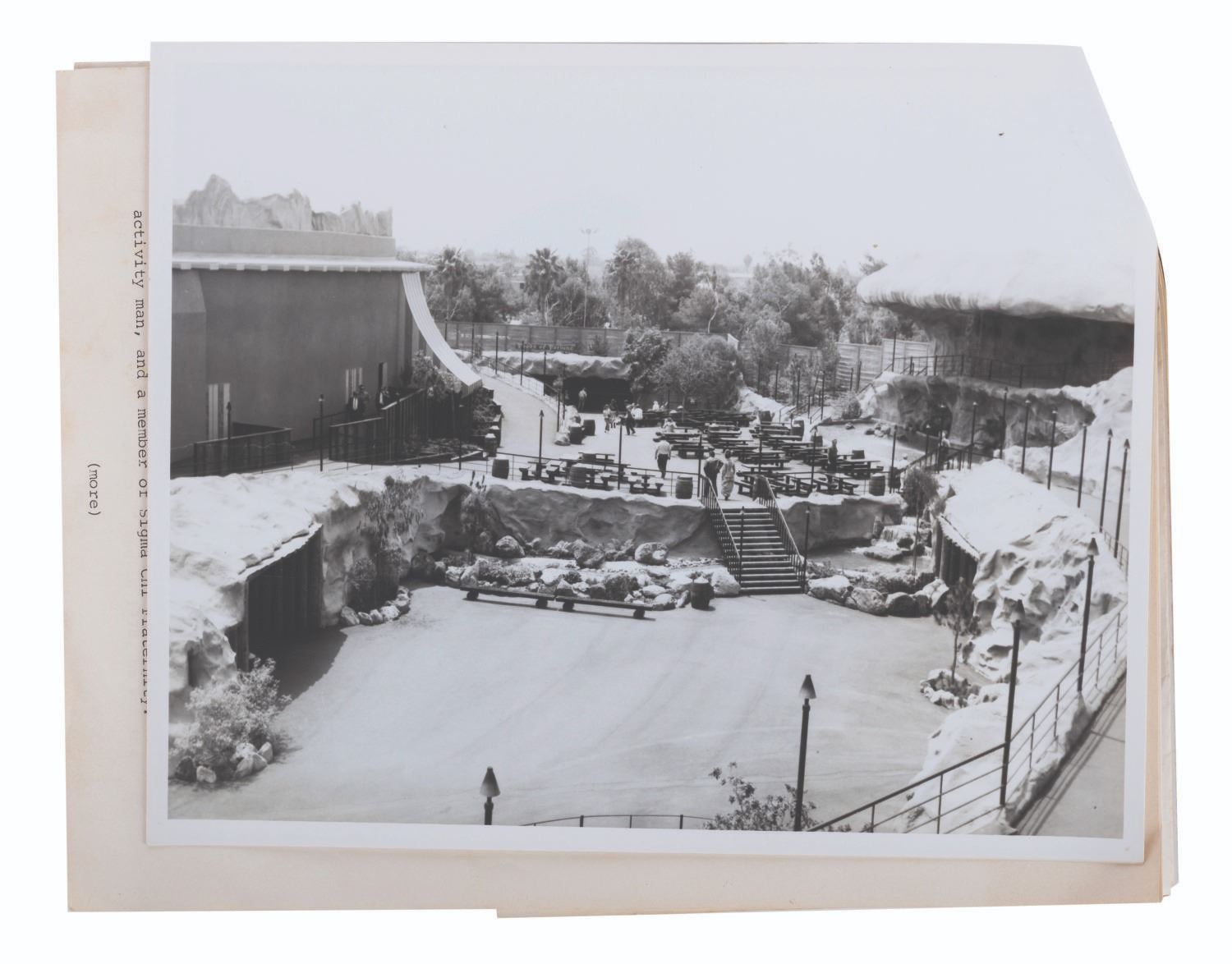 (Knott's Berry Farm, 1971-1990s) A press packet for the debut of the John Wayne Theater at Knott's Berry Farm, and other press photos. On June 19th, 1971, Knott's hosted the world premiere of John Wayne's new film Big Jake at the newly opened John Wayne Theater. This packet includes information on the film and Wayne, stapled together with (4) photos from the film and (2) photos of the theater. Also included in the lot are (3) photos of later additions to the Park including Snoopy's Spring Parade, Indian Trails themed area, and The Ghost Town Christmas Crafts Festival. Measuring from 8"x10" to 8.5"x11", the press materials are in very good used condition.