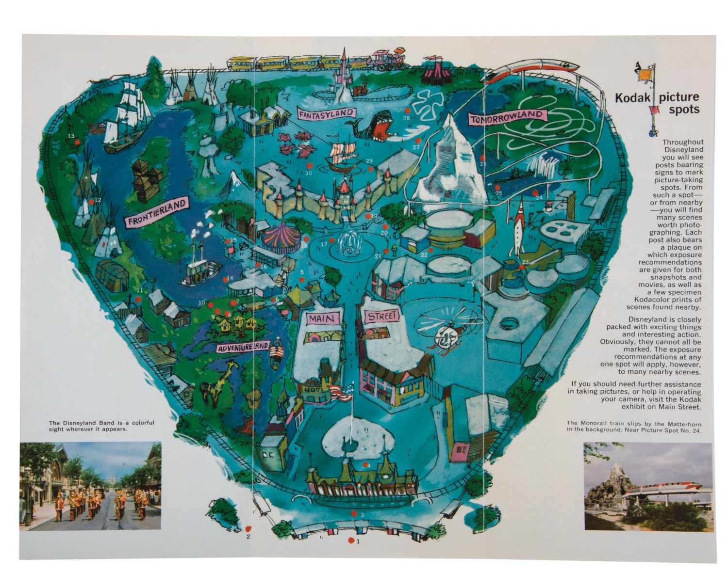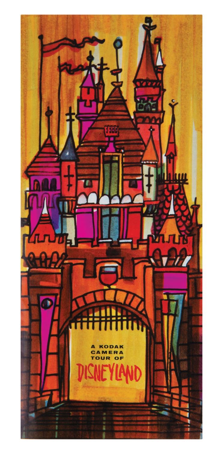 (Disneyland, 1960s) A 1960's Kodak Camera Tour of Disneyland tri-fold brochure featuring a colorful castle cover and a map of Disneyland with suggested photo spots. The piece is in very good used condition with light wear and creases at the folds.