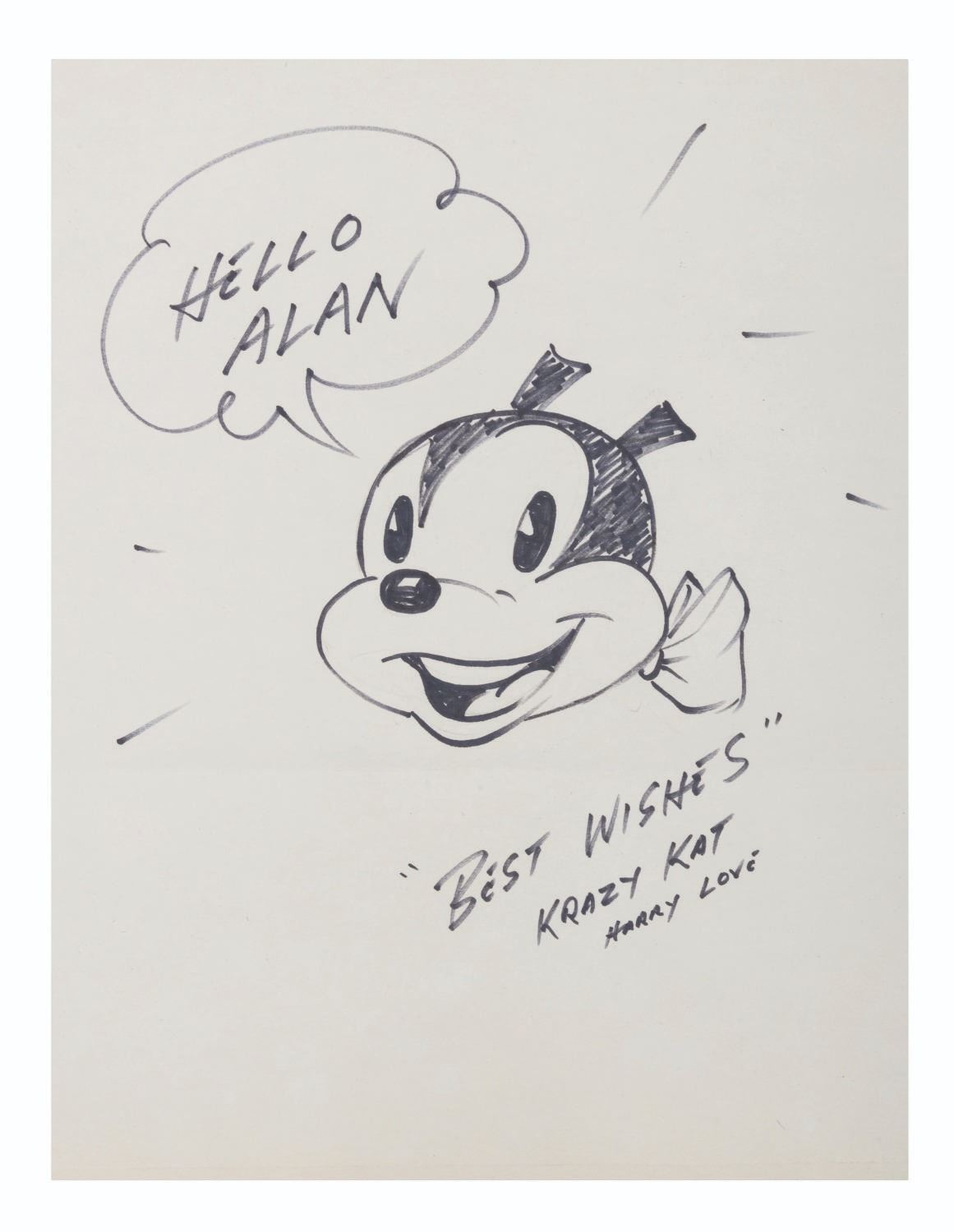 (Love, 1980s-1990s) An original drawing of Krazy Kat by animator Harry Love, signed with a dedication to Alan Hylton. Love is known for his work at the Charles Mintz Studio and at Warner Bros. on animated shorts including "What's Opera Doc?" "Tweet Tweet Tweety," and as a Production Coordinator on "The Incredible Mr. Limpet." Measuring 8.5” x 11”, the drawing is in fine condition with intentional folds from mailing.