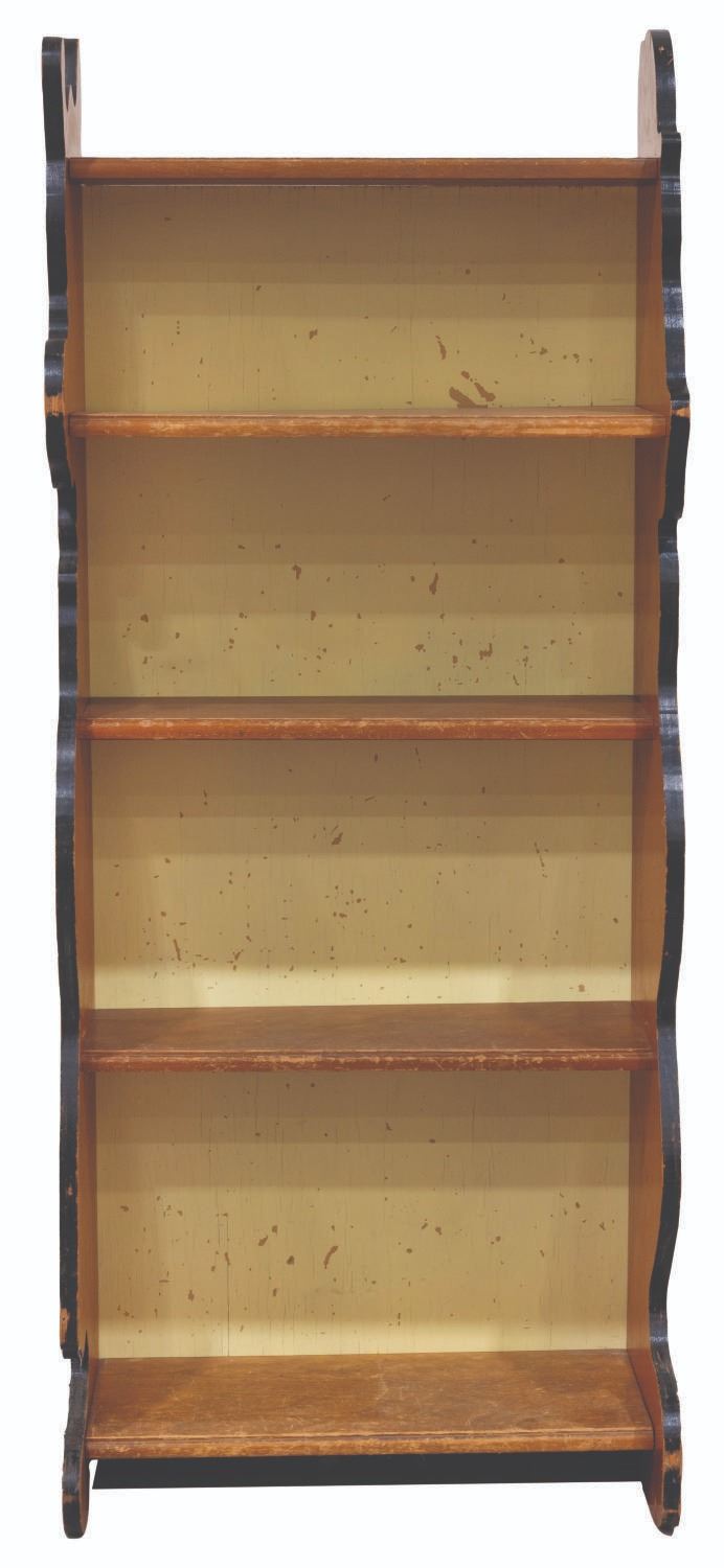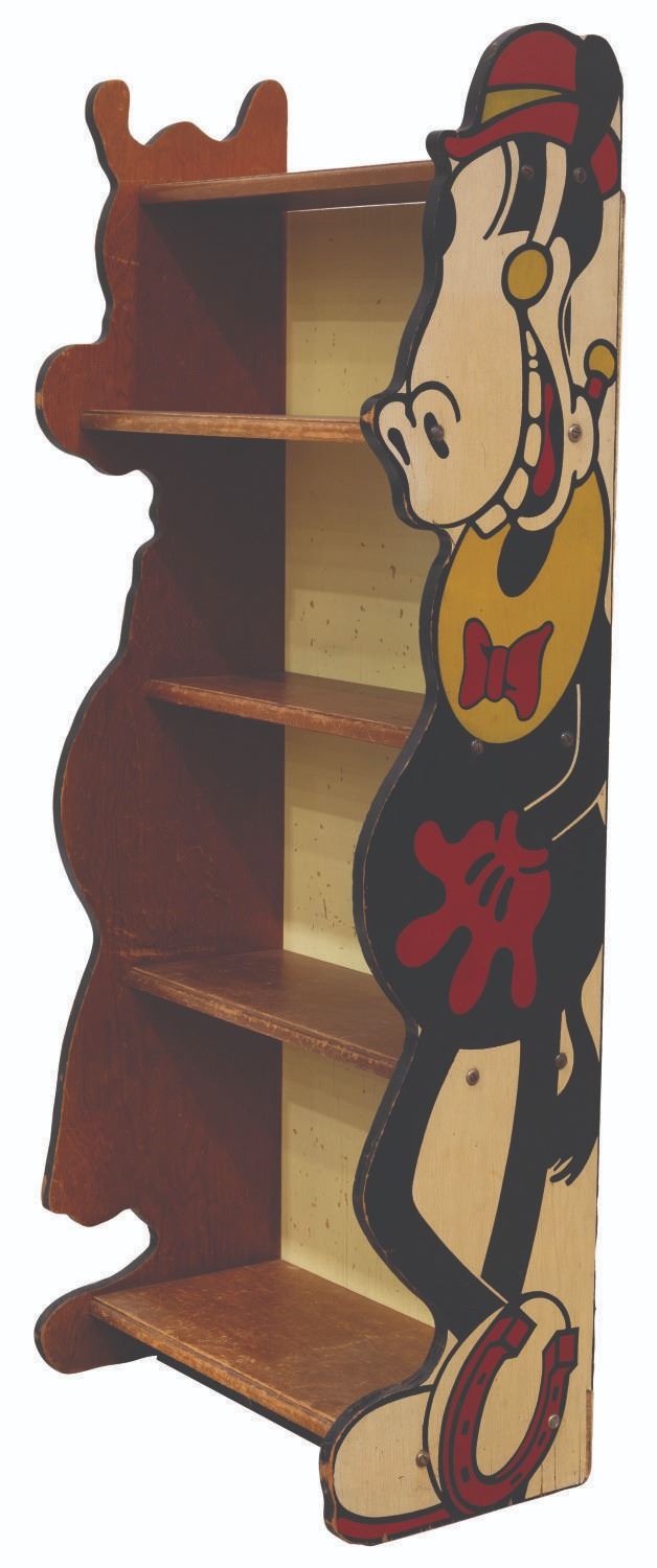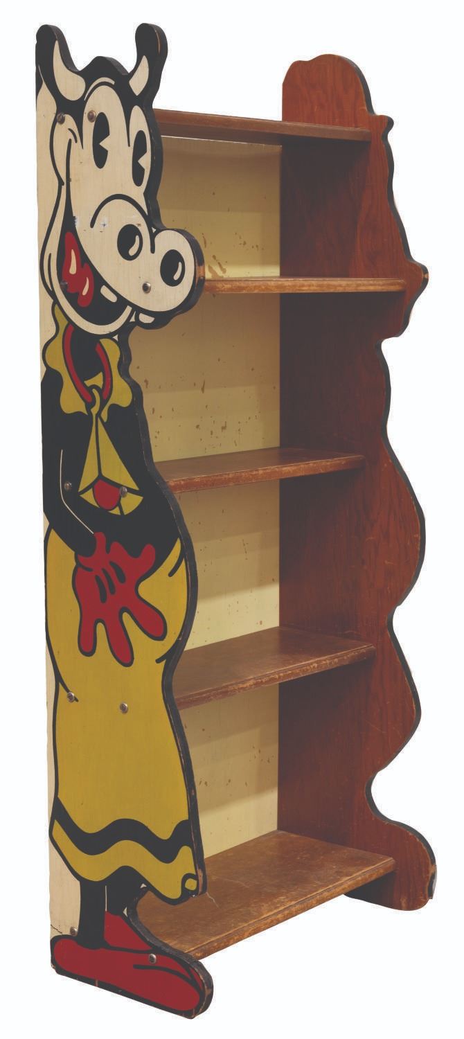 (Kroehler, 1930s) A rare Clarabelle Cow and Horace Horsecollar bookcase produced by Kroehler Manufacturing. Measuring 21.5" x 12" x 52.5" tall, the bookshelf displays in good condition with heavy scratches throughout, cracks, chipping, paint loss, wear, scuffs, and scrapes, notably on the interior. This lot requires special shipping arrangements. Please inquire before bidding.