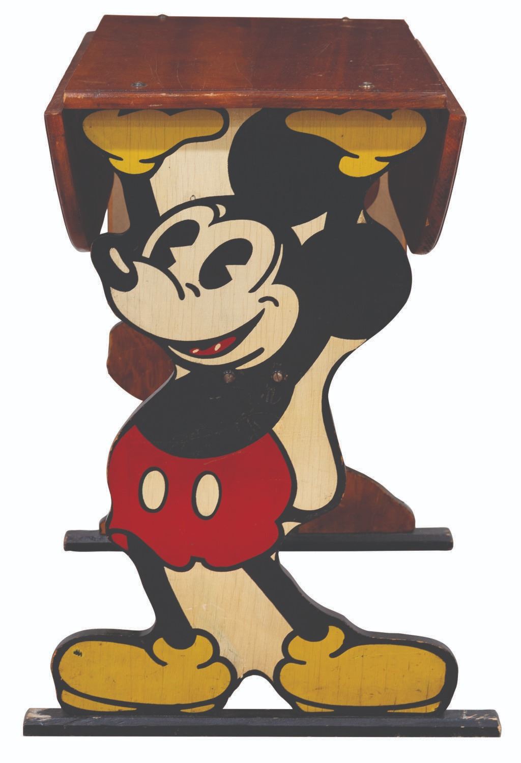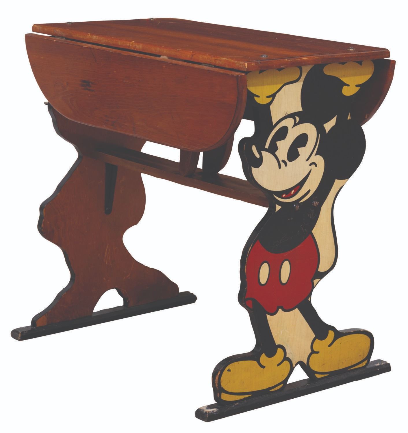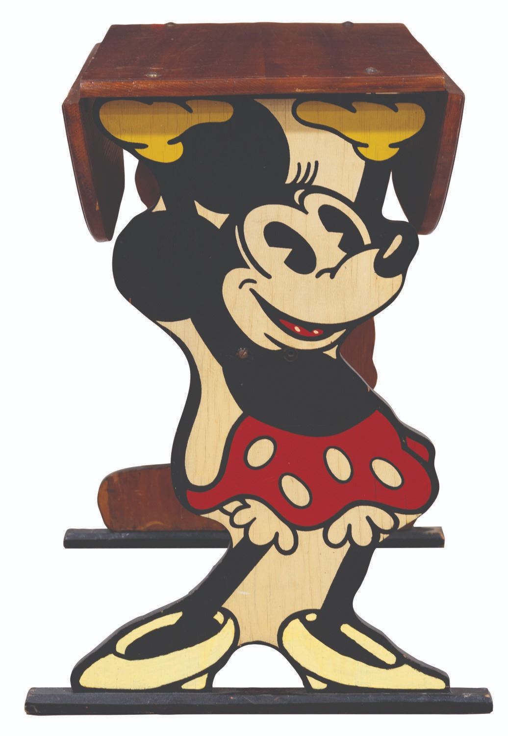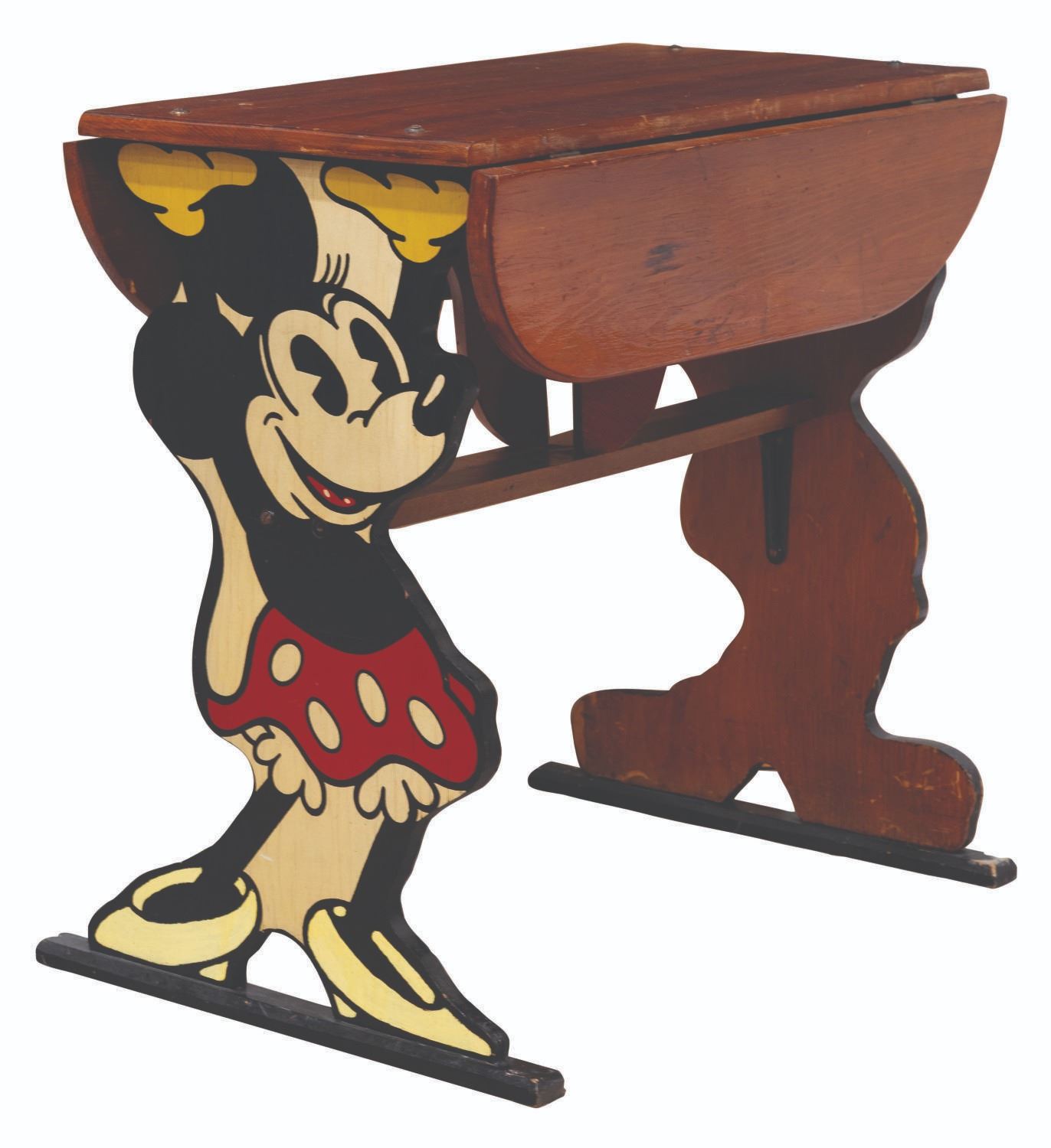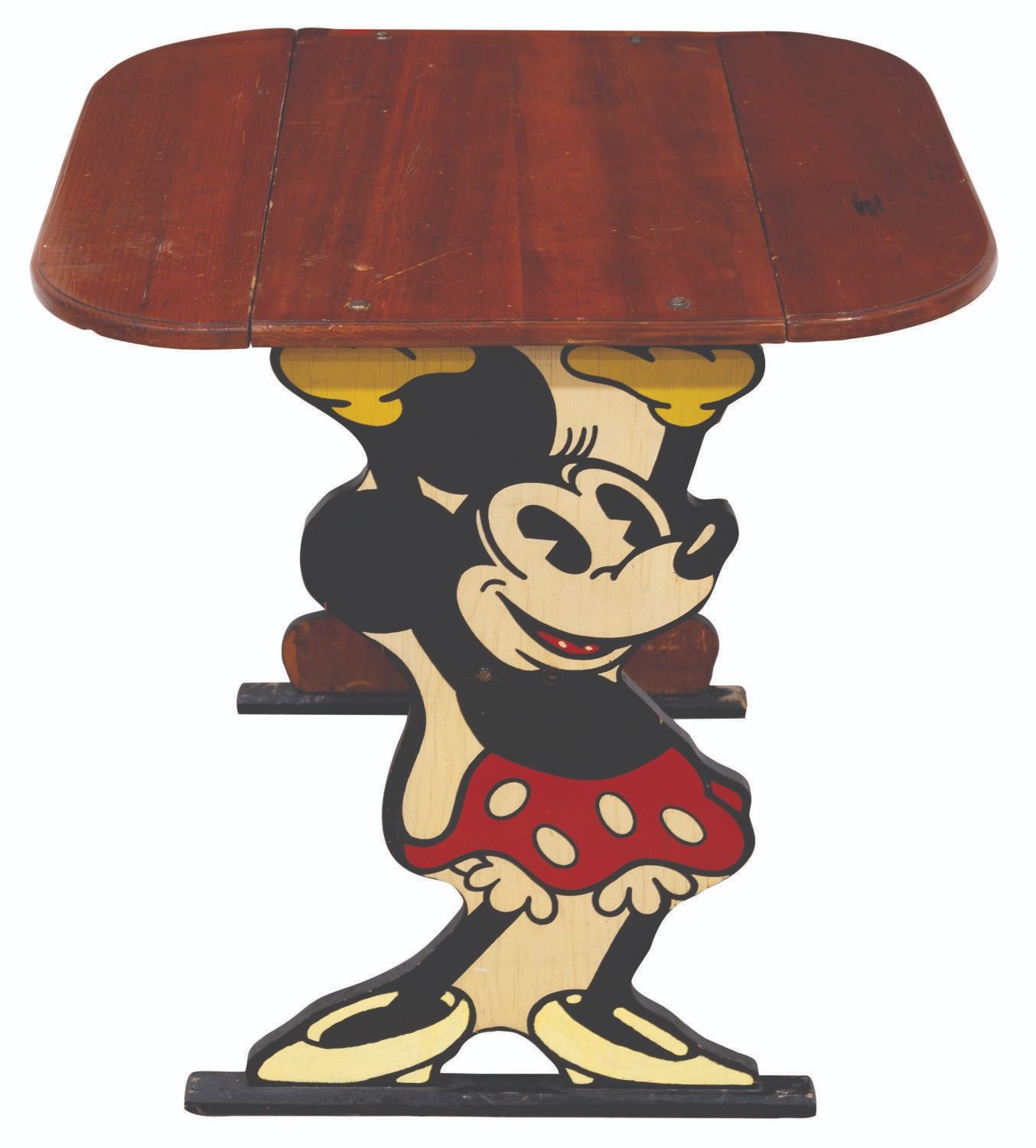 (Kroehler, 1930s) A Mickey and Minnie Mouse children's table produced by Kroehler Manufacturing. Measuring 26.5" x 28" x 26.75" tall, the wooden table displays in good condition with heavy scratches, wear, stains, chipping, and scuffs from use. This lot requires special shipping arrangements. Please inquire before bidding.