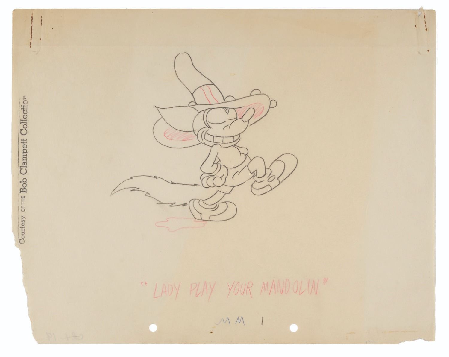 (Harman-Ising, 1931) An original production drawing of Foxy from the first Merrie Melodies short, “Lady, Play Your Mandolin!” With an image size of 5” x 5.5” on 9.5” x 12” animation paper, stamped “Courtesy of the Bob Clampett Collection,” the graphite and colored pencil drawing is in good condition with stains, edge wear, a full horizontal fold at the top, and 0.75” x 3” of missing paper at the bottom left corner.