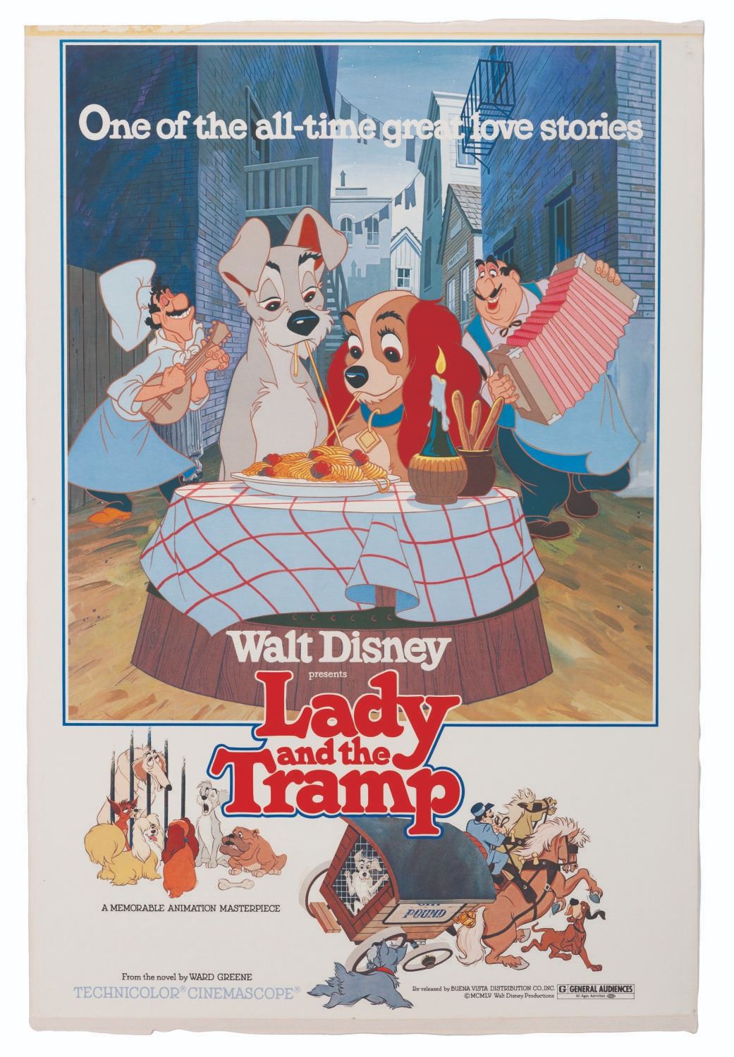 (Disney, 1980) A one-sheet poster for the 1980 re-release of"Lady and the Tramp." Measuring 27" x 40.5", the poster is in good condition with scratches, spots of discoloration, and adhesive residue at the top and bottom from previous display, resulting in extra paper.