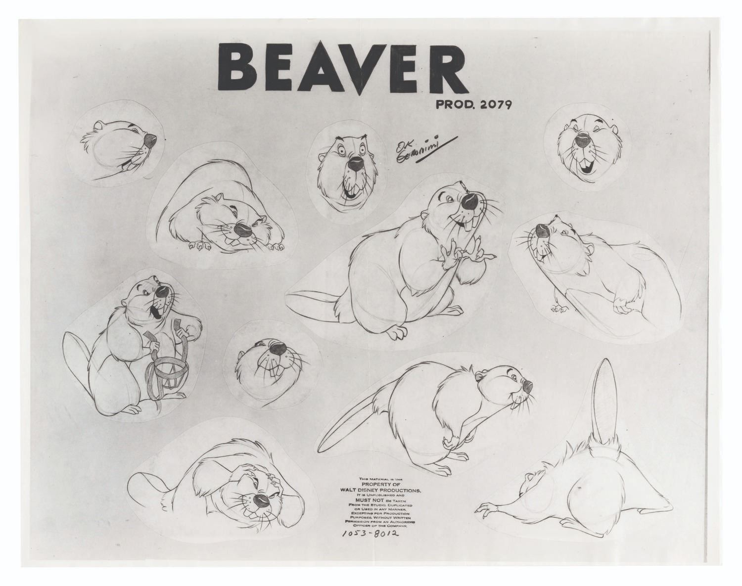 (Disney, 1955) A production used photostat model sheet of the Beaver from “The Lady and the Tramp.” Model sheets such as these were distributed to animators and crew working on the film to ensure character design continuity. The 11” x 14” model sheet is in very good condition with light wear from production use.