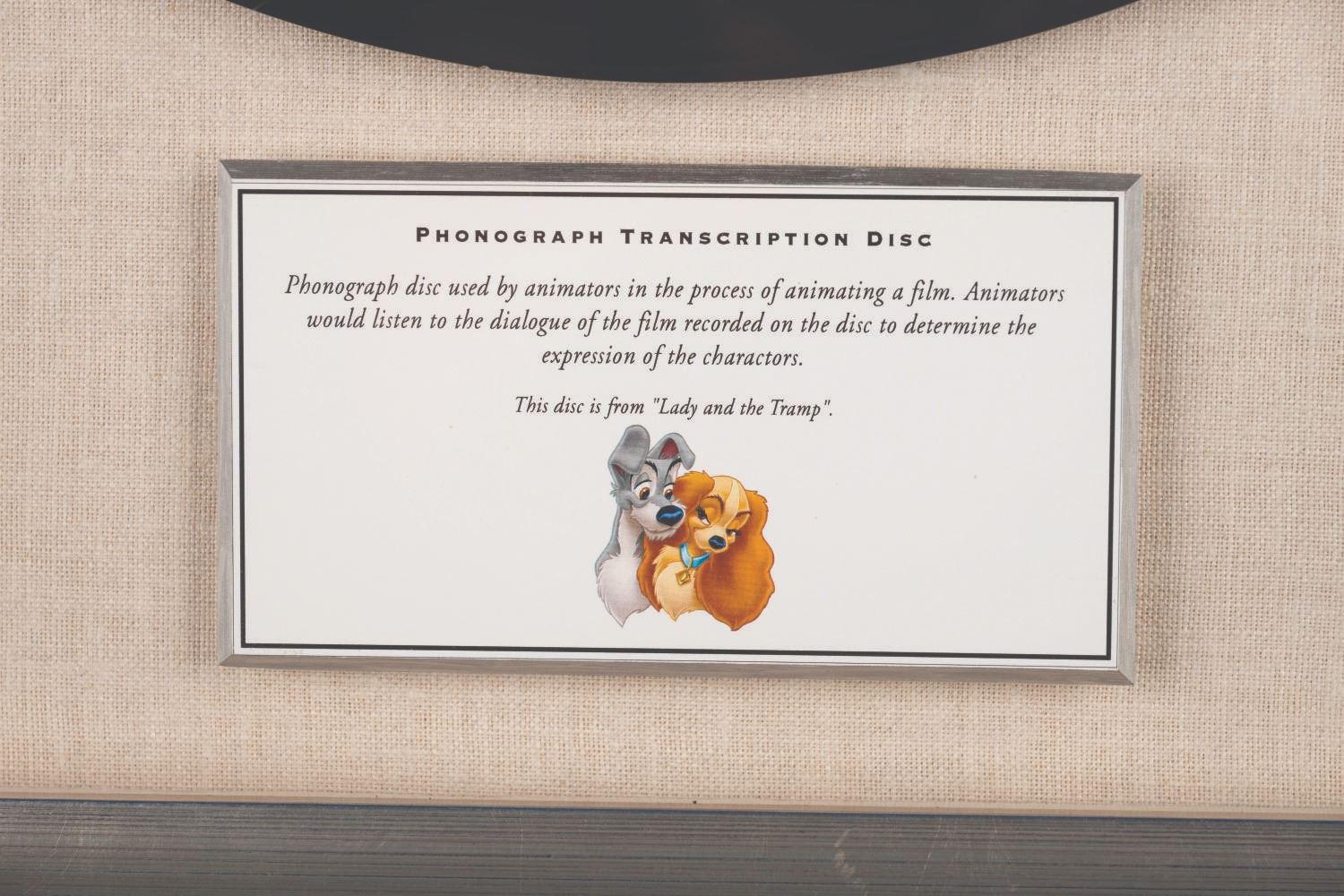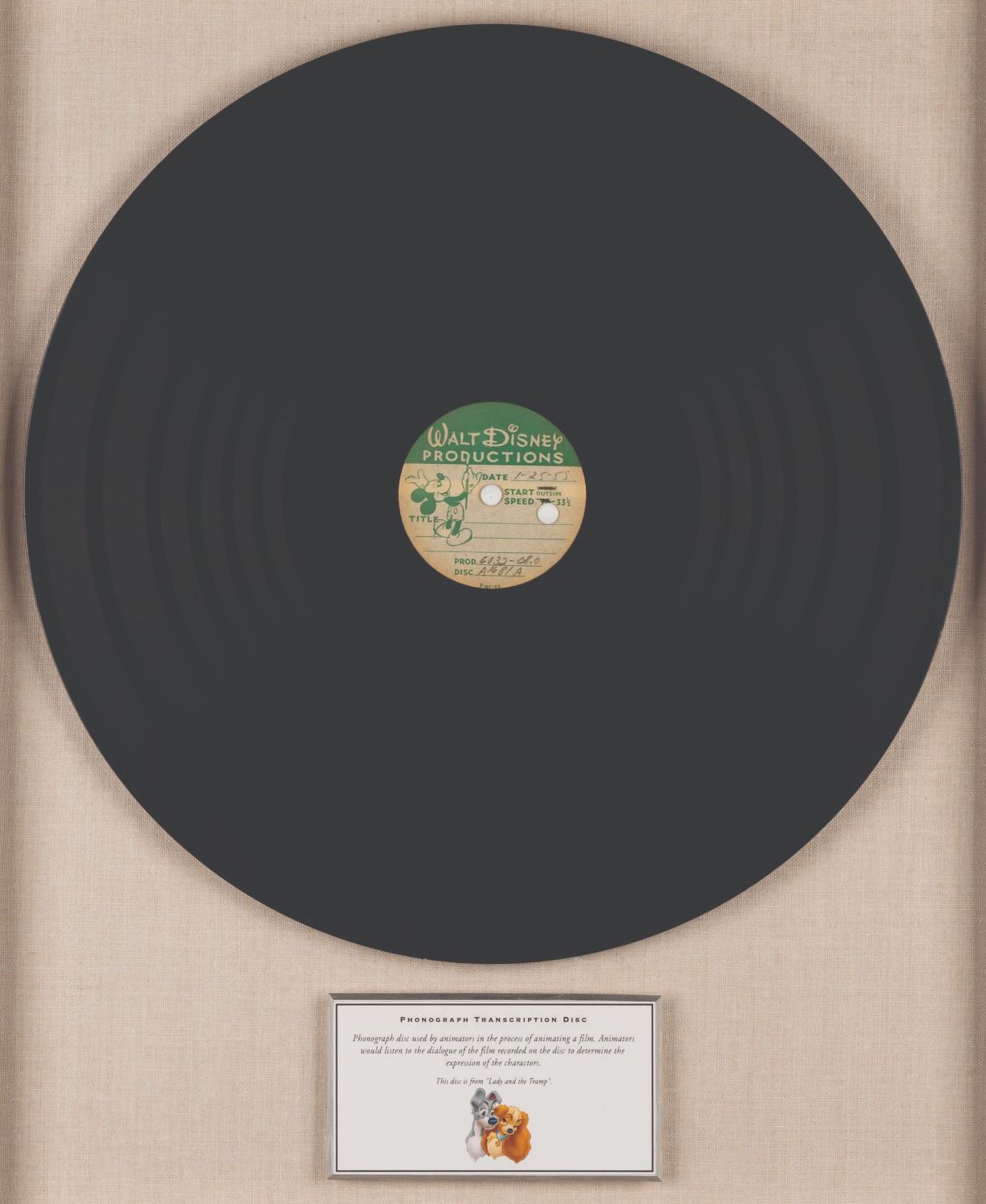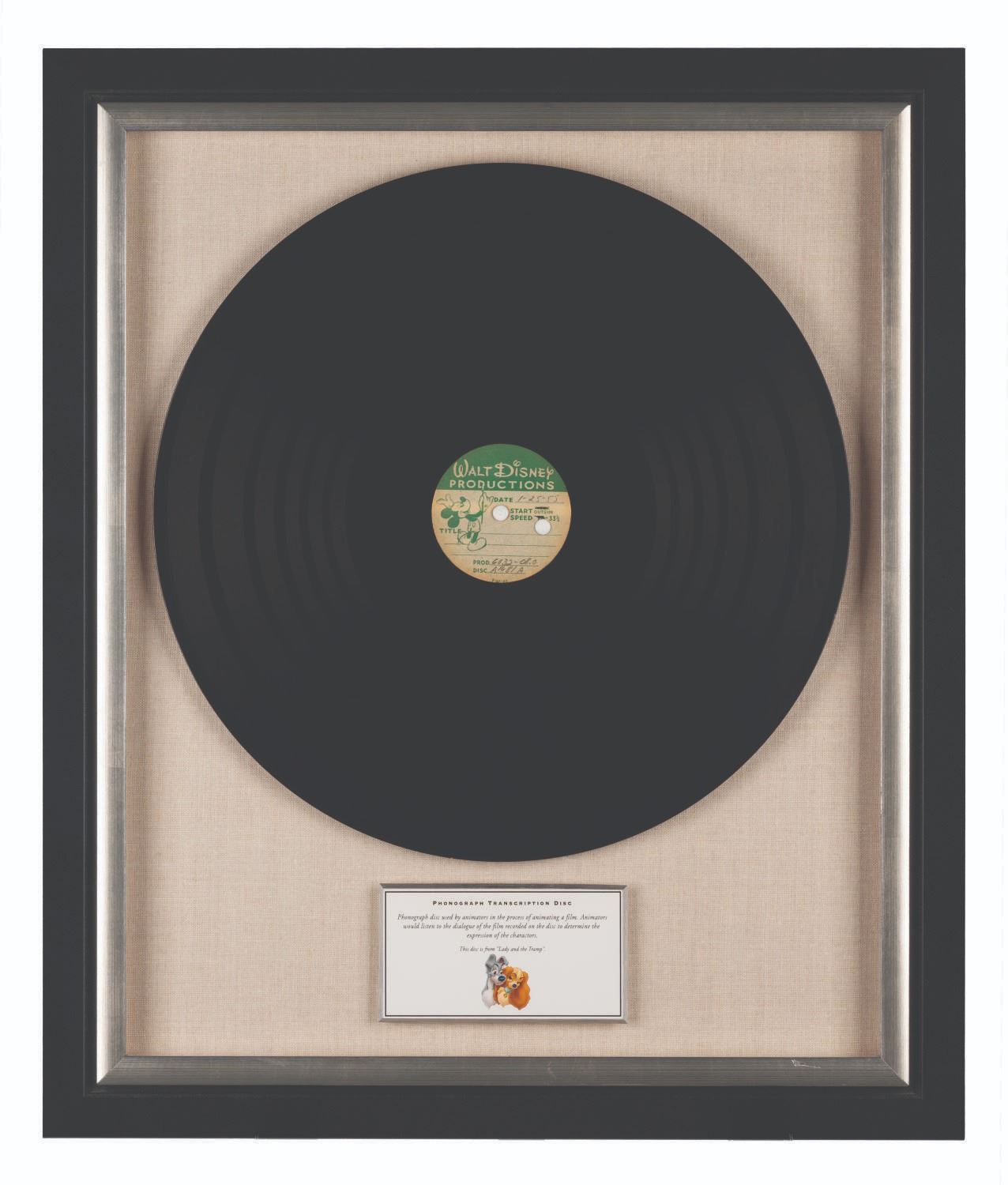 (Disney, 1955) A large format Walt Disney Productions acetate recording for "Lady and the Tramp." Dated January 25, 1955, the acetate is in playable condition, but because of its large size has not been tested. Most Studio acetates like these contain single songs or cuts being considered for a production, or recordings of dialogue used to animate the characters. This acetate is from the personal collection of Disney sound designer Glenn Barker. The 16” acetate is in very good condition, exhibiting a few scratches and minor wear. It has been custom framed for display.