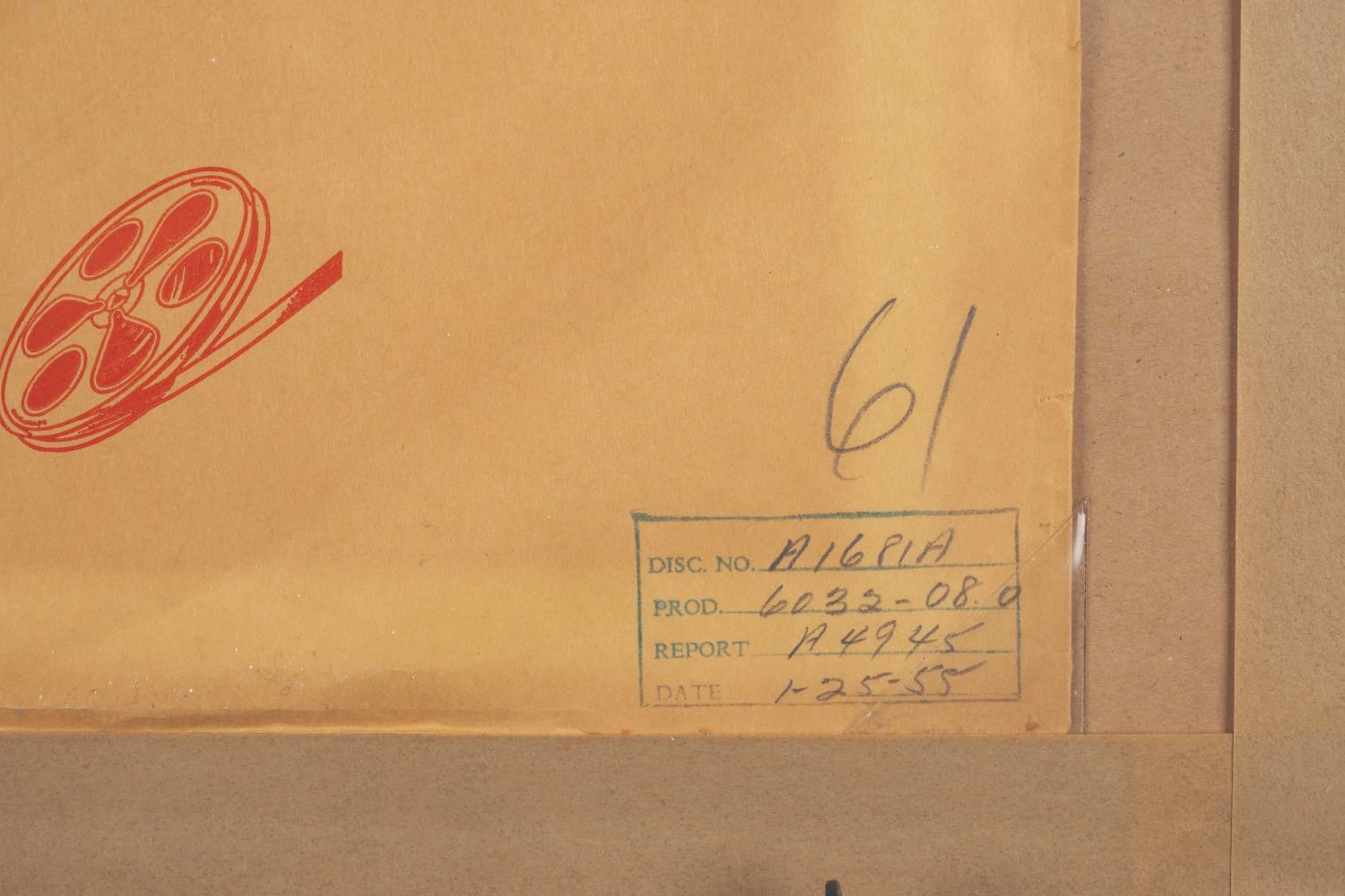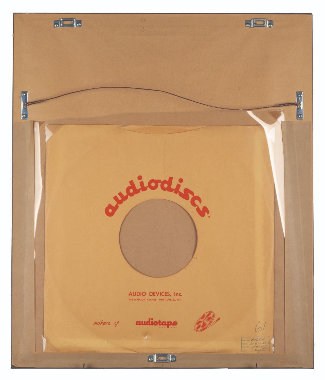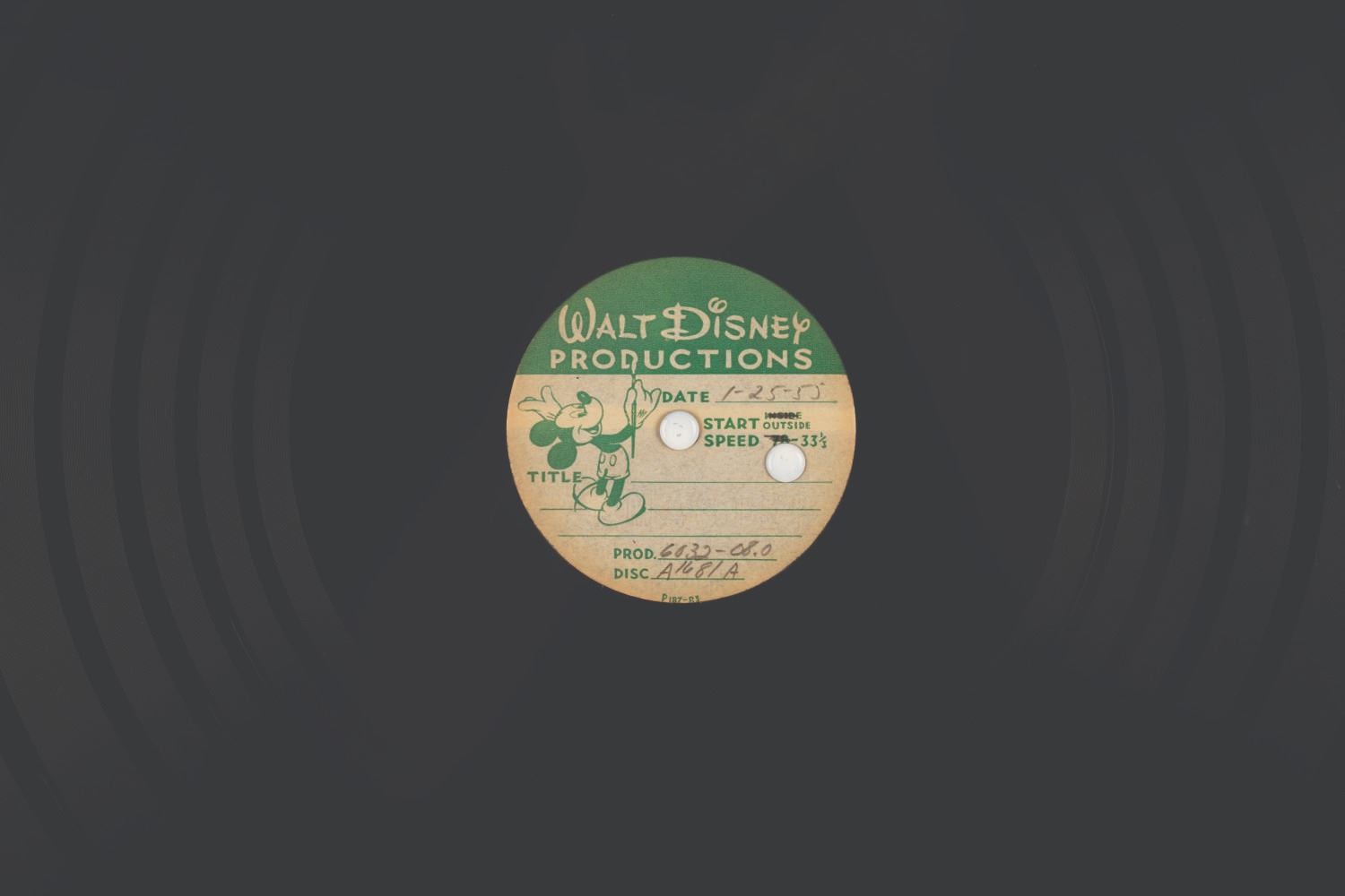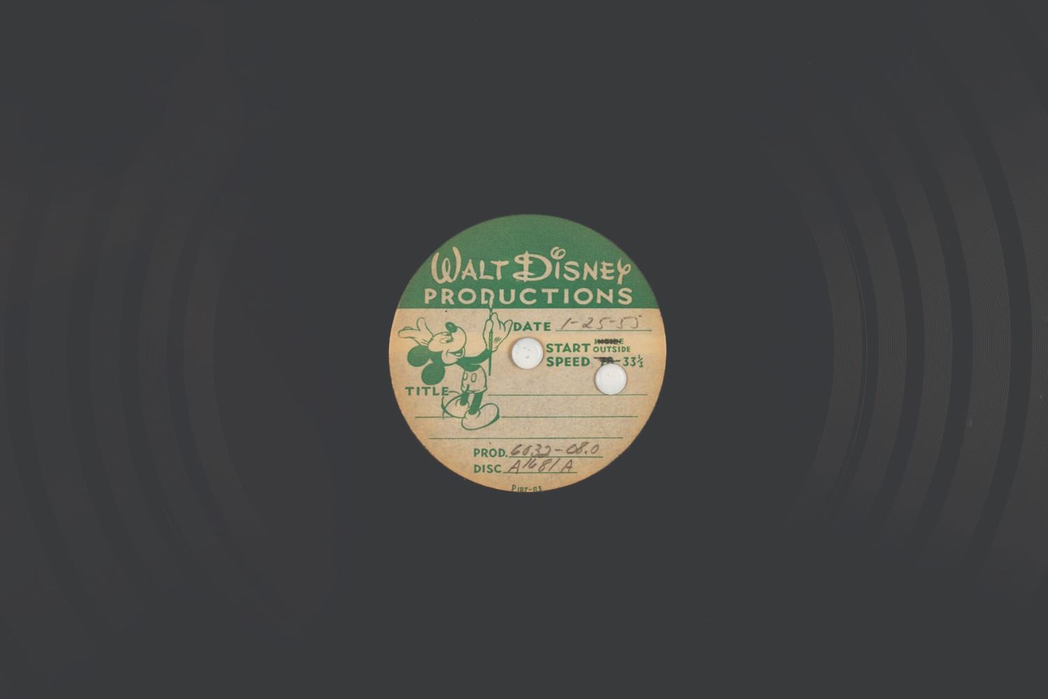 (Disney, 1955) A large format Walt Disney Productions acetate recording for "Lady and the Tramp." Dated January 25, 1955, the acetate is in playable condition, but because of its large size has not been tested. Most Studio acetates like these contain single songs or cuts being considered for a production, or recordings of dialogue used to animate the characters. This acetate is from the personal collection of Disney sound designer Glenn Barker. The 16” acetate is in very good condition, exhibiting a few scratches and minor wear. It has been custom framed for display.