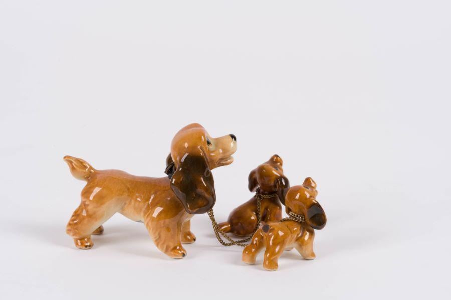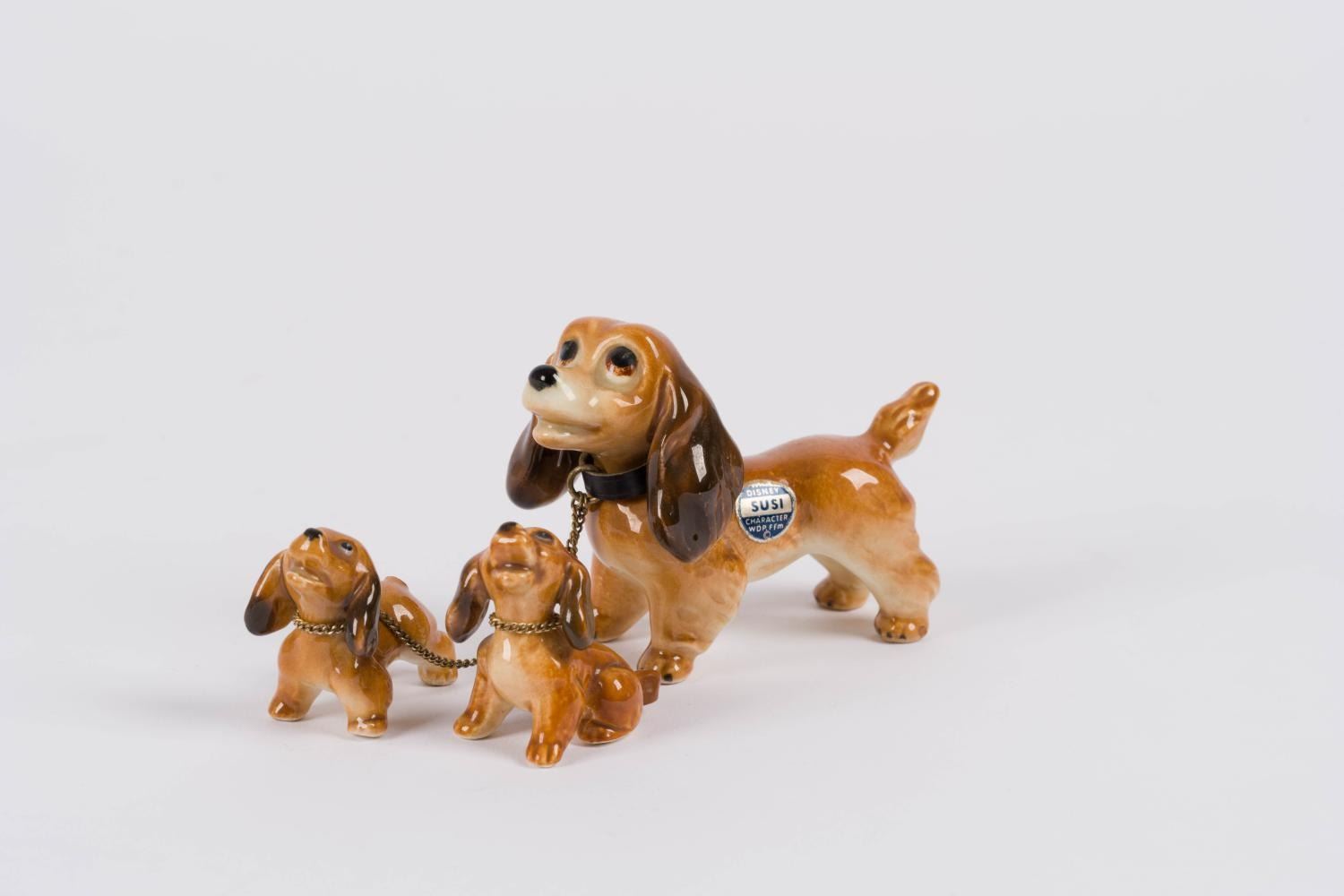 (Goebel, 1950s) A trio of ceramic figurines of Lady from "Lady and the Tramp" with two puppies connected to one another by tiny chains attached at their collars. The Lady figurine has a sticker on the side that reads "Susi," the character's name in the German dub of the film. Lady measures 1.5" x 3" x 2.25" tall, and the puppies measure 1" x 1.5" x 1.25" tall, and 1" x 1.5" x 1.5" tall and are each in very good condition with some wear from age.