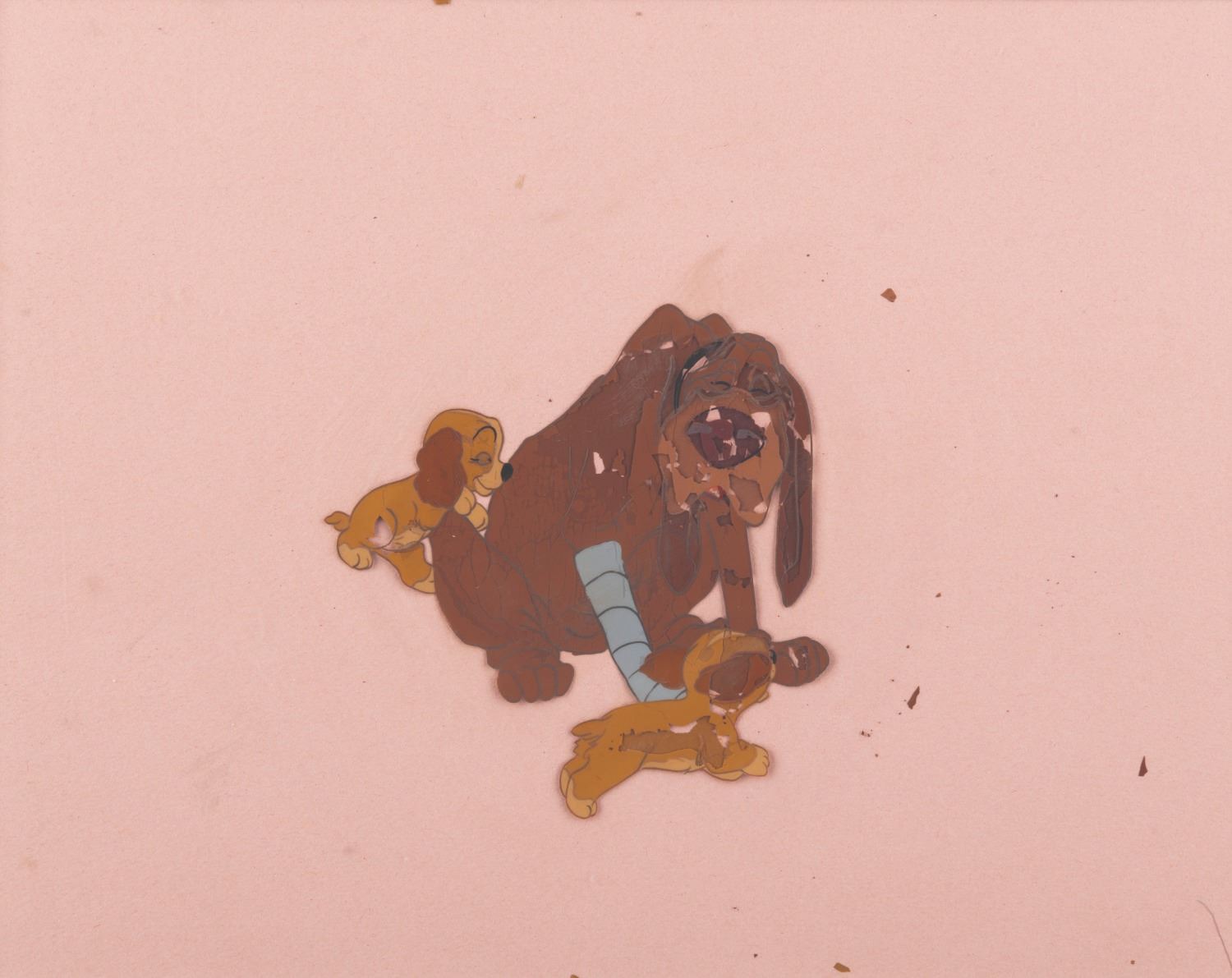 (Disney, 1955) An original production cel of Trusty and Puppies from "Lady and the Tramp." This cel was sold at the Disneyland Art Corner, and comes with the original Art Corner gold label on the reverse of the matte. The characters have an image size of 4" x 4" on a 7.5" x 9.5" visible cel. The entire matted piece measures 11" x 14". The cel is in poor condition with heavy paint cracking, loss, and transfer to the matte, and scattered paint chips.