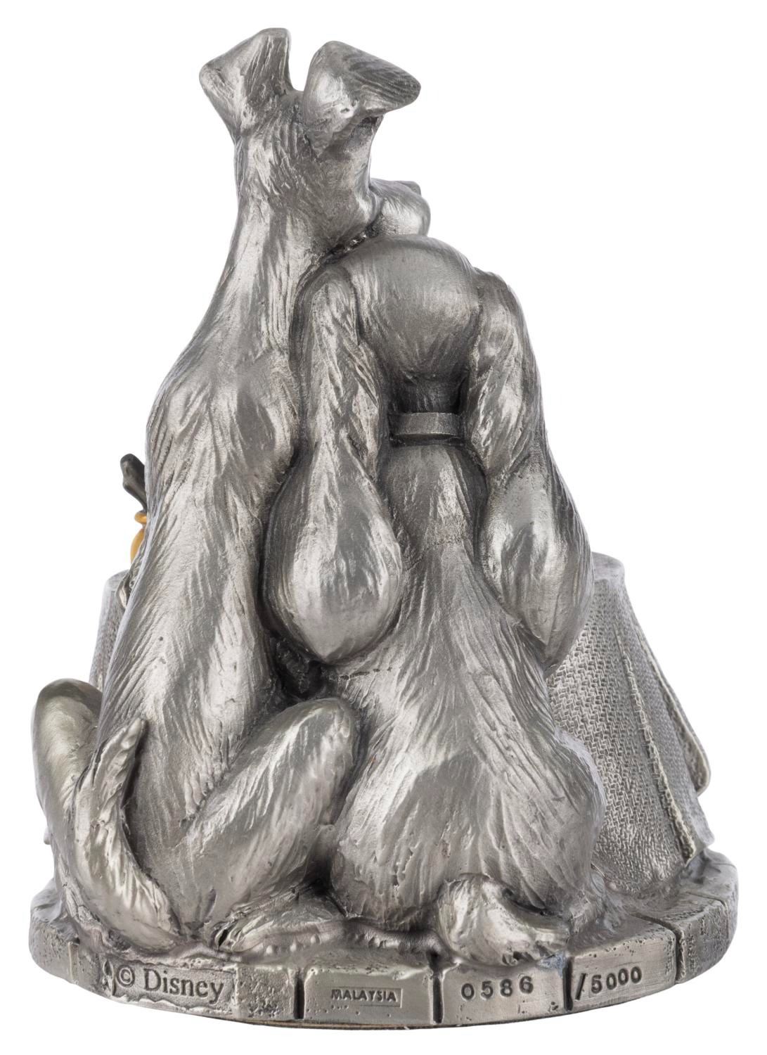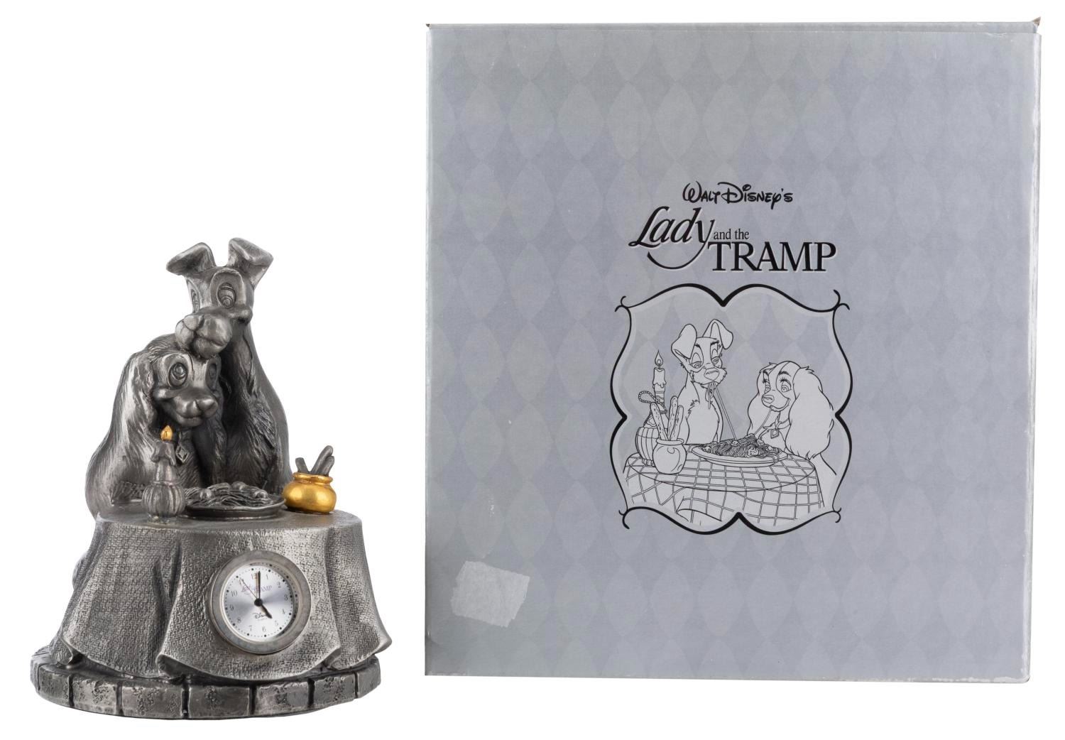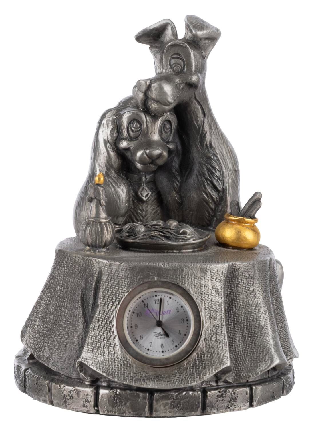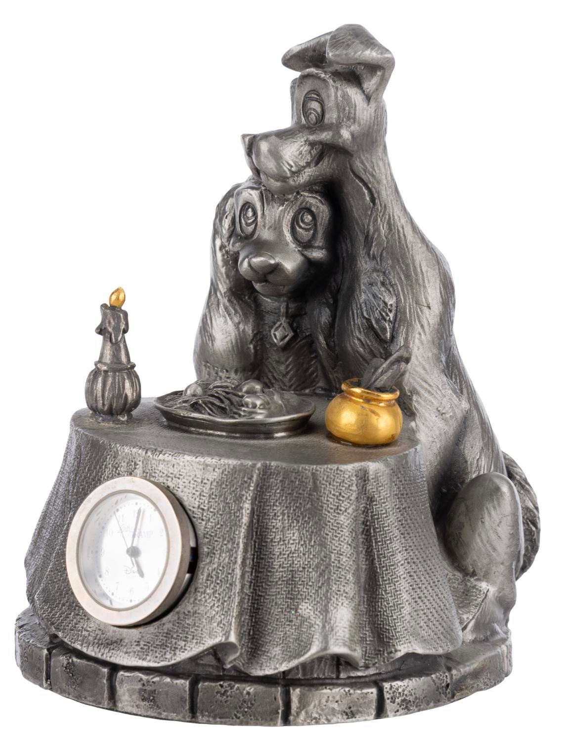 (Disney, 2000) A pewter "Lady and the Tramp " figurine with an inset clock. Numbered 0586/5000, the clock stands 4.5 " tall and is in fine condition, requiring a battery and possibly service to function.