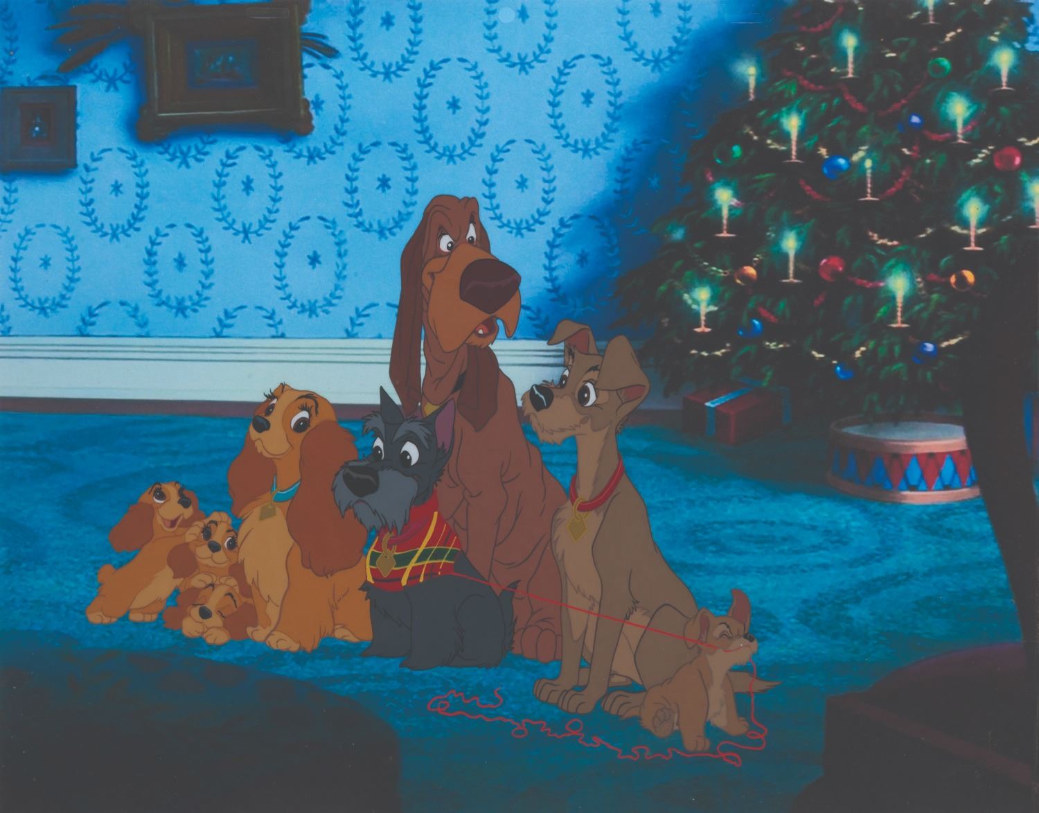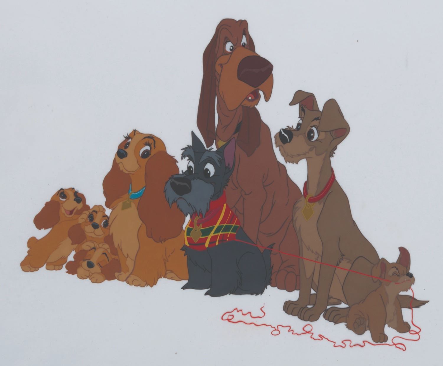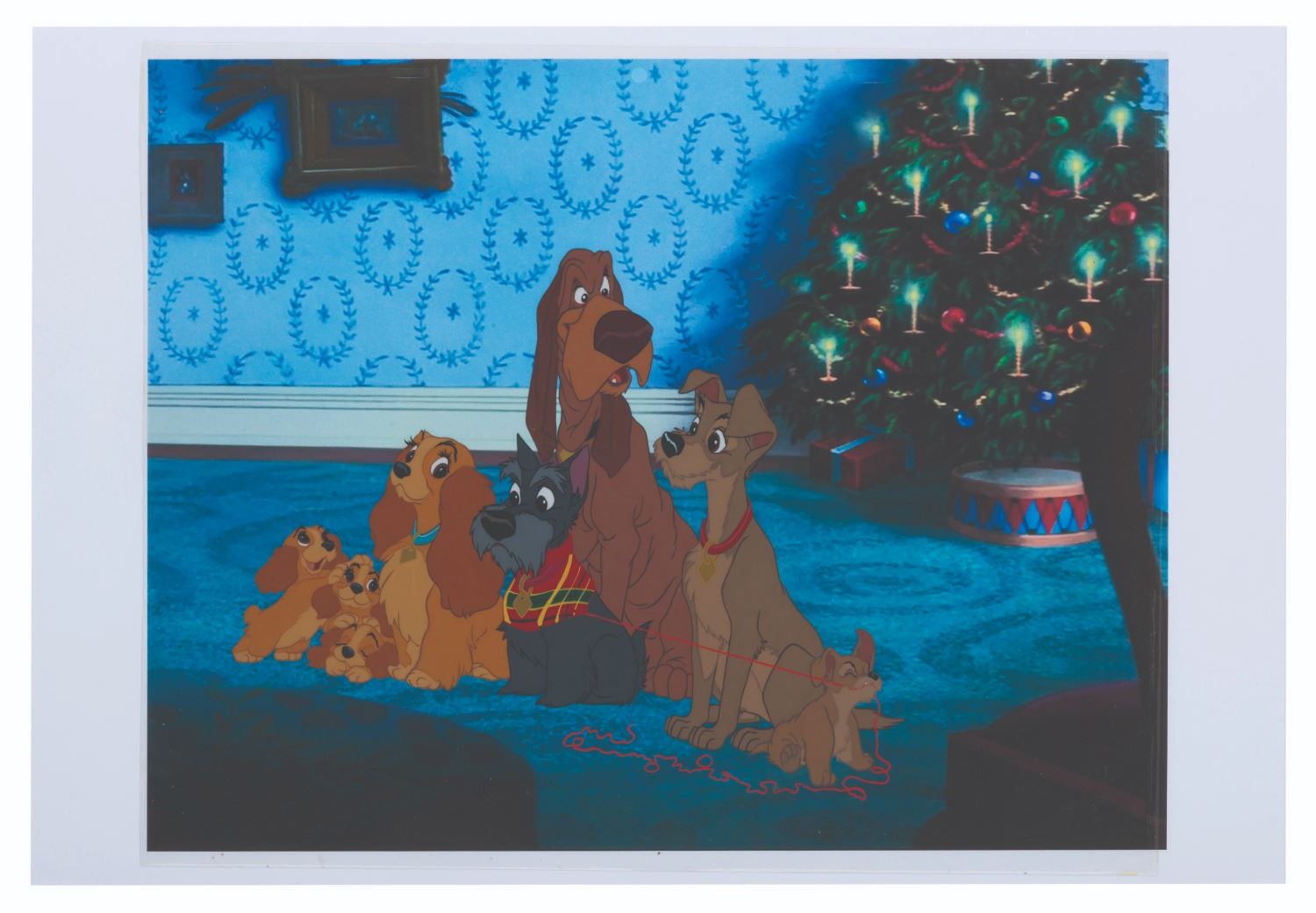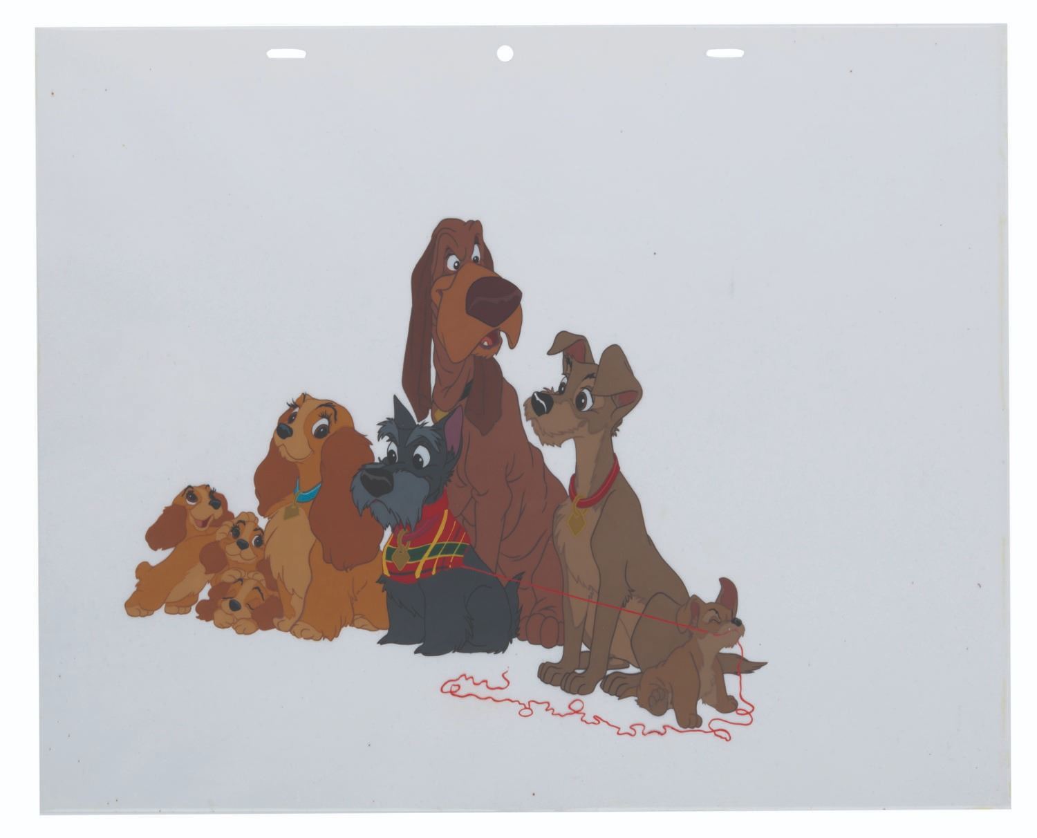 (Disney, 1955) A hand-inked Studio publicity cel from the original release of “Lady and the Tramp” with a color copy background. Included on the cel are Lady, Tramp, their adorable offspring, Jock in his holiday sweater, and Trusty, likely regaling a story about Old Reliable. The characters measure 8.25” x 10.25” on a 12” x 15.5” cel. The cel displays in very good condition with light areas of restoration, adhesive residue along the right edge, a light spot of line loss on Lady’s front left paw, and light spots of paint which do not affect the image.
