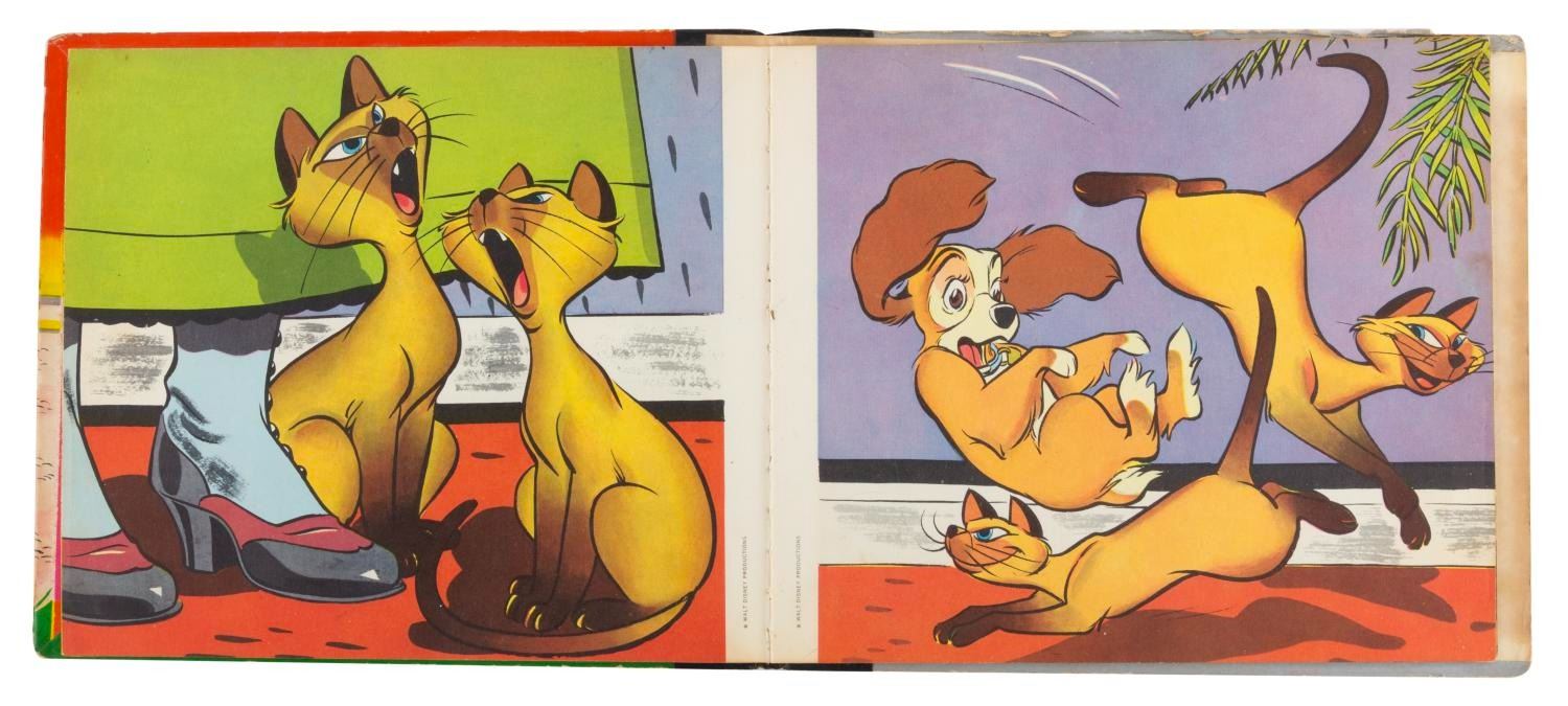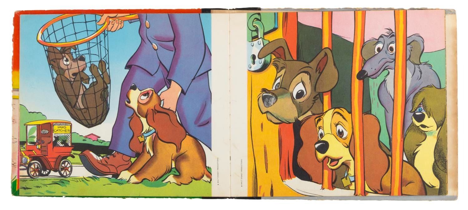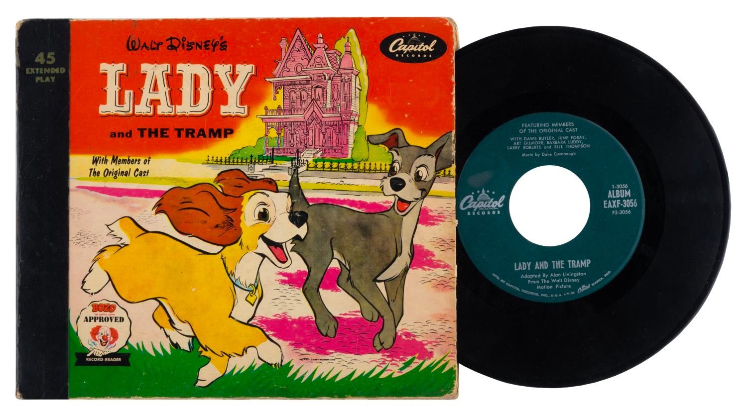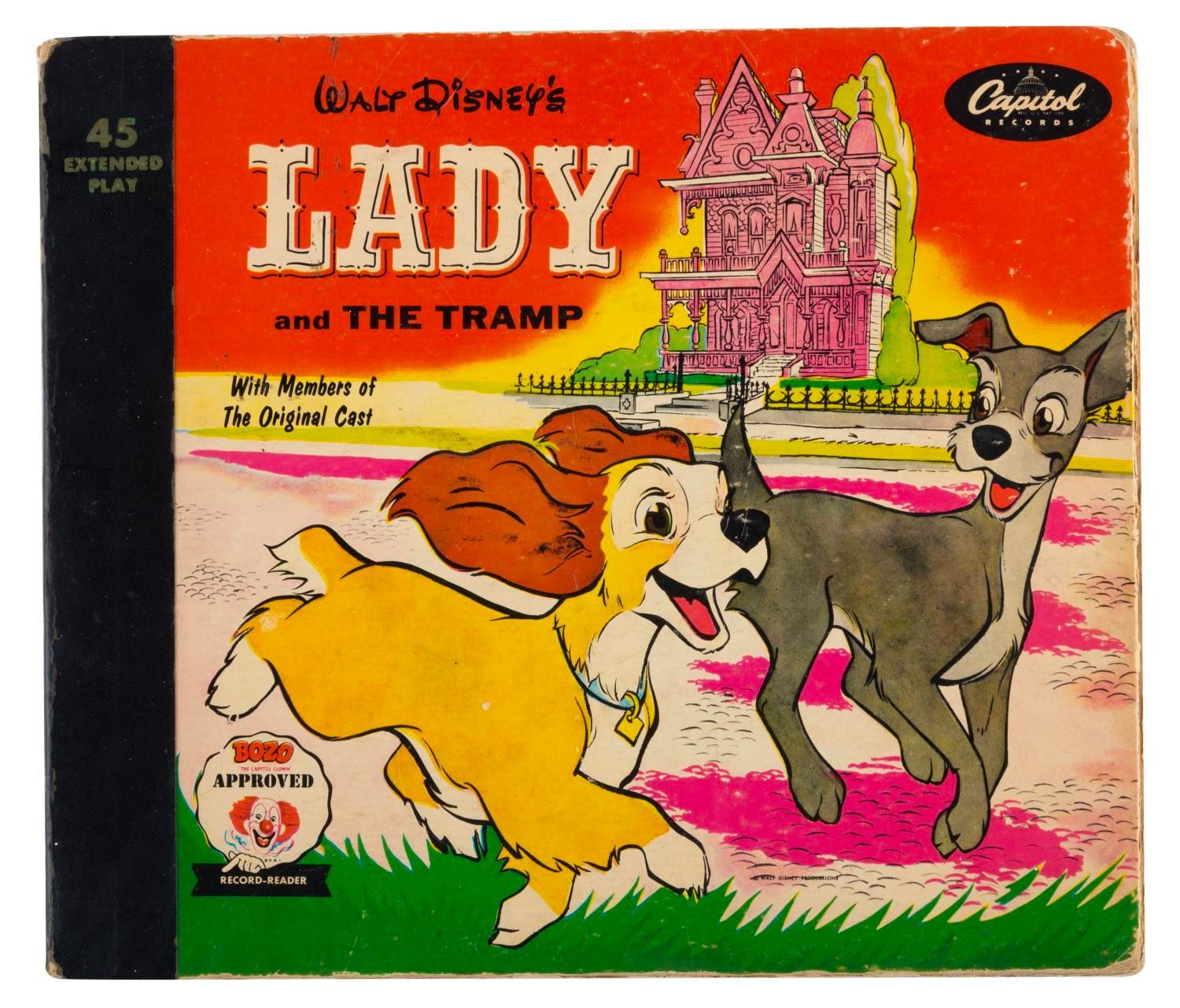 (Capitol Records, 1954) A "Lady and the Tramp" 45 rpm record of the film’s story with a 19-page picture book. Measuring 7.25" x 8.25" overall, the sleeve and record are in good condition with edge wear and scuffs to the cover, and small scratches to the record from use.