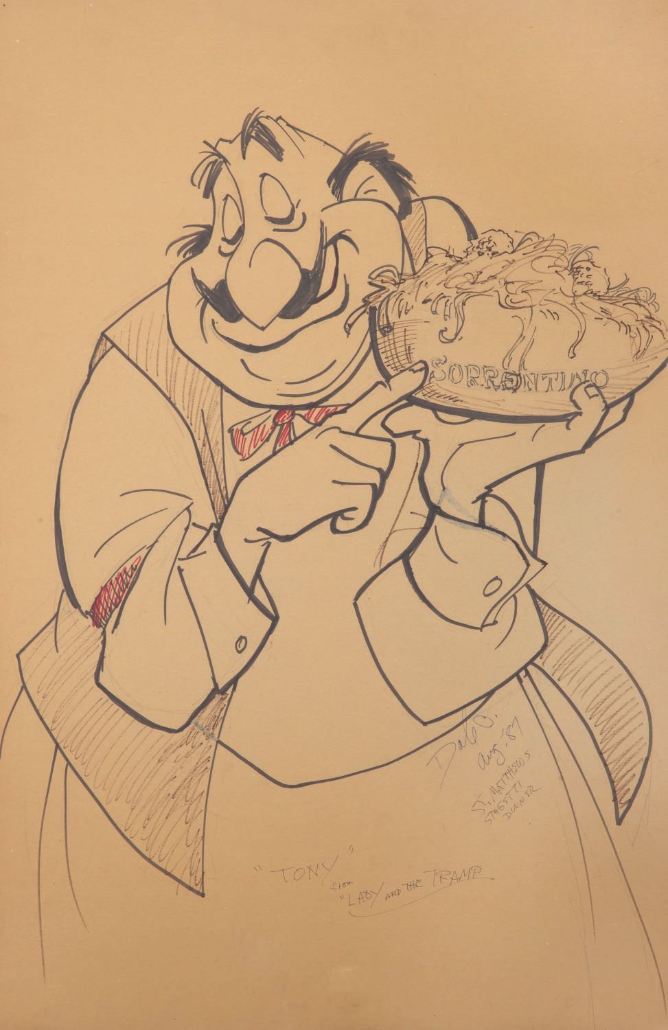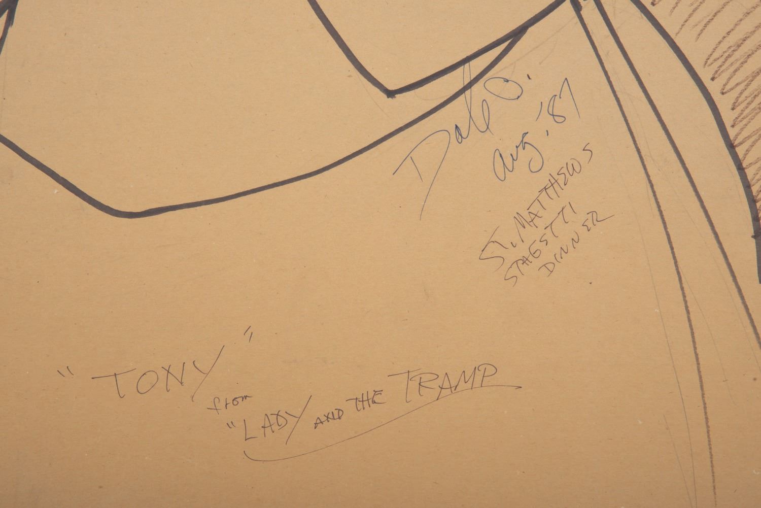 (Dale Oliver, 1987) An oversize portrait of Tony from Lady and the Tramp by Disney artist Dale Oliver. For thirty-five years Oliver was a noted assistant animator at Disney, working closely with Eric Larson and especially Frank Thomas. Oliver noted directly on the pencil and marker oversized image that it was created for a St. Matthews spaghetti dinner in August of 1987, and signed the work Dale O. With image of 23.5"x28" on the 23.75"x36" chip board, the piece is in very good condition.