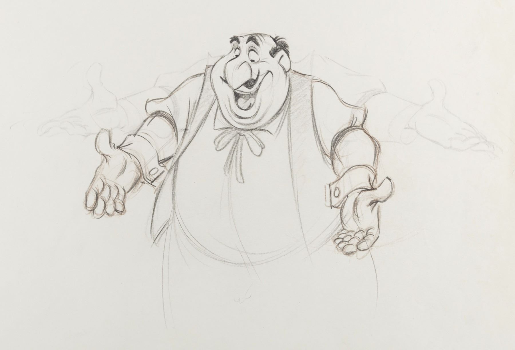 (Disney, 1955) An original production drawing in pencil of Tony from the iconic spaghetti scene of “Lady and the Tramp.” With an image size of 7.5” x 7” on 12.5” x 15.5” animation paper, the drawing is in good production-used condition with light wear, small creases that do not affect the image, and typical slight color shift to the paper from age.