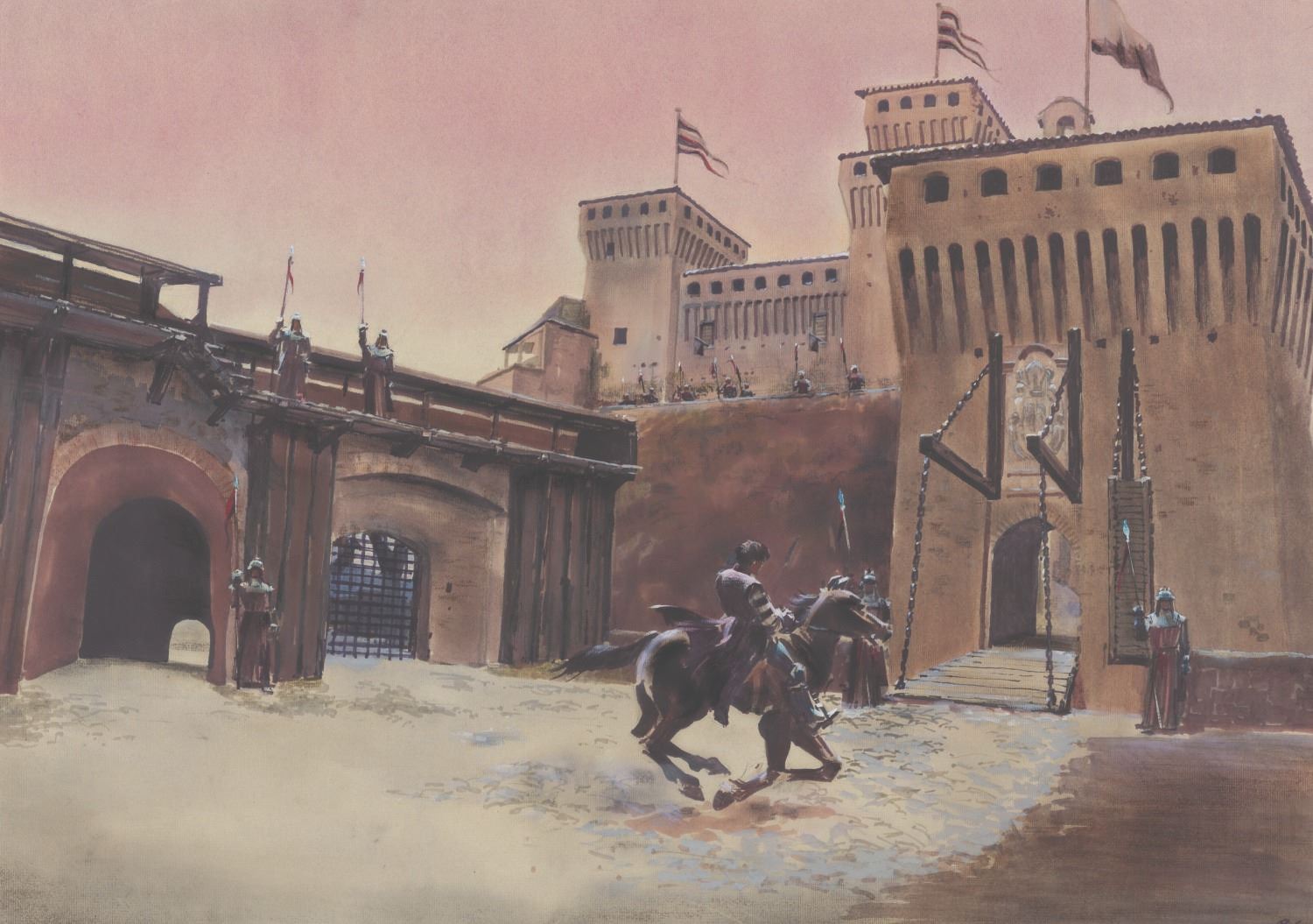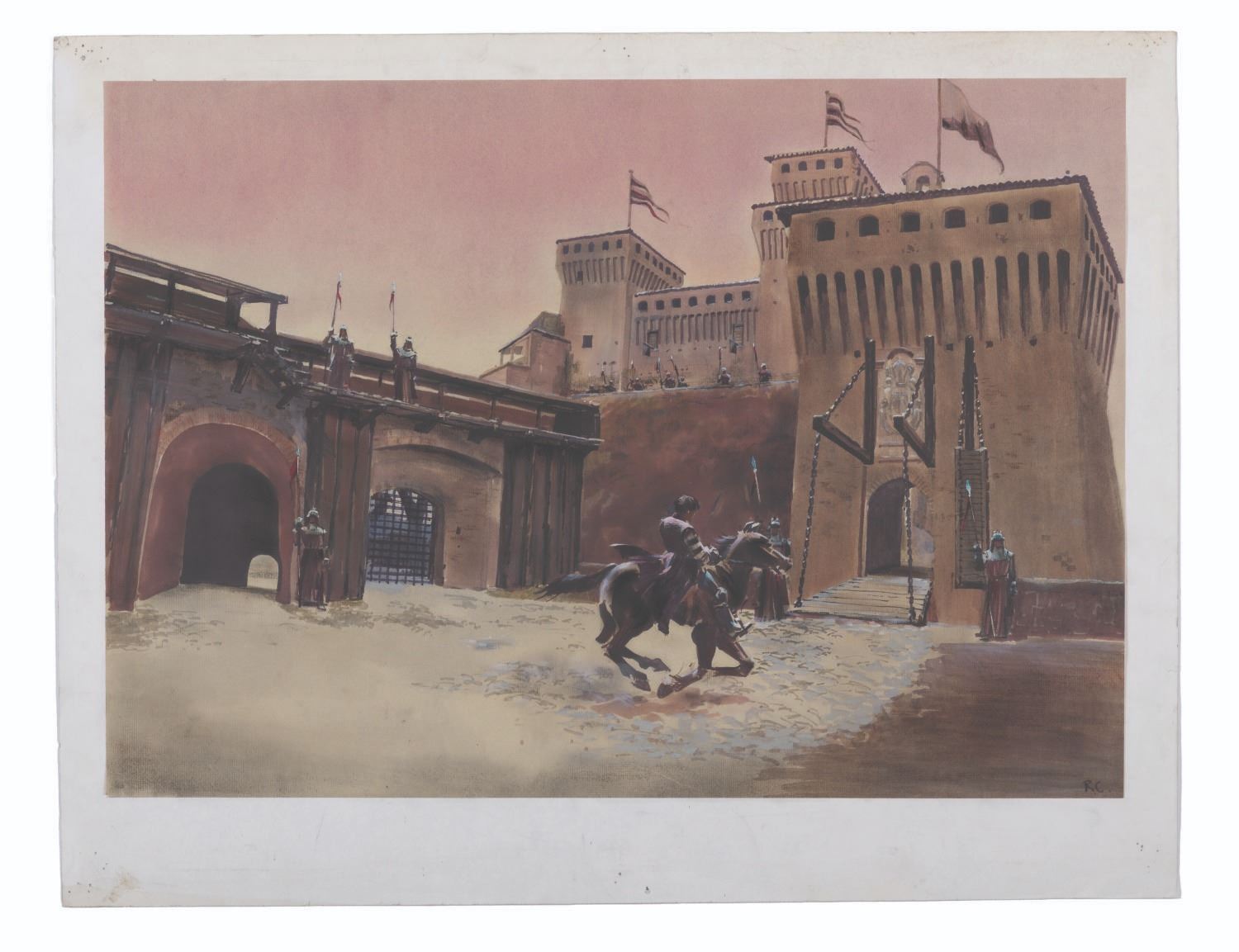 (Warner Bros., 1985) An original concept painting from the medieval fantasy film “Ladyhawke,” by Roy Carnon, who worked in the art department on classics including “2001: A Space Odyssey,” “Superman,” “Raiders of the Lost Ark,” and "Return of the Jedi.” With an image size of 17.75” x 25” adhered to 21.5” x 27.75” board, the painting is in good condition with light scratches, smudges, creases, wear, and heavy pinholes in the borders from production use.