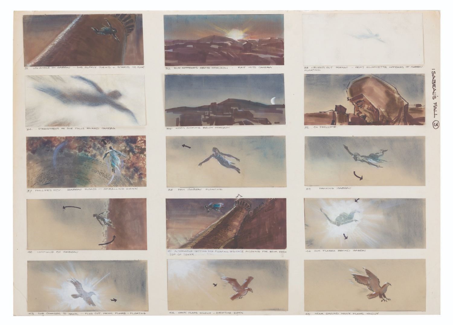 (Warner Bros., 1985) A collection of 15 original storyboard panels for a sequence in the Matthew Broderick and Michelle Pfeiffer fantasy film "Ladyhawke. " The art depicts Pfeiffer's character Isabeau falling from a tower and dramatically transforming into a hawk. Measuring 4.5 " x 10.5 " each, adhered to 26.25 " x 37 " foamcore, the panels are in very good condition with light wear from production use, while the board has creases throughout, pinholes, discoloration from age, wear, and tape on the reverse.
