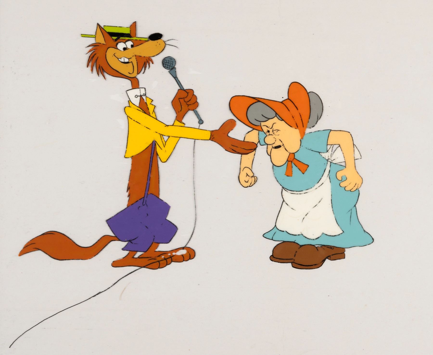 A “Laff-A-Lympics” Mildew Wolf and Mrs. Mayhem Production Cel. (Hanna-Barbera, 1977-78) An original hand-painted production cel of Mildew Wolf and Mrs. Mayhem from “Laff-A-Lympics.” Measuring 10.5” x 12.5” with a character image size of 7.5” x 5”, the cel is in good condition with line loss and paint residue from contact with another cel. Opening Bid: $10.00