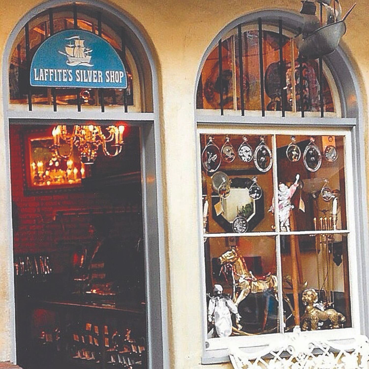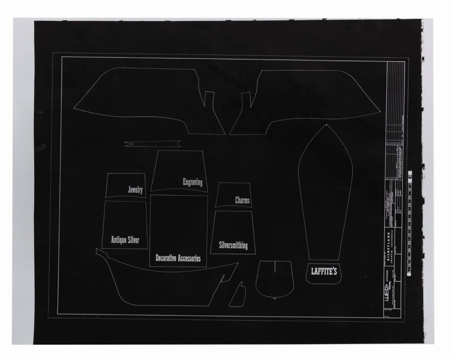(Disneyland, 1966) A photo negative transparency featuring a pirate ship schematic for Laffite's Silver Shop in New Orleans Square. The transparency outlines the pieces used to construct the three-dimensional iron pirate ship sign that hung above the window of the store from 1966 until 1988. Measuring 13" x 16.5", the transparency is in very good condition with light wear from original use.