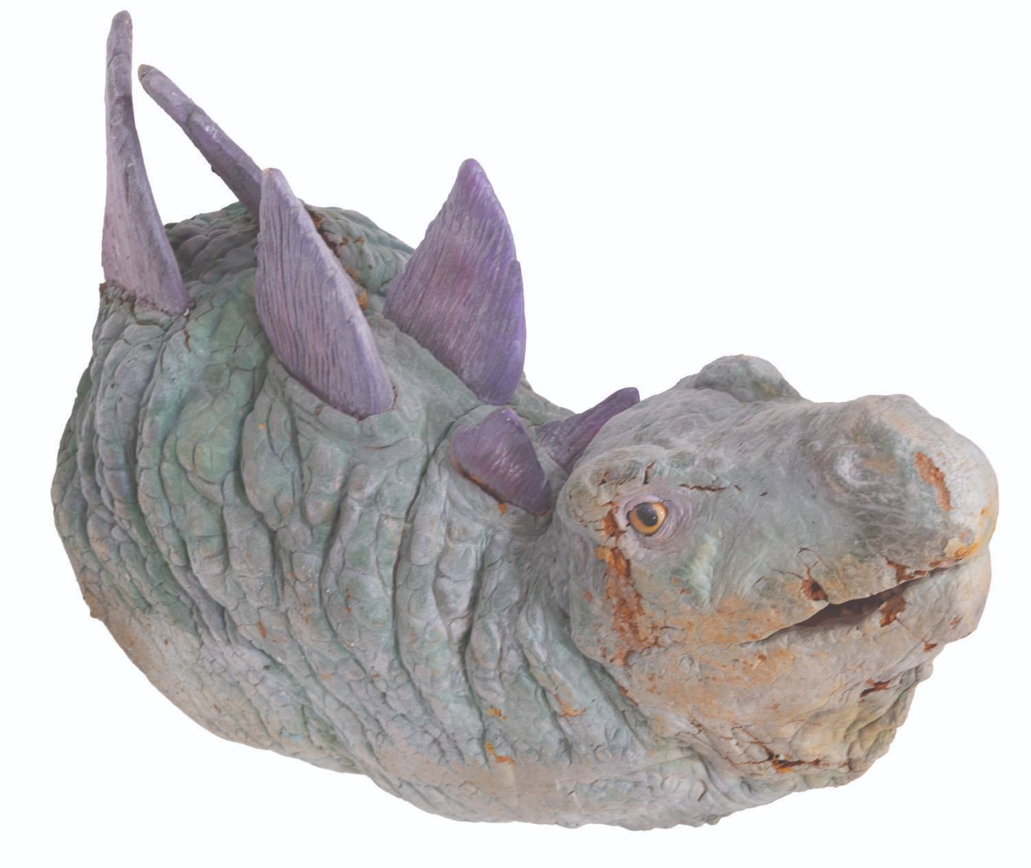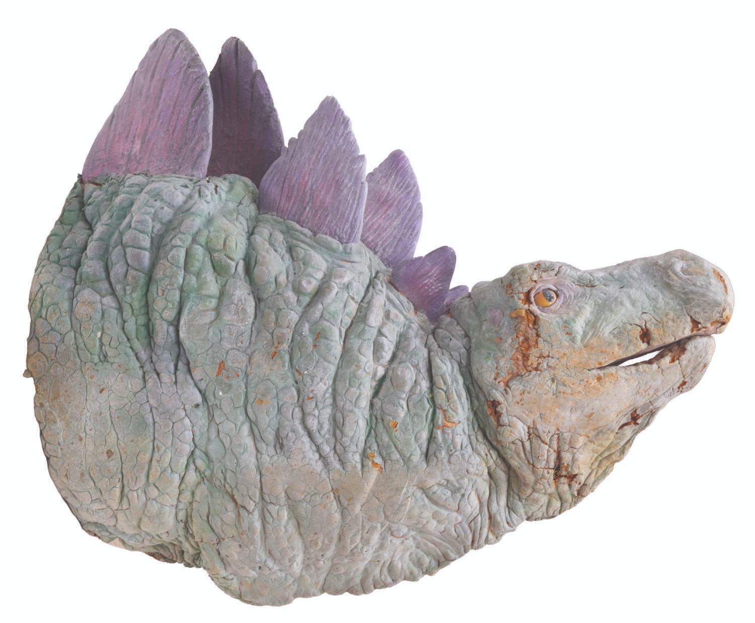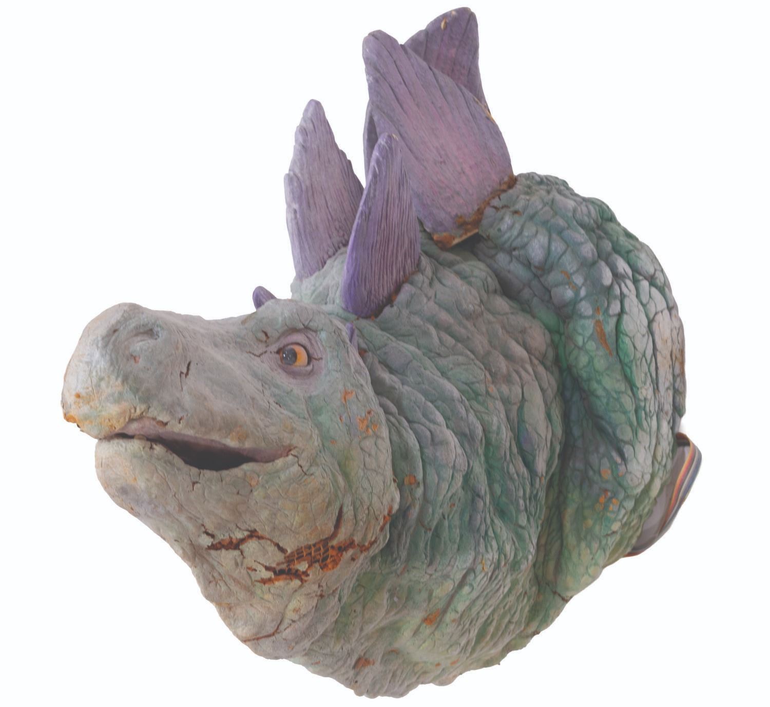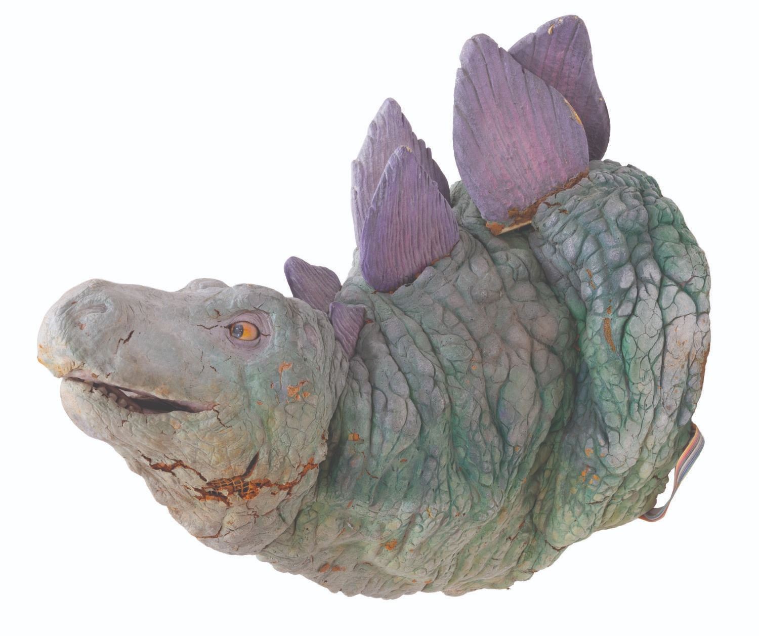 (ABC, 1991) A puppet head of the stegosaurus Spike from the 1991 Sid from Marty Krofft"Land of the Lost" television series. Built by the Chiodo Brothers, the hand-painted foam puppet contains mechanical servos to control movement that have not been tested for function. Measuring 12"x 19" x 24" Spike is in fair condition with foam loss and heavy deterioration, paint loss, soiling, and discoloration.