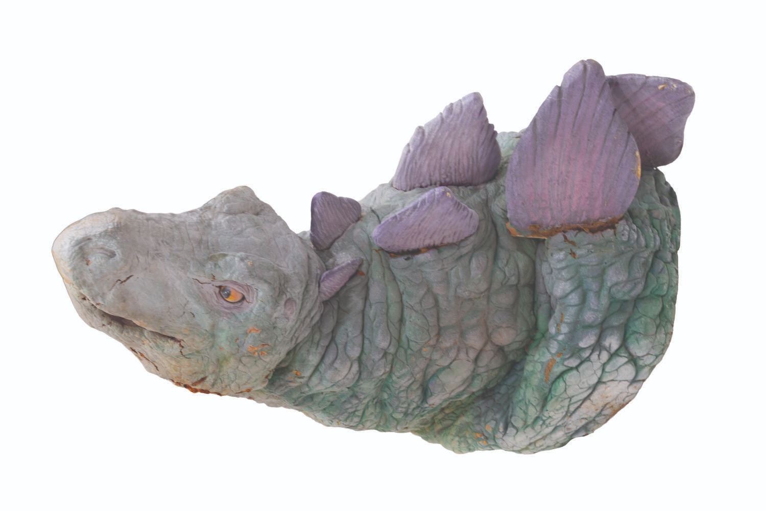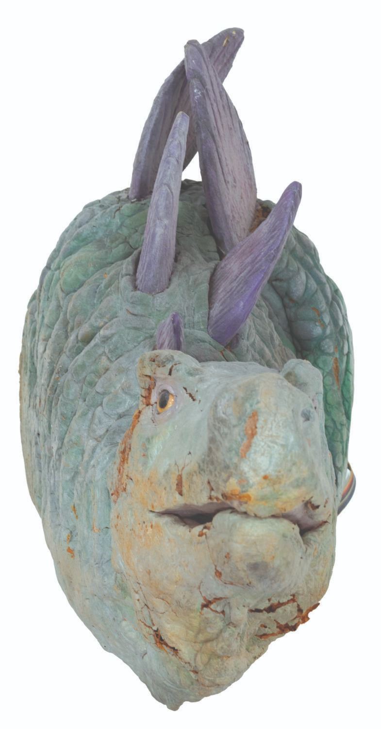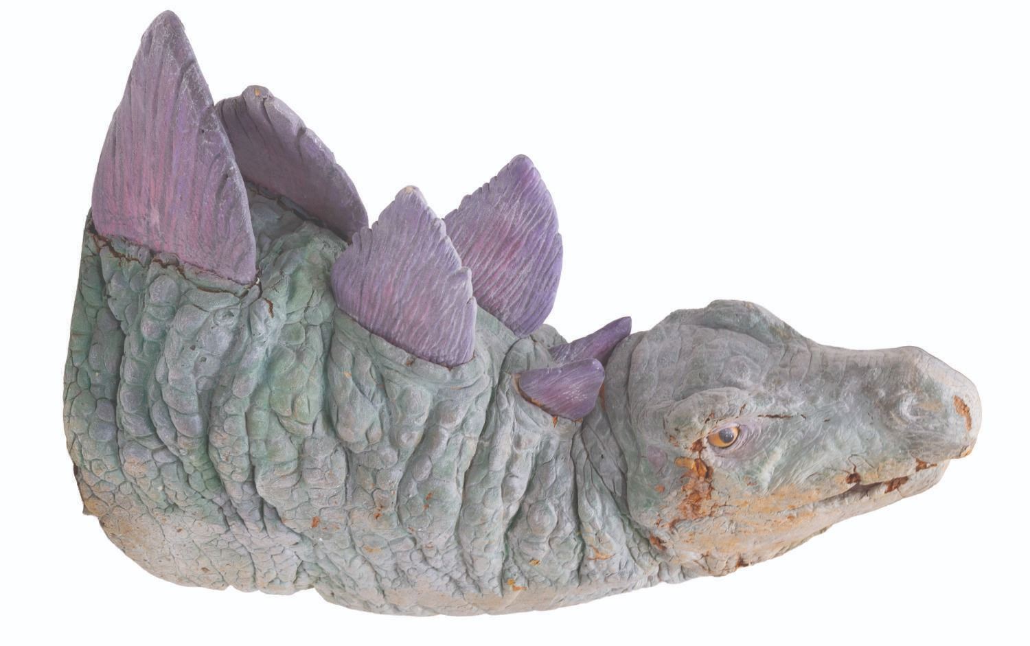 (ABC, 1991) A puppet head of the stegosaurus Spike from the 1991 Sid from Marty Krofft"Land of the Lost" television series. Built by the Chiodo Brothers, the hand-painted foam puppet contains mechanical servos to control movement that have not been tested for function. Measuring 12"x 19" x 24" Spike is in fair condition with foam loss and heavy deterioration, paint loss, soiling, and discoloration.