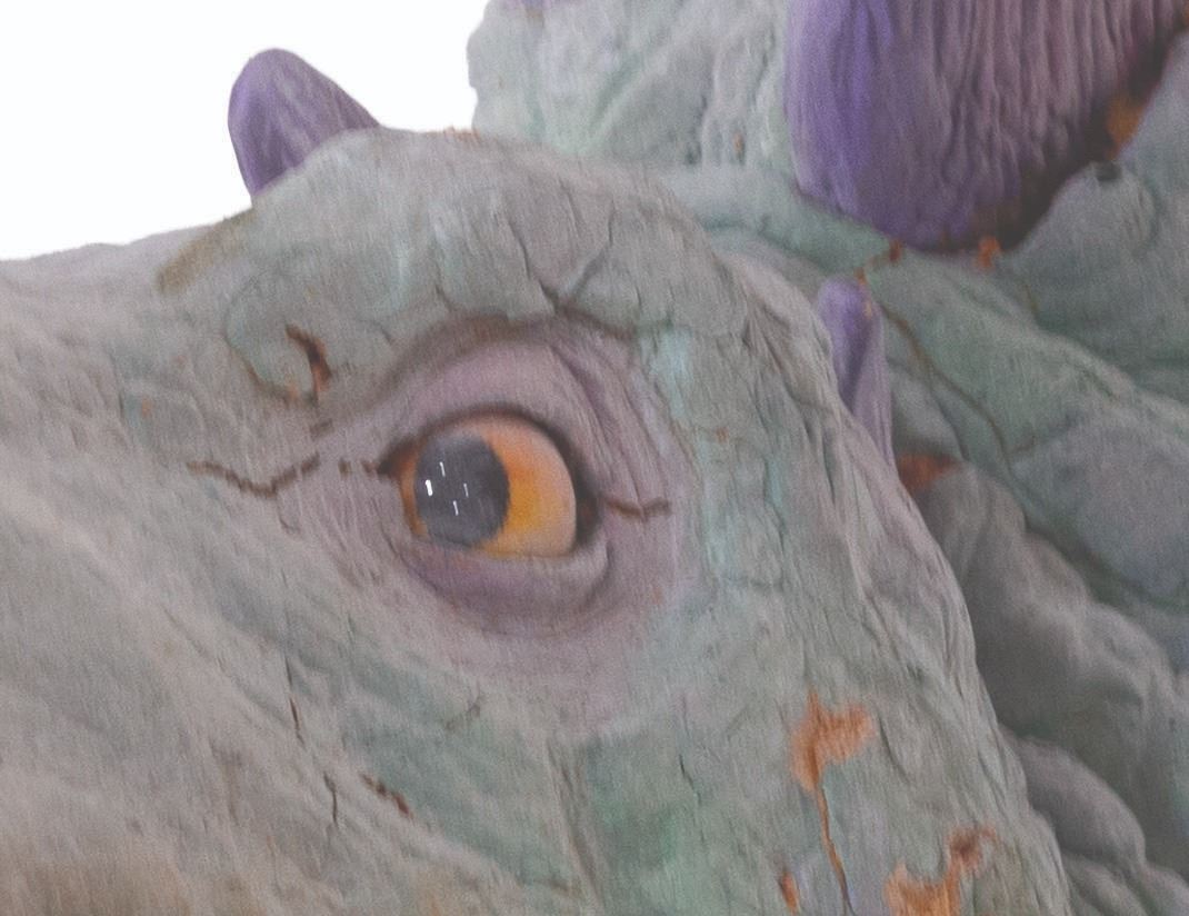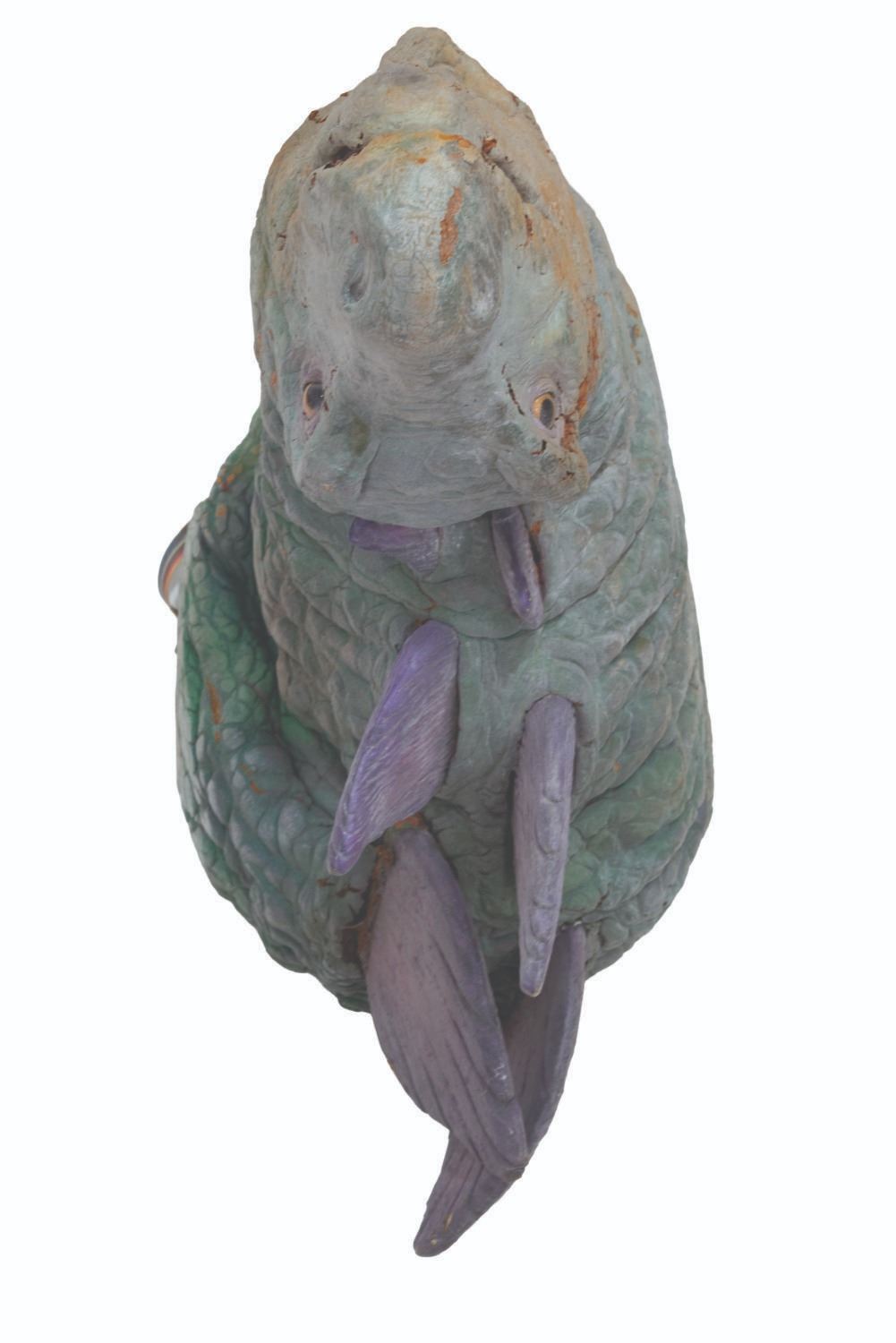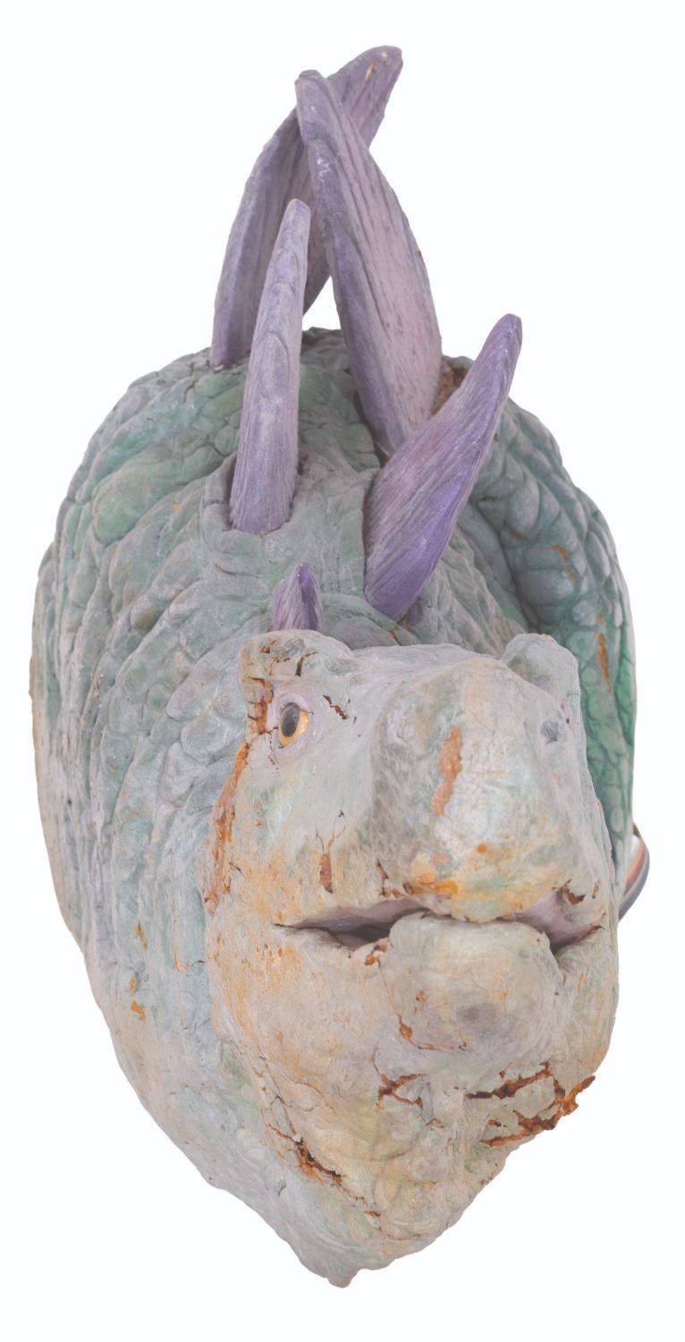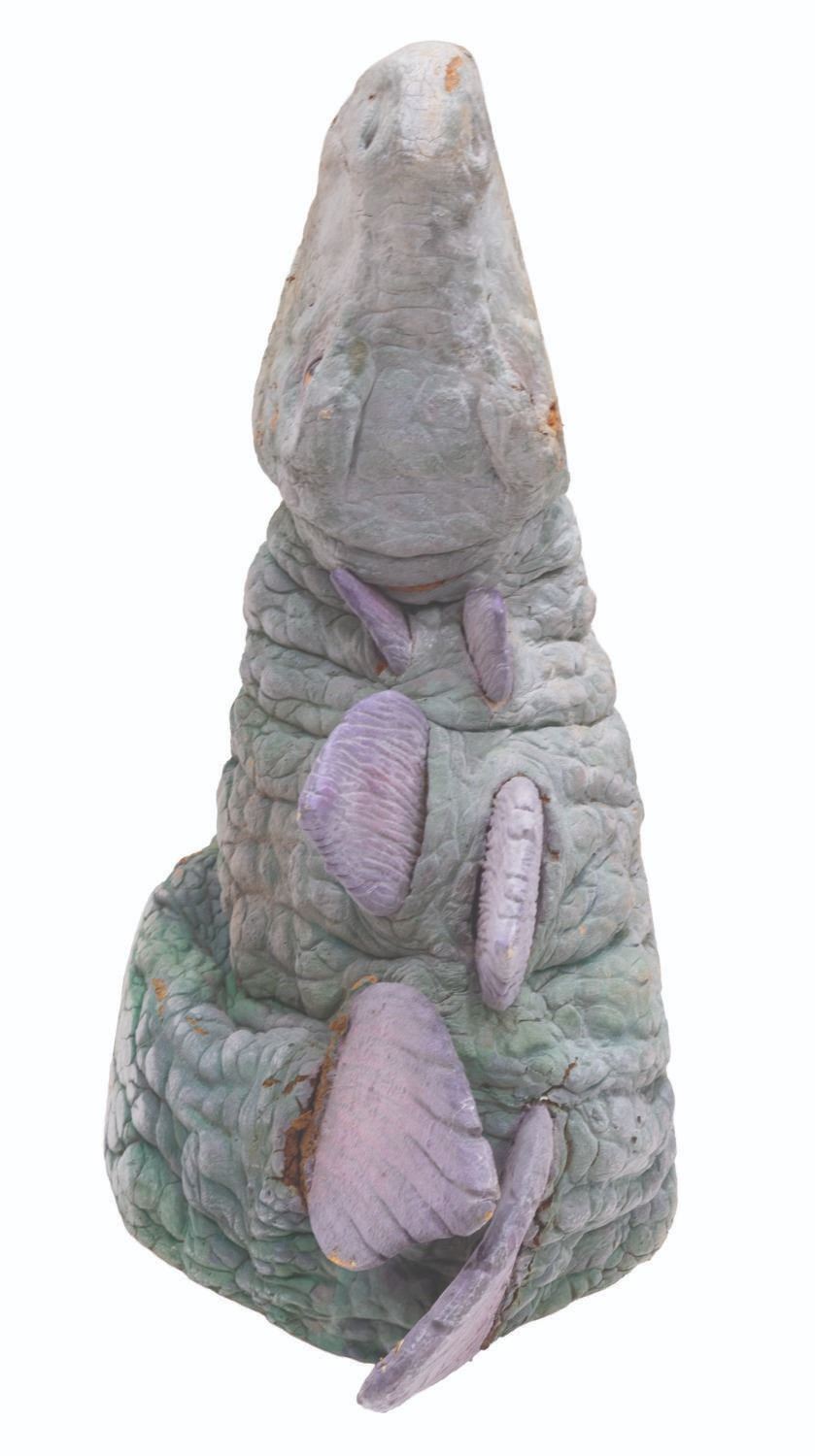 (ABC, 1991) A puppet head of the stegosaurus Spike from the 1991 Sid from Marty Krofft"Land of the Lost" television series. Built by the Chiodo Brothers, the hand-painted foam puppet contains mechanical servos to control movement that have not been tested for function. Measuring 12"x 19" x 24" Spike is in fair condition with foam loss and heavy deterioration, paint loss, soiling, and discoloration.