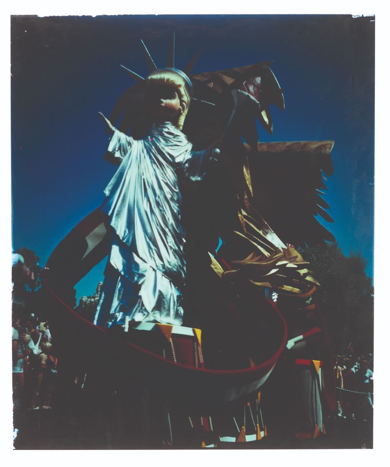 (Disneyland, 1975-76) A large photo transparency featuring the Statue of Liberty float from America on Parade. The parade ran from 1975 to 1976 at both Disneyland and Walt Disney World in celebration of America's Bicentennial. Measuring 20" x 24", the transparency is in good condition with spots of image loss, scuffing, soiling, and edge wear.