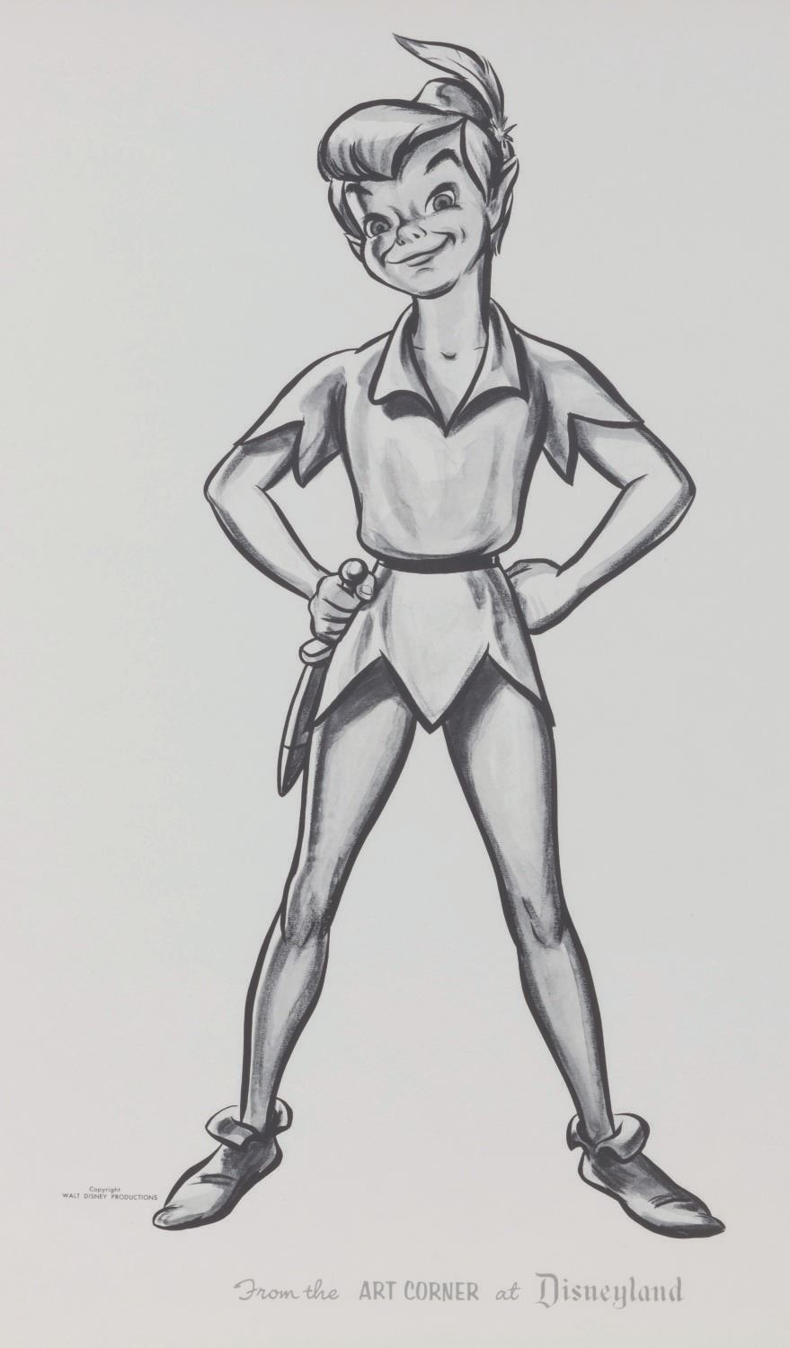 (Disneyland, 1960s) A large print of Peter Pan sold exclusively at the Art Corner in Disneyland. Peter has an image size of 8.75” x 18” on a 16.5” x 21.5” visible print. The entire framed piece measures 21.5” x 25.75” and is in fine condition.