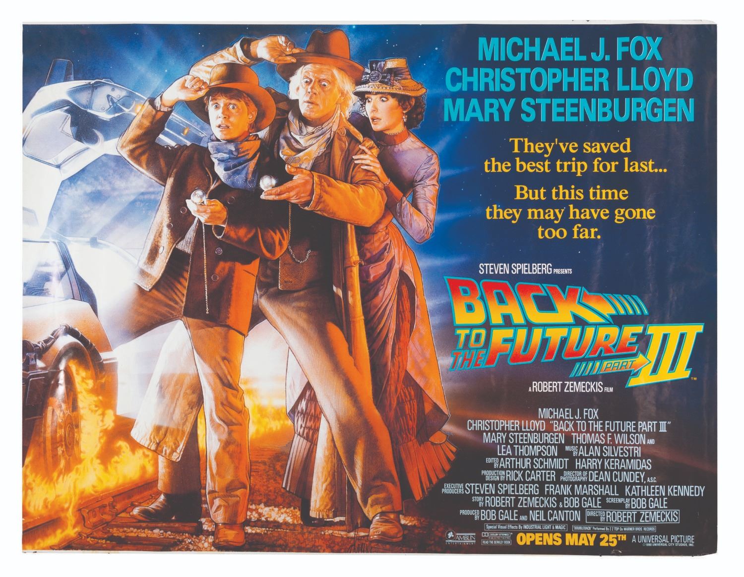 (Universal, 1990) A large subway poster for “Back to the Future Part III,” the final film in the blockbuster franchise. Measuring 46” x 60”, the poster displays in very good condition with edge wear and tears, spots of discoloration, creases, a 1.25” hole near the bottom right, and light water damage.